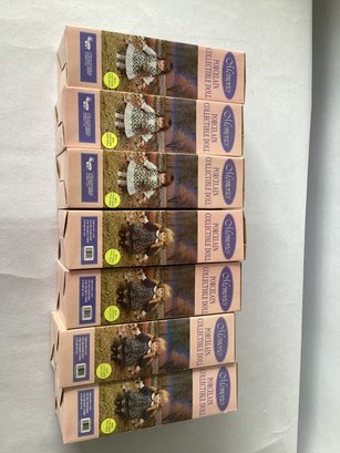 Cuddle Wit Memories Porcelain Collectible Dolls - 4 Blonde with blue flower pattern clothing, 3 Brunette with green & white pattern clothing - these are as found, boxes show some wear