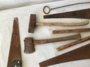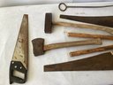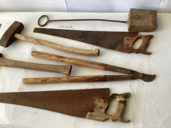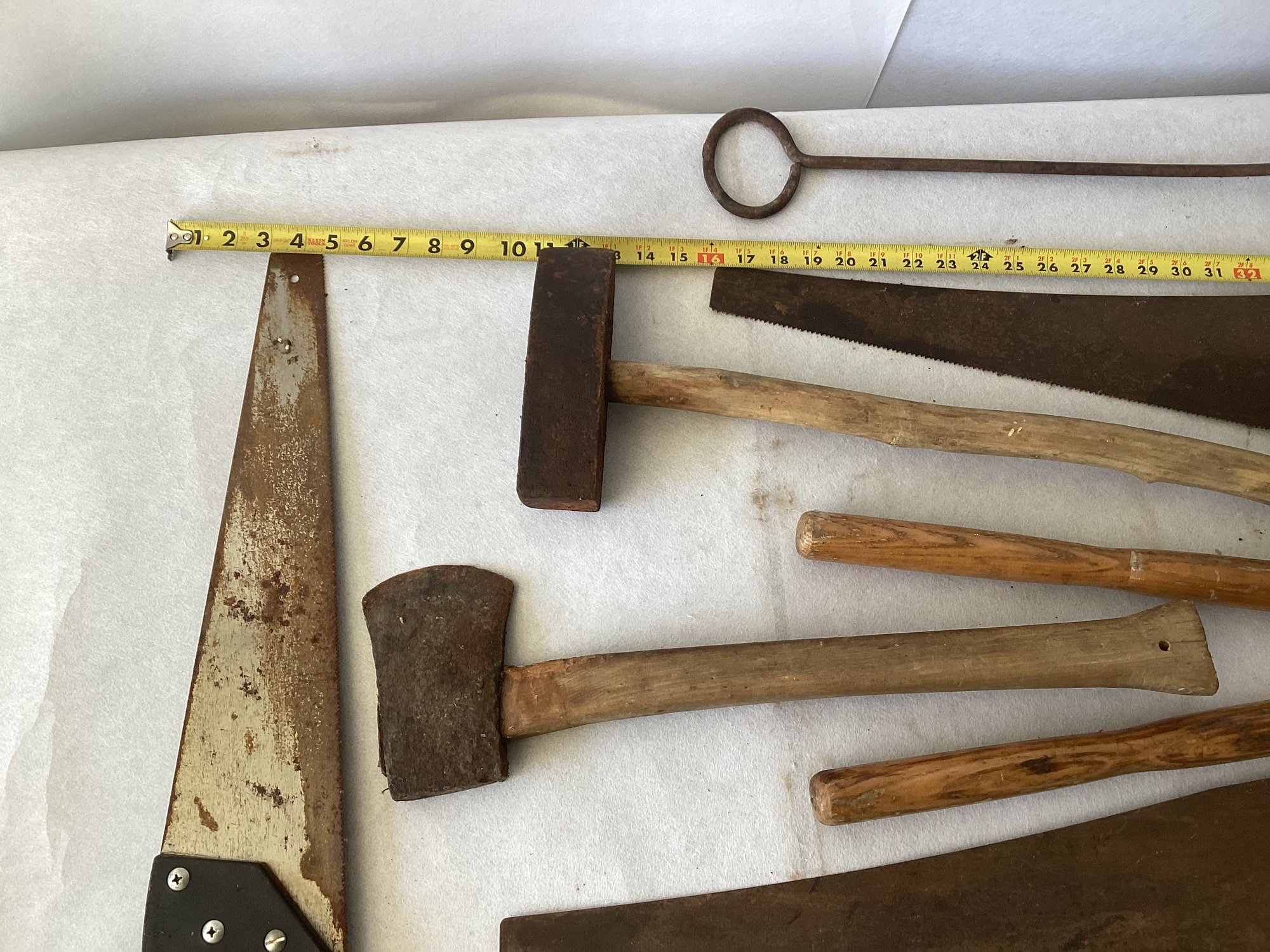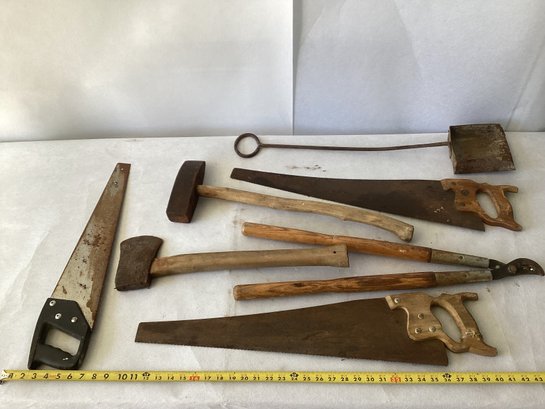 Tool Lot - Saws, Axe, Sledge Hammer, Scoop, Snips