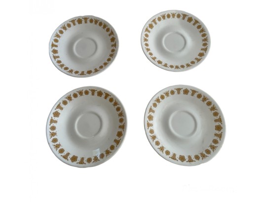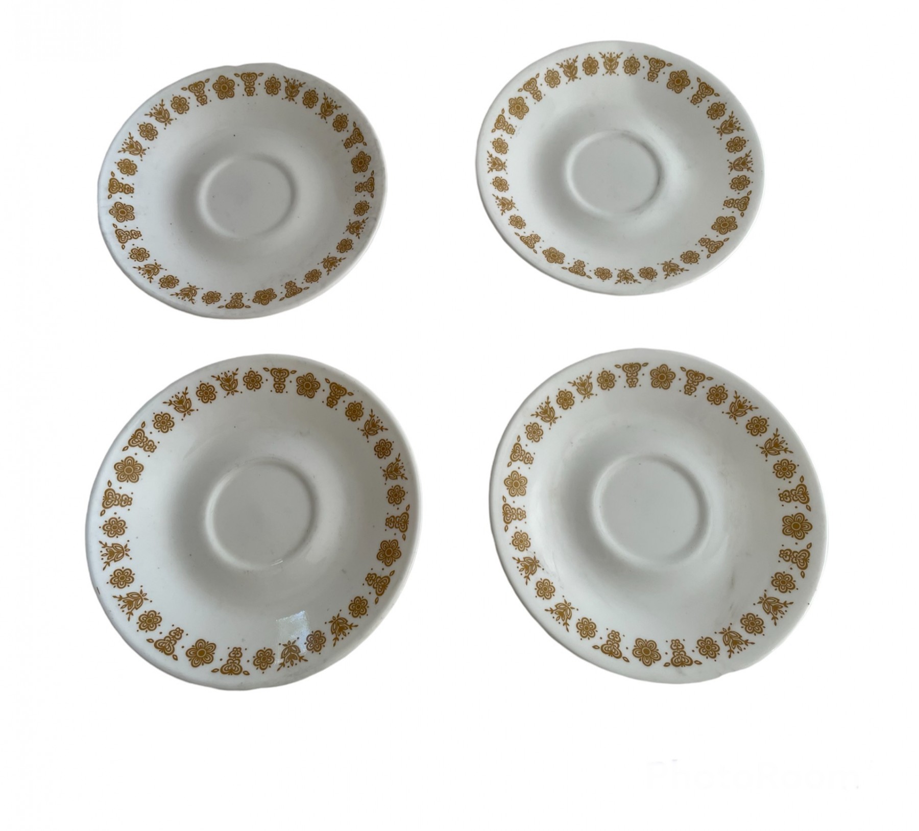Nice set of 4 saucers for the Corelle Butterfly Gold series from Corning. Generally durable dishes. Good used condition.