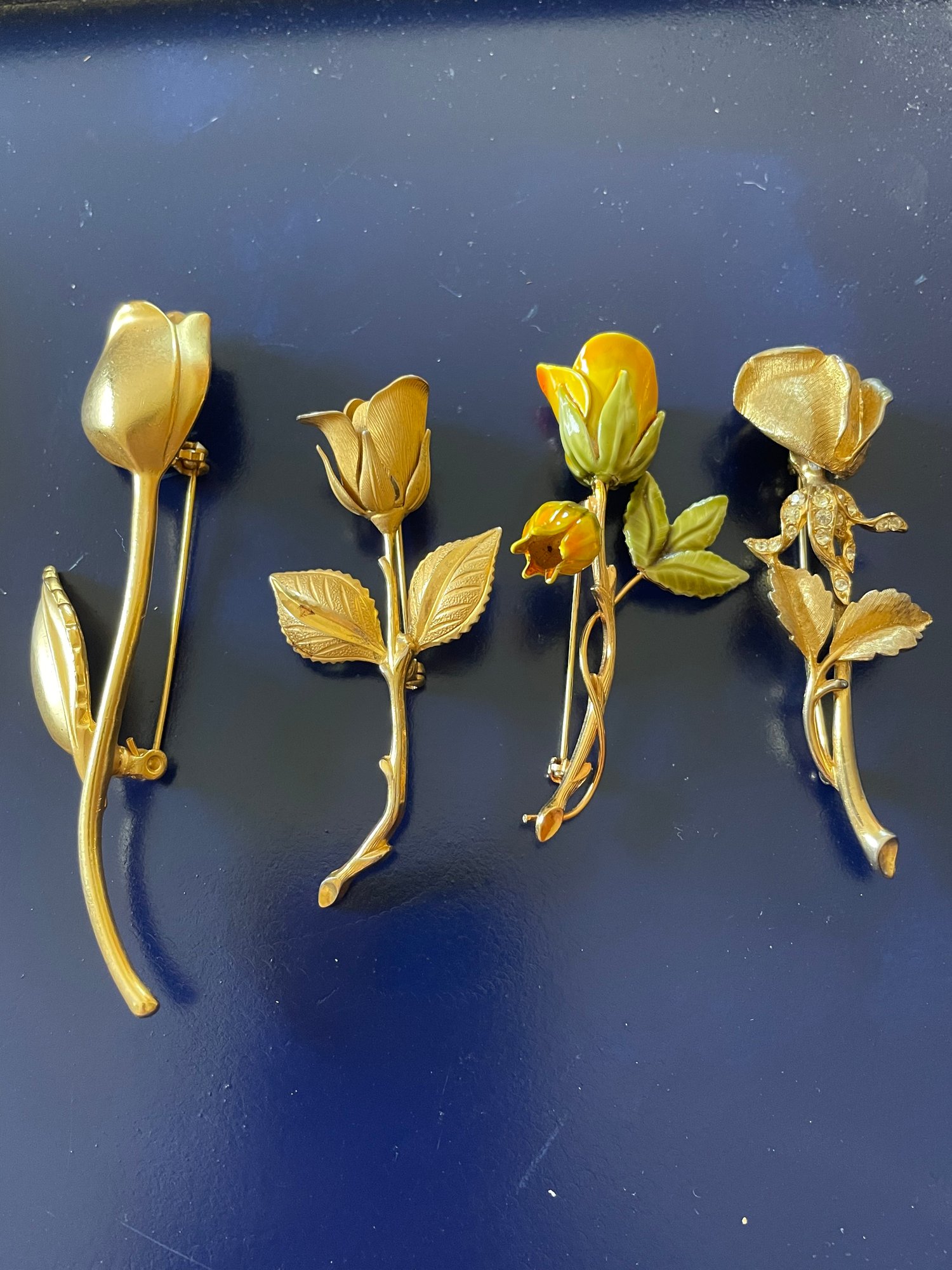 Mixed lot of vintage brooches featuring flowers, specifically roses. Variety of styles. These aren’t marked but seem very similar to marked pieces we have found.
