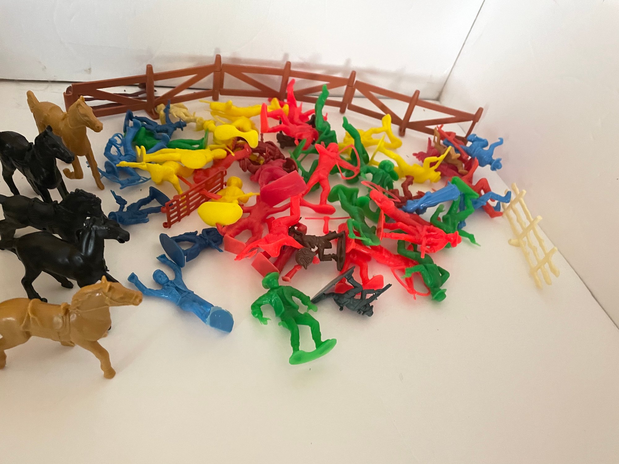 Assorted molded plastic cowboys / horses. Some bright colors, some more muted. Includes fence pieces.