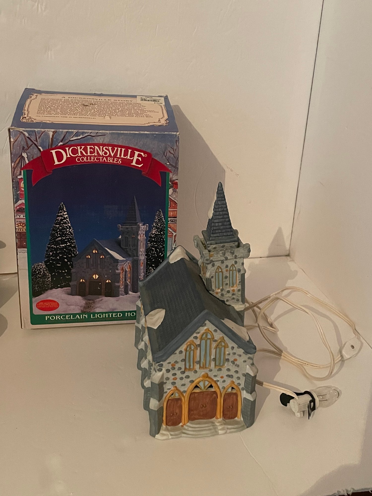 Nice Dickensville ceramic church with light. Includes box, but it’s pretty rough.