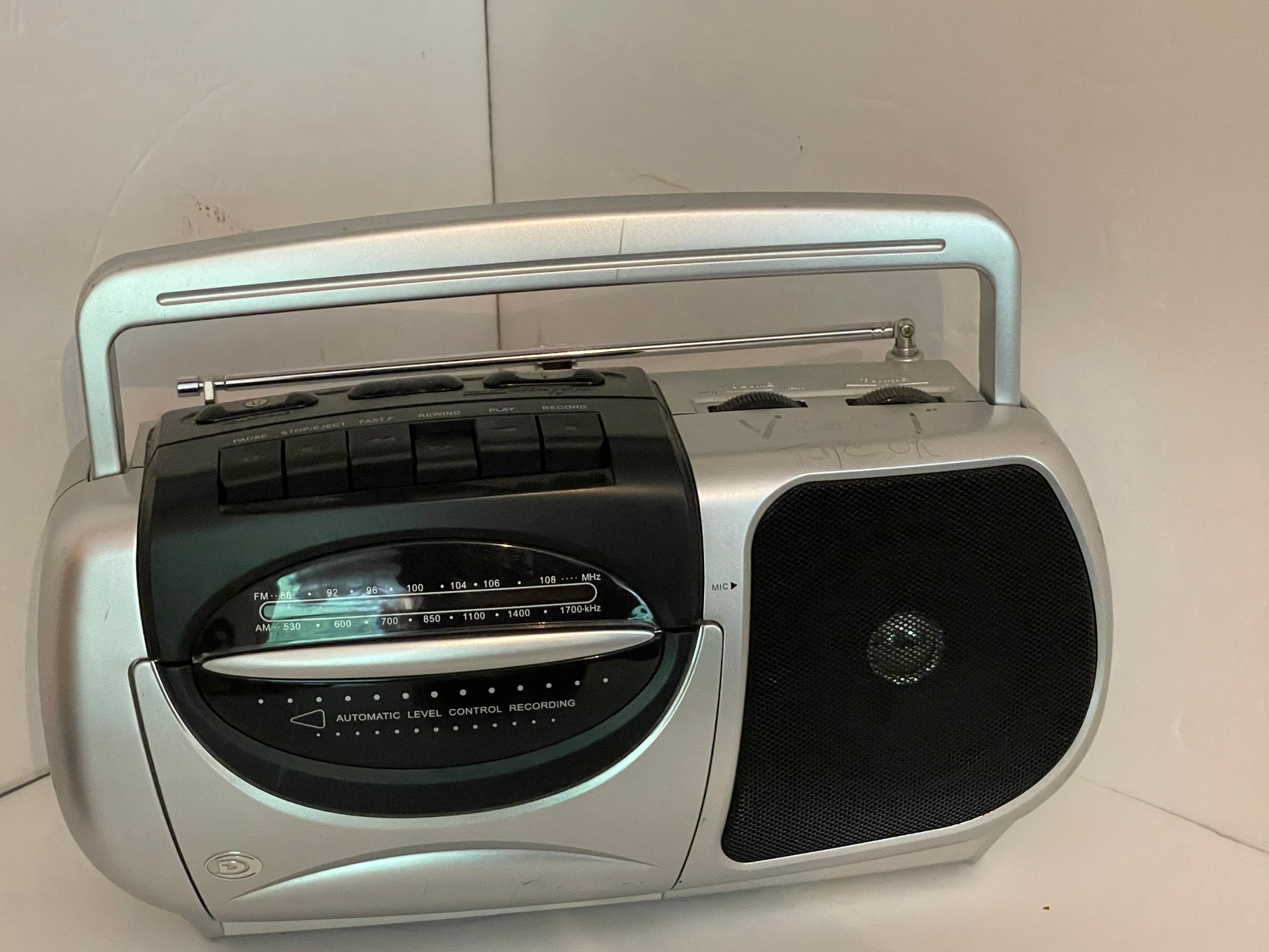 Small cassette player radio. Takes D batteries or plug. Untested but prior owner marked it working and it appears clean. Markings may scrub off.
