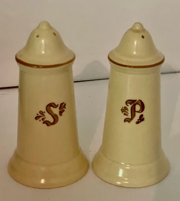 Nice salt & pepper set in the Pfaltzgraff Village pattern. Slight difference in the tone of color / darkeness. One is missing the plug on bottom.