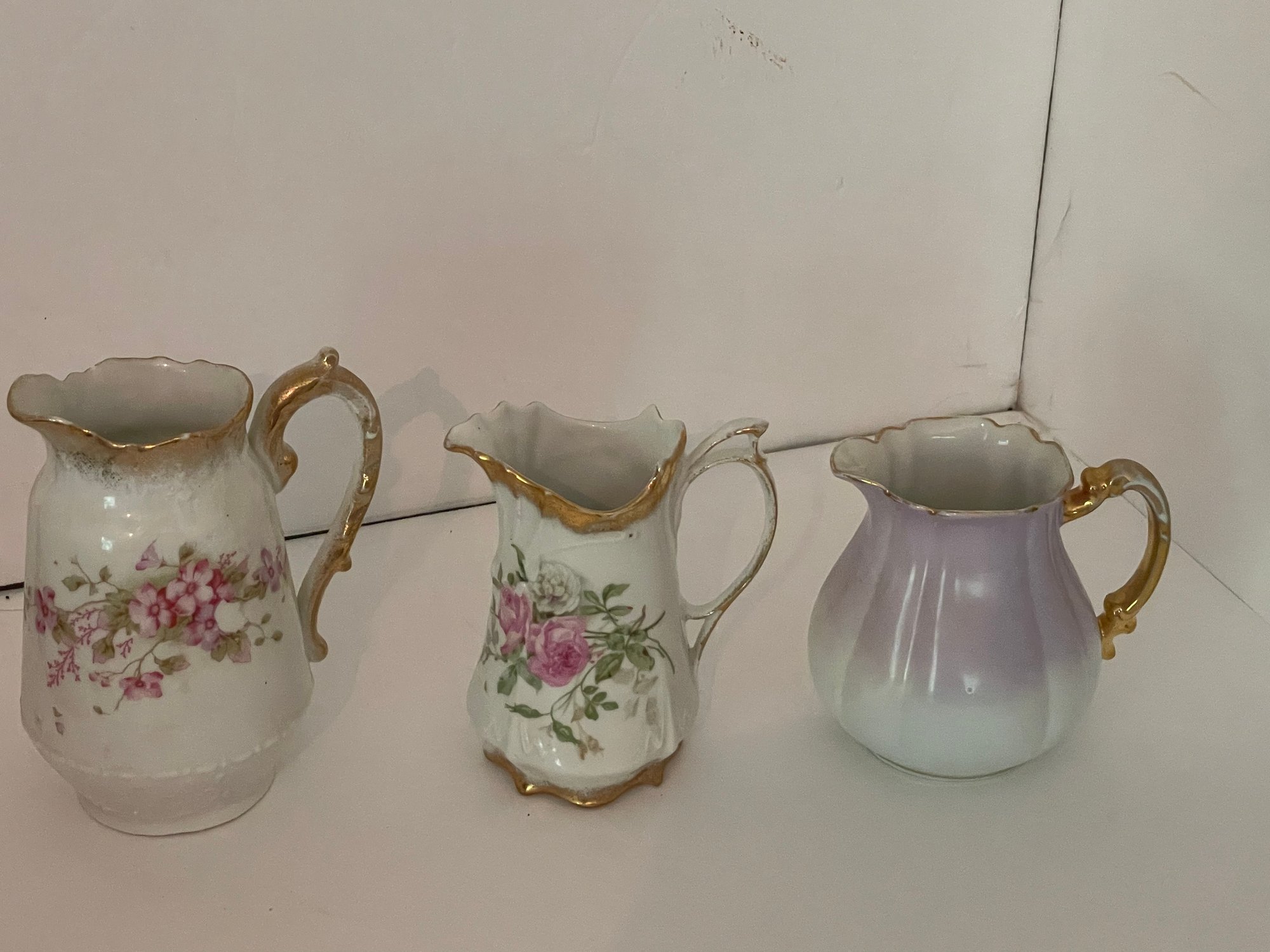 Pitchers or creamers for 3 different patterns. One has mark on bottom, others are unmarked.
