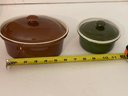 Nice pair of two different round individual baking dishes with lids. Brown slightly larger. Brown has what looks like a crack forming, unknown if it would impact use.