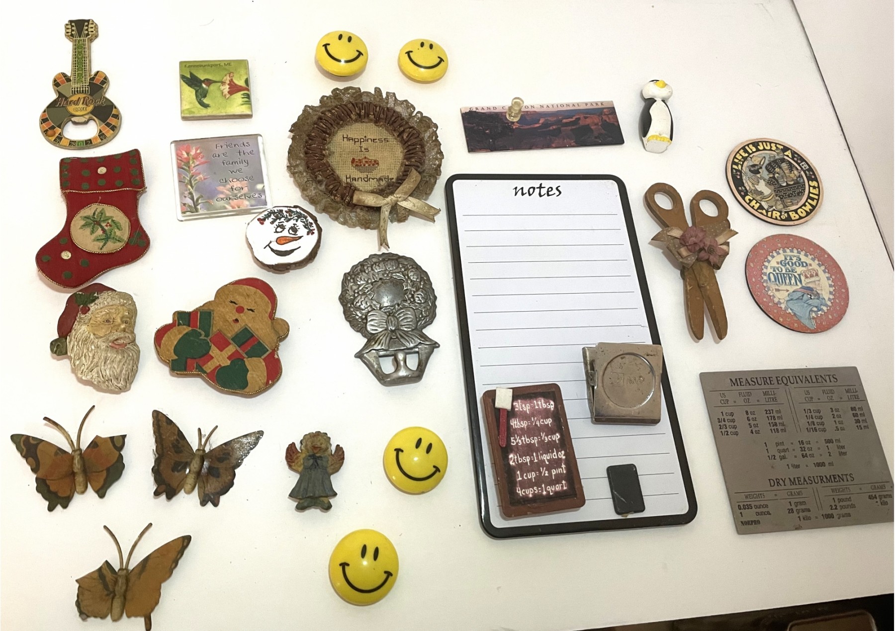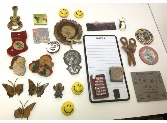 Fun lot of decorative fridge magnets. Some holiday, smile face, fragile butterflies, cooking help, grocery list.