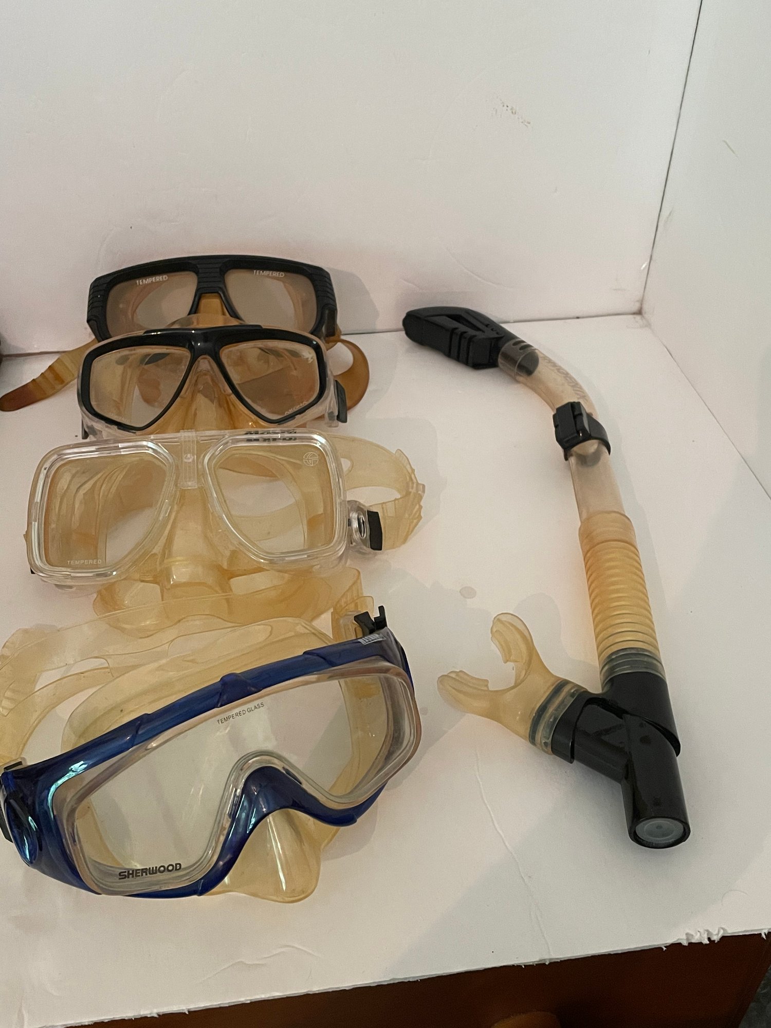 Collection of various models and sizes for dive masks, plus a snorkel. These were all used as training, sample etc for a store that closed 14 years ago. Obviously discolored, new straps would help. The masks themselves are still nice and have lots of life left.