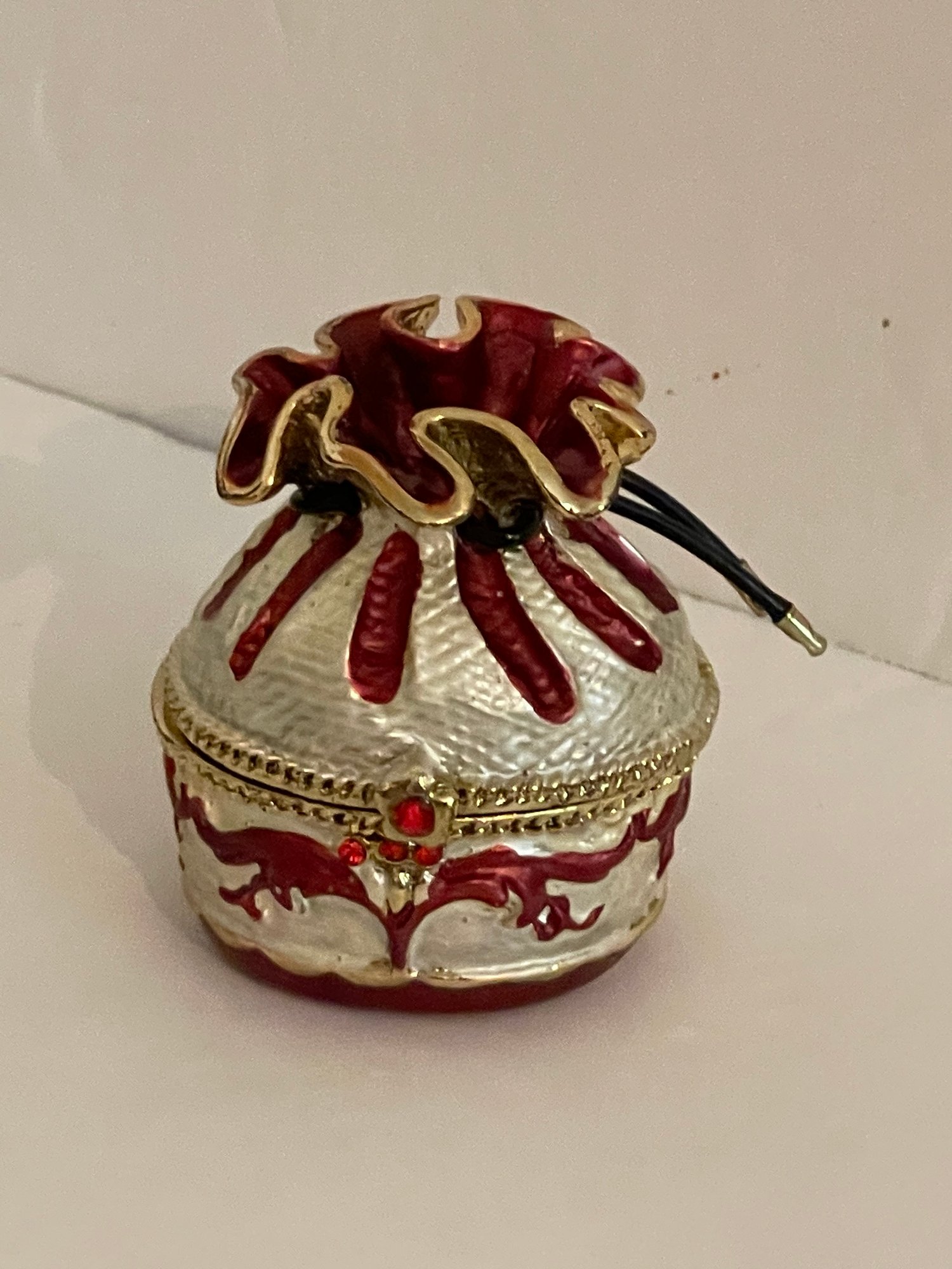 This is a nice small enamel metal trinket box in the style of a fabric bag / pouch. Hinged with magnetic close.