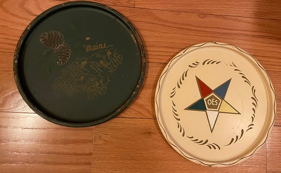 Two round metal trays, one marked Nasco. Star for the Free Masons Order of the Eastern Star.