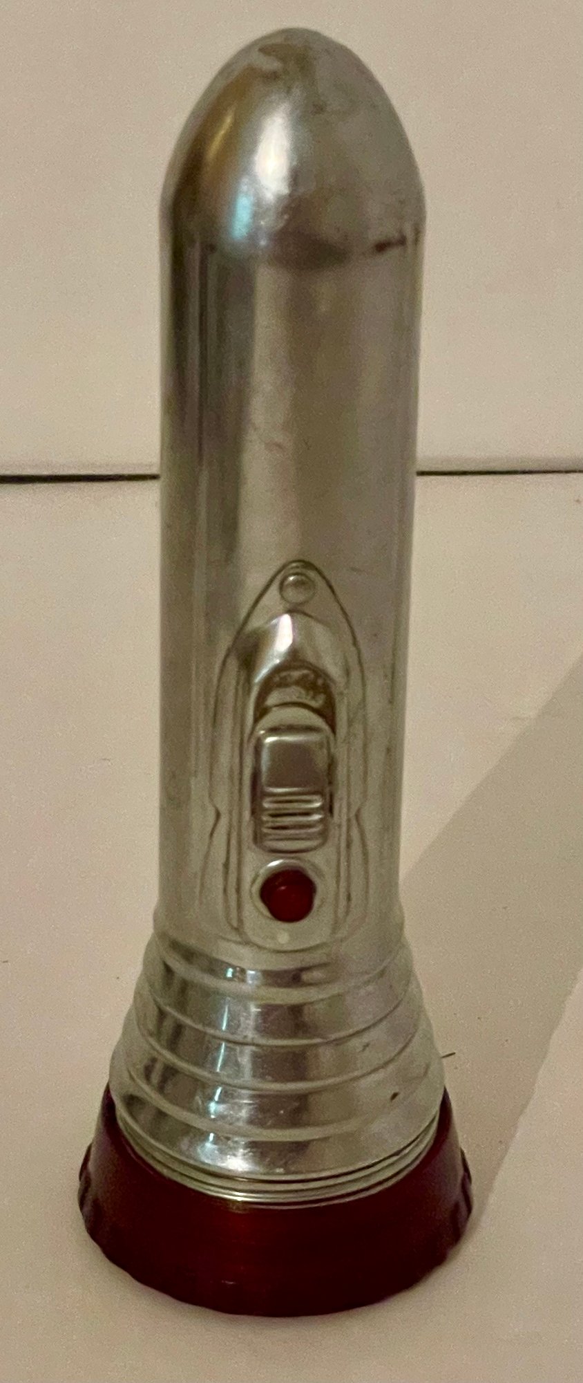 Nice vintage bullet style flashlight. Chrome color with red highlights. I am not seeing any marking. Untested.