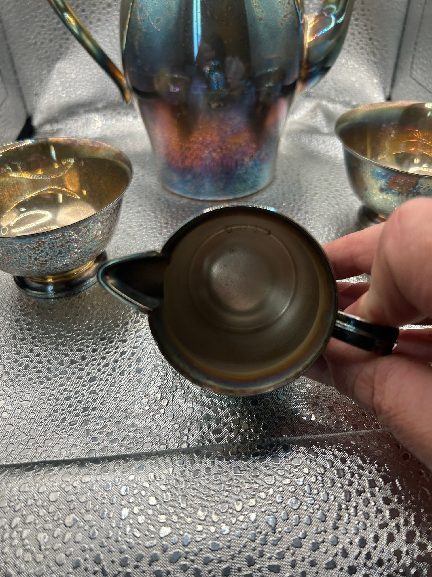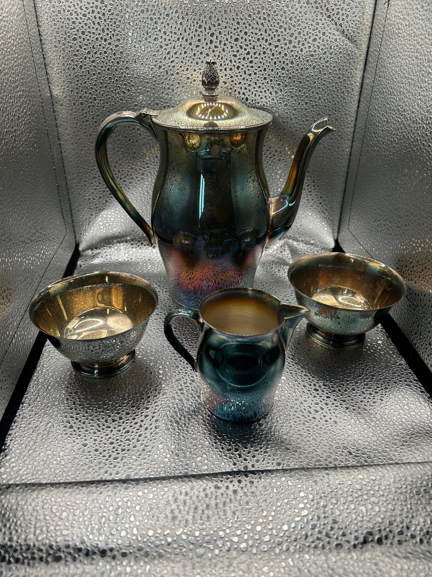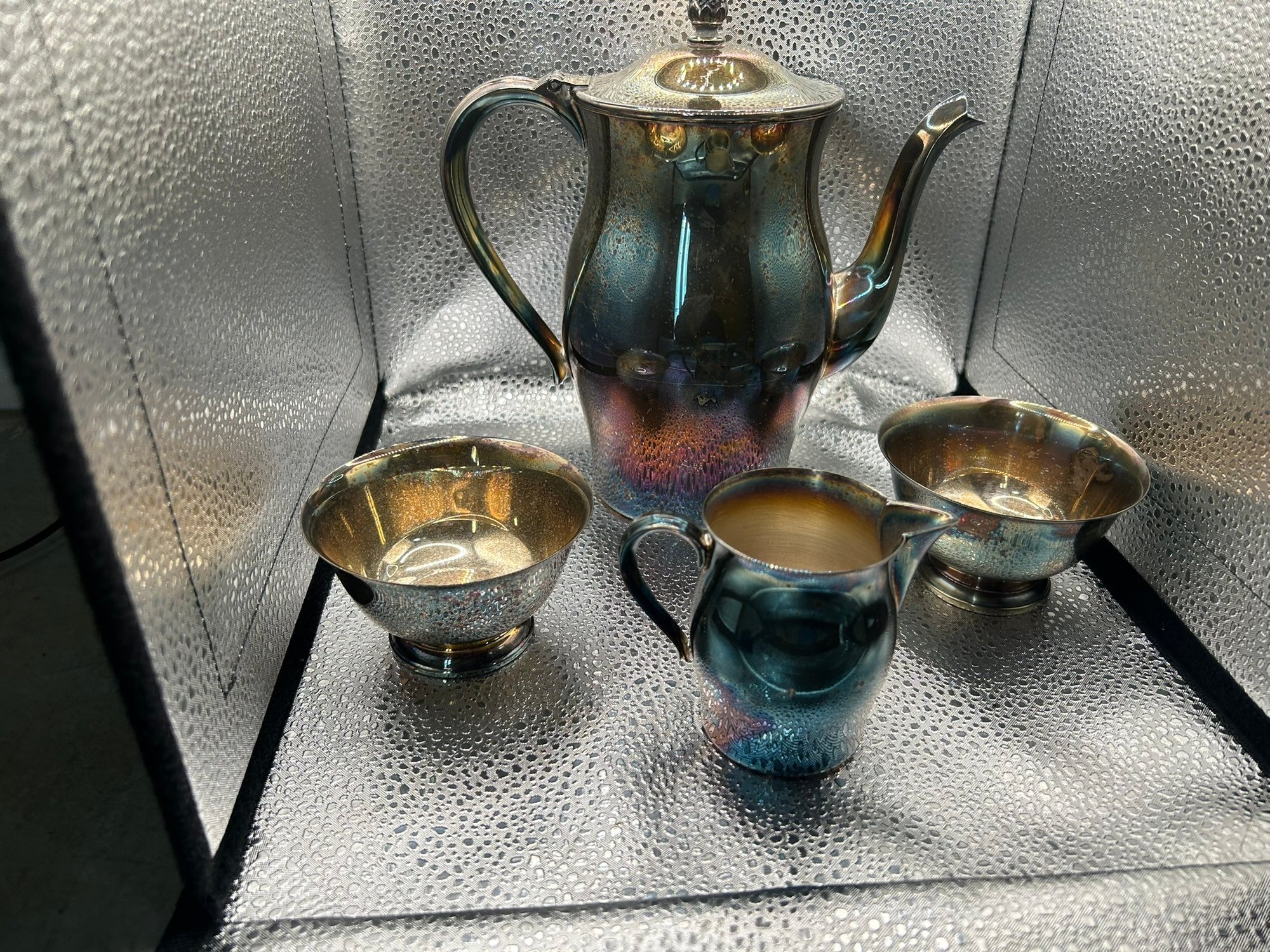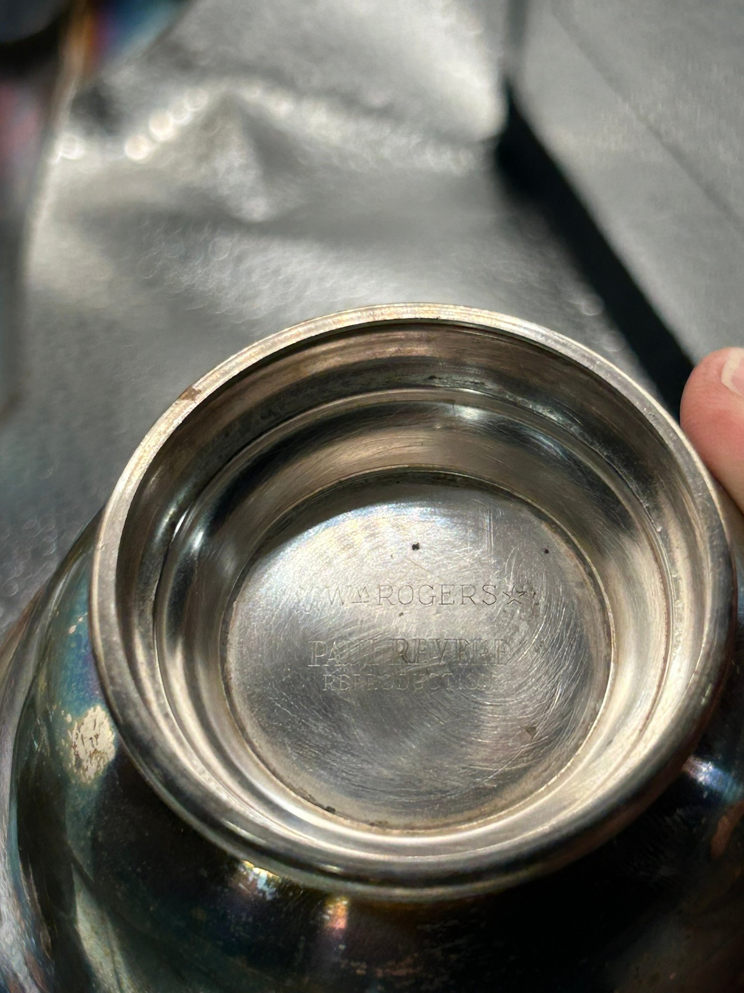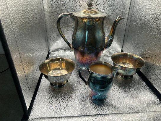 4 Paul Revere reproduction silver plate items. Coffee pot, 2 bowls and creamer. . Condition is good, but multi item lot so condition varies by item. Please see pics to evaluate each item. All items sold as is.