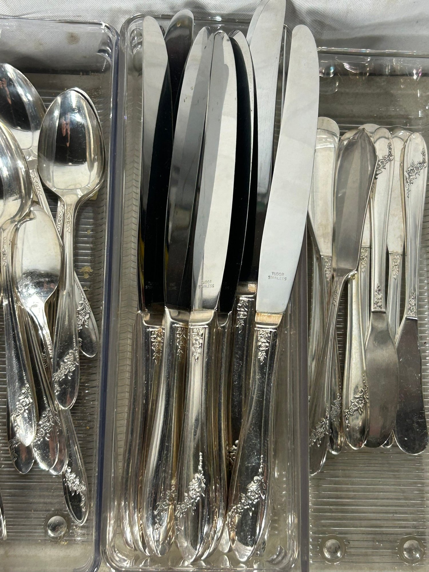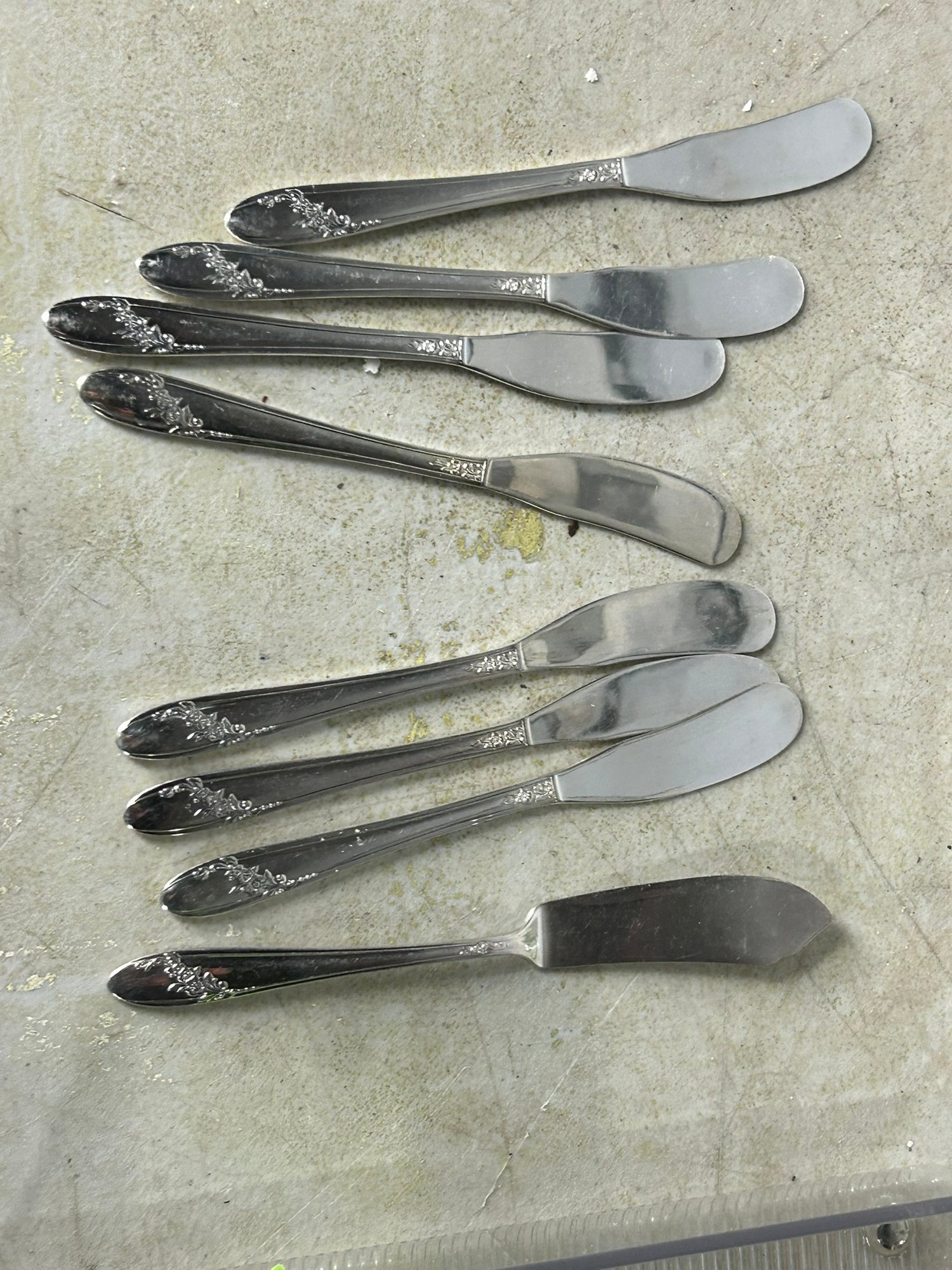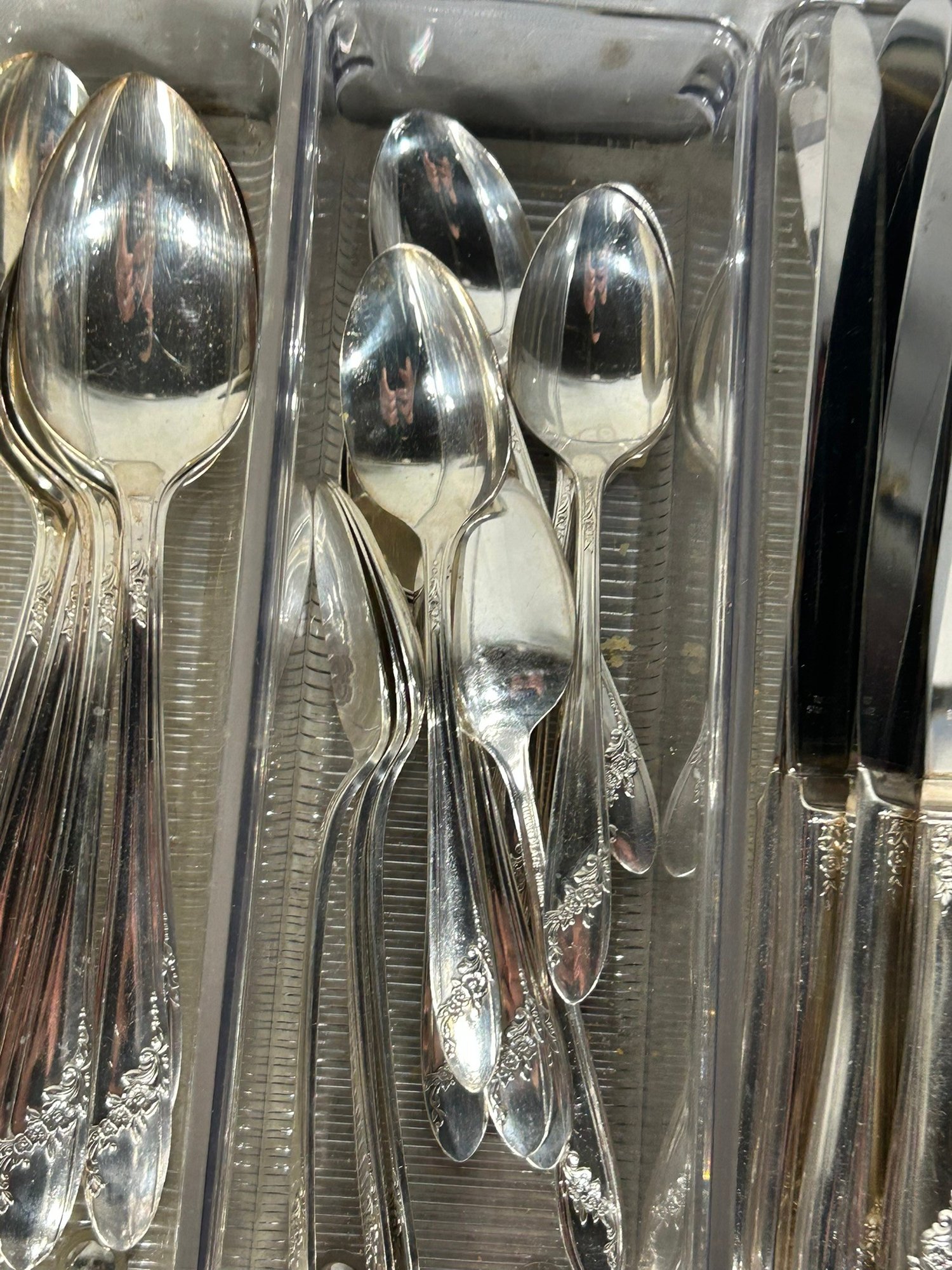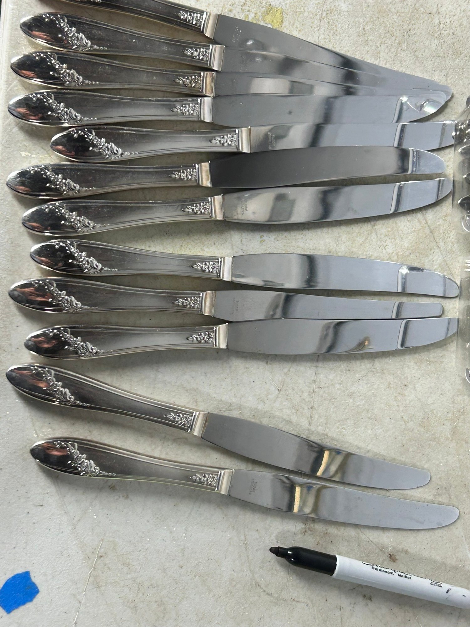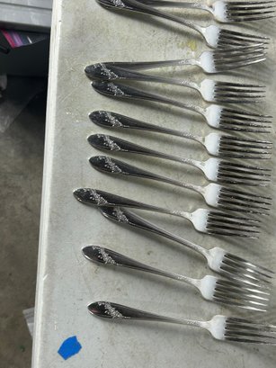 11 knifes, 7+1 butter knifes, 7 spons, 11 spoons, 12 forks, 6 forks, 12 spoons .Condition is good, but multi item lot so condition varies by item. Please see pics to evaluate each item. All items sold as is.
