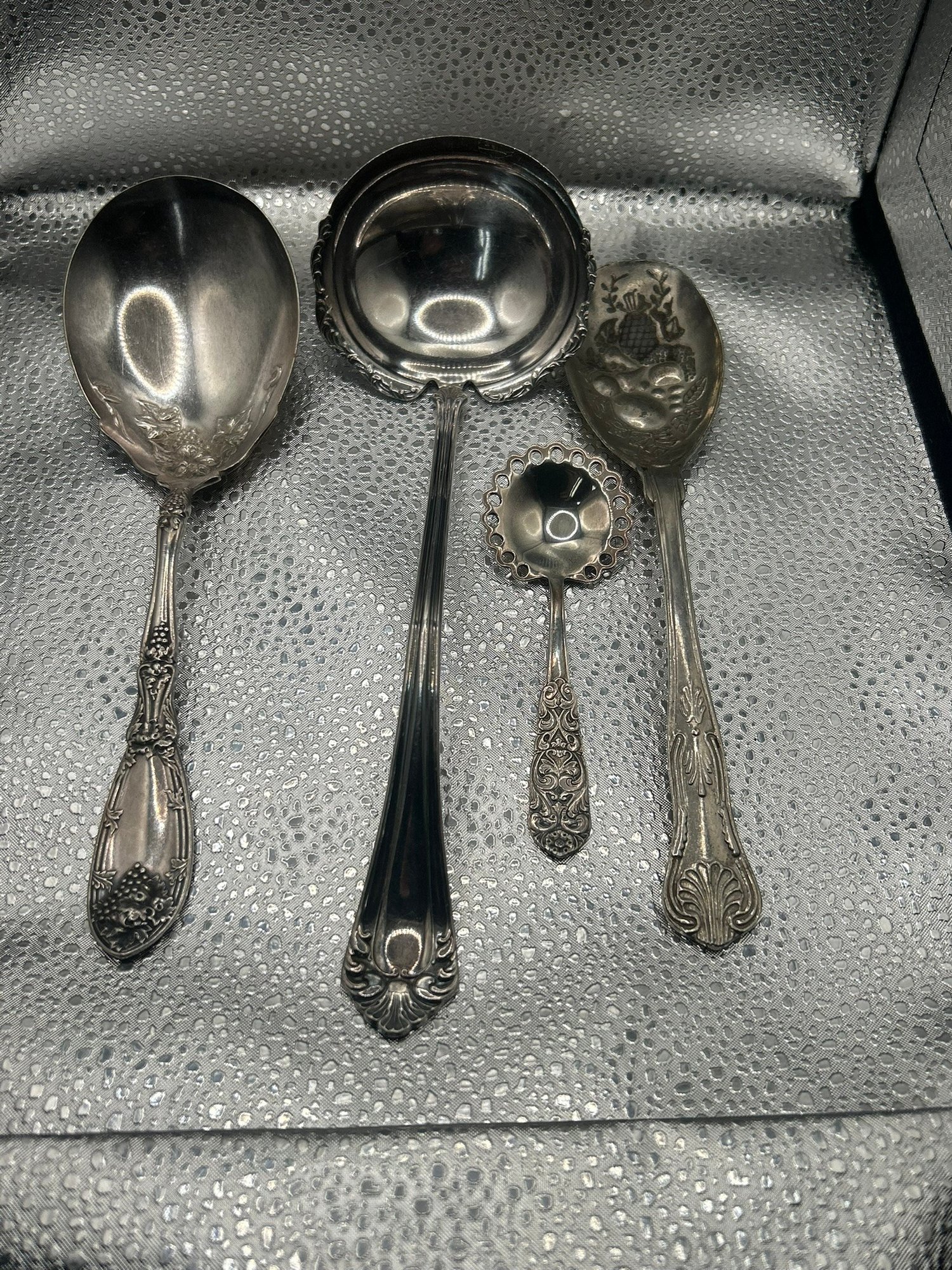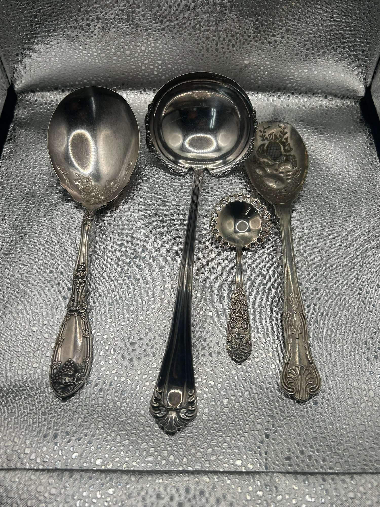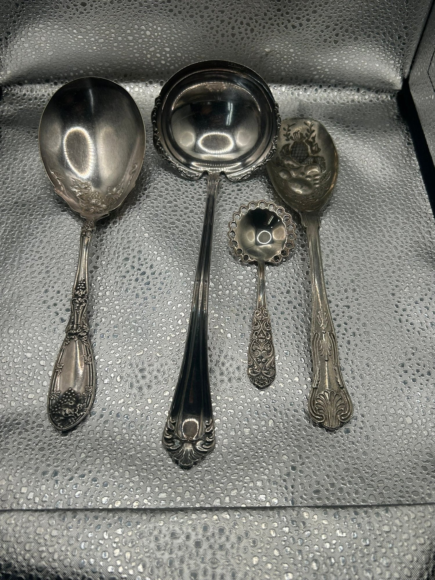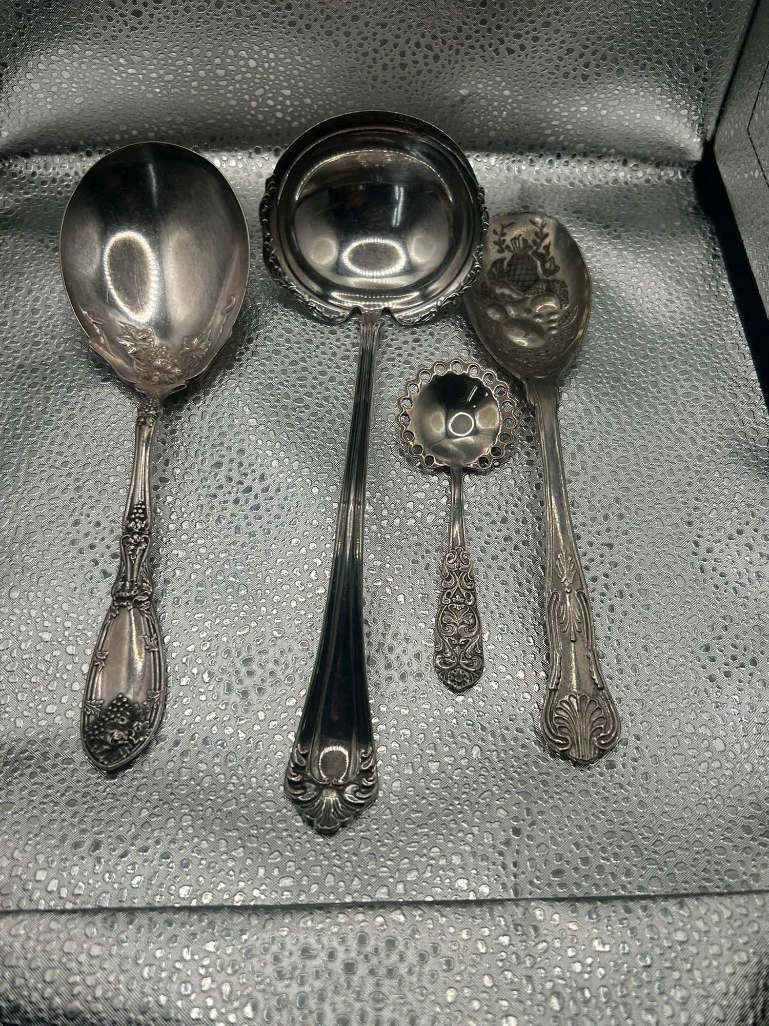 lot of 4 vintage silver-plated serving spoons, patterns lie Reed & Barton's "French Renaissance" or Wallace's "Sir Christopher". . . Condition is good, but multi item lot so condition varies by item. Please see pics to evaluate each item. All items sold as is.