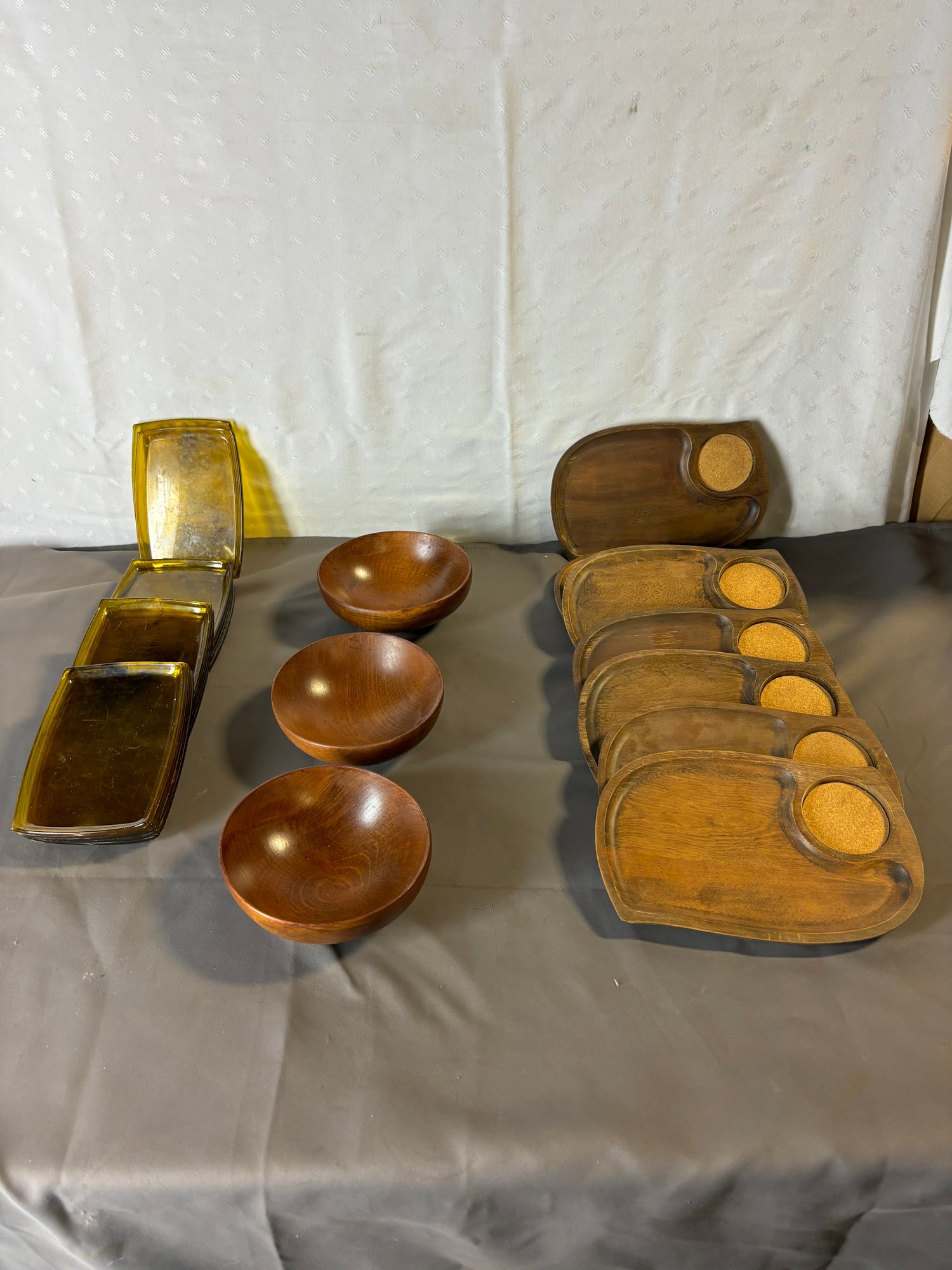 There are 14 plastic green tint color, 3 solid would bowls stamped as shown and 7 appetizer size trays.