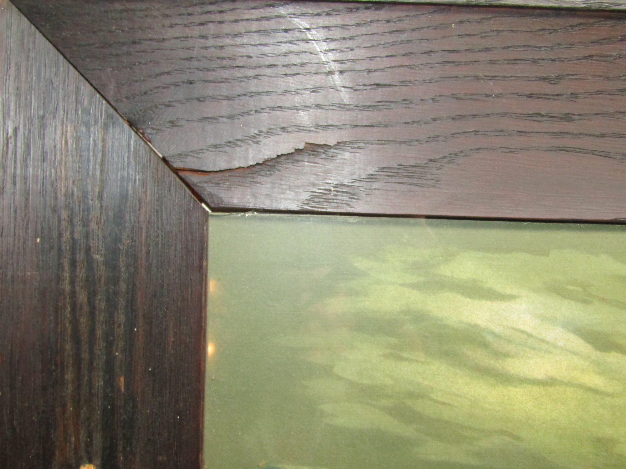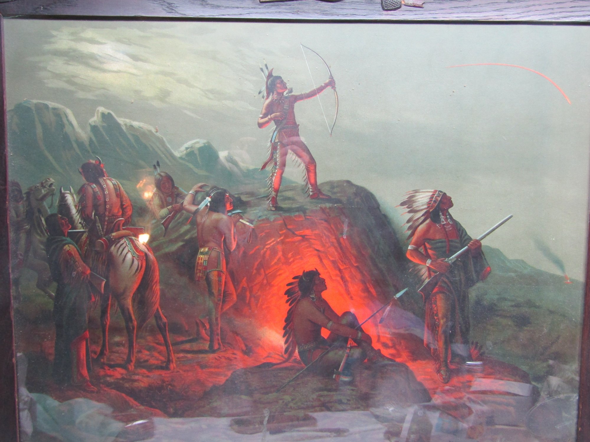 Indian scene titled "The Burning Arrow" in the original oak carved frame