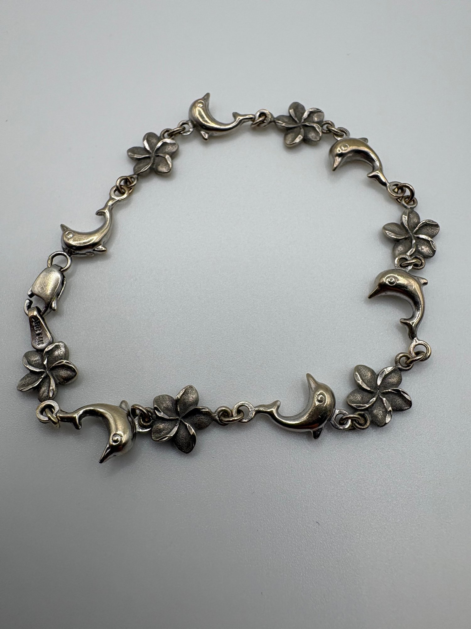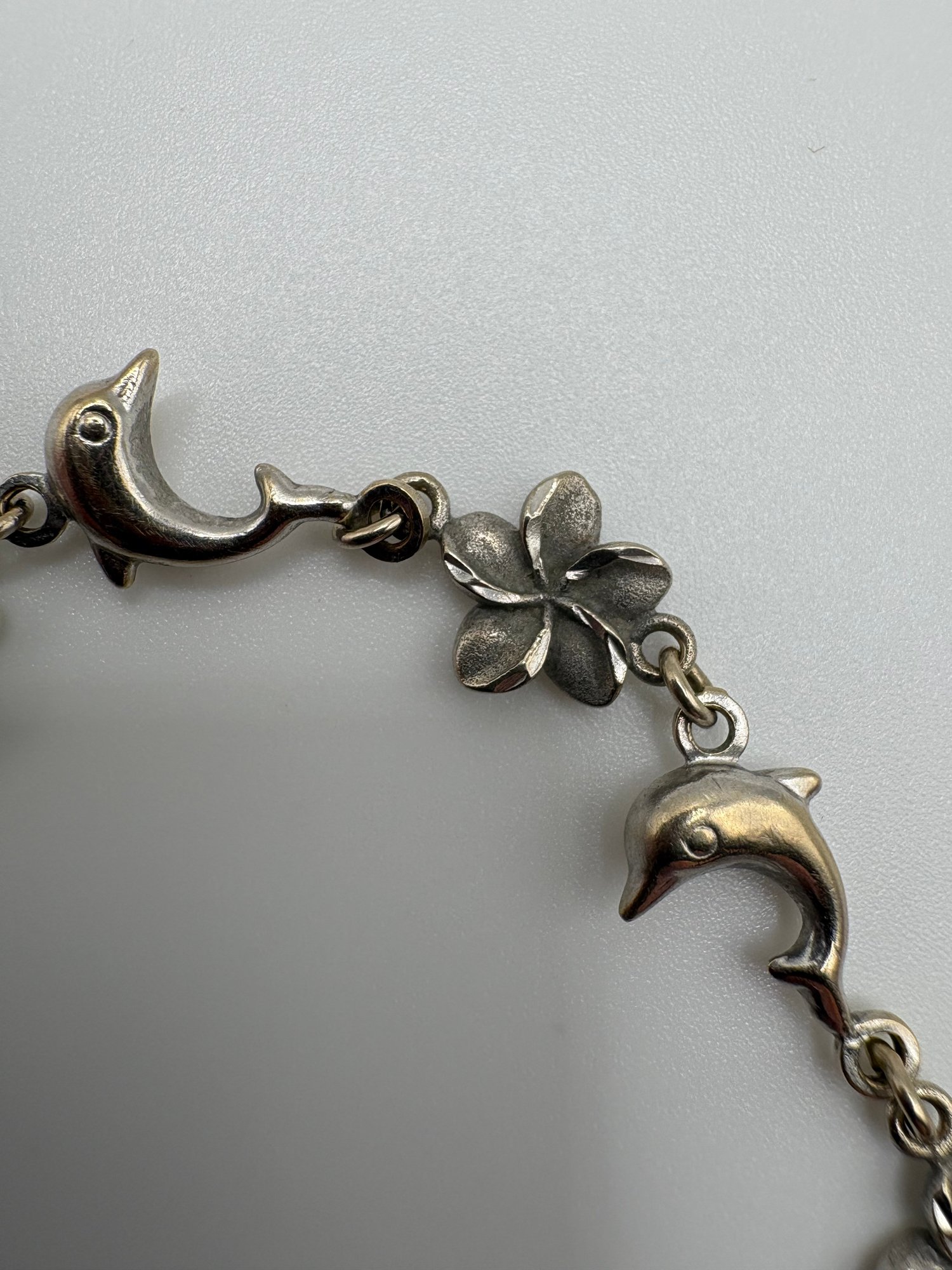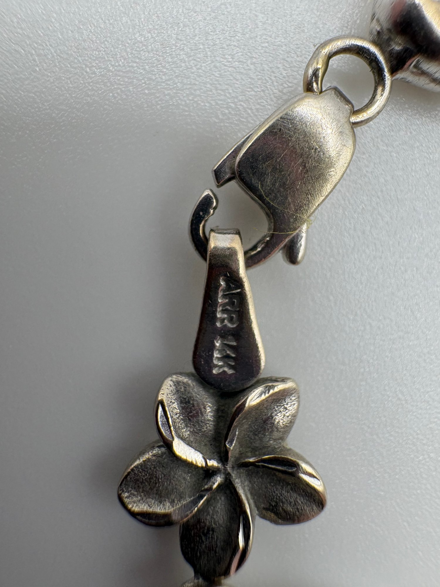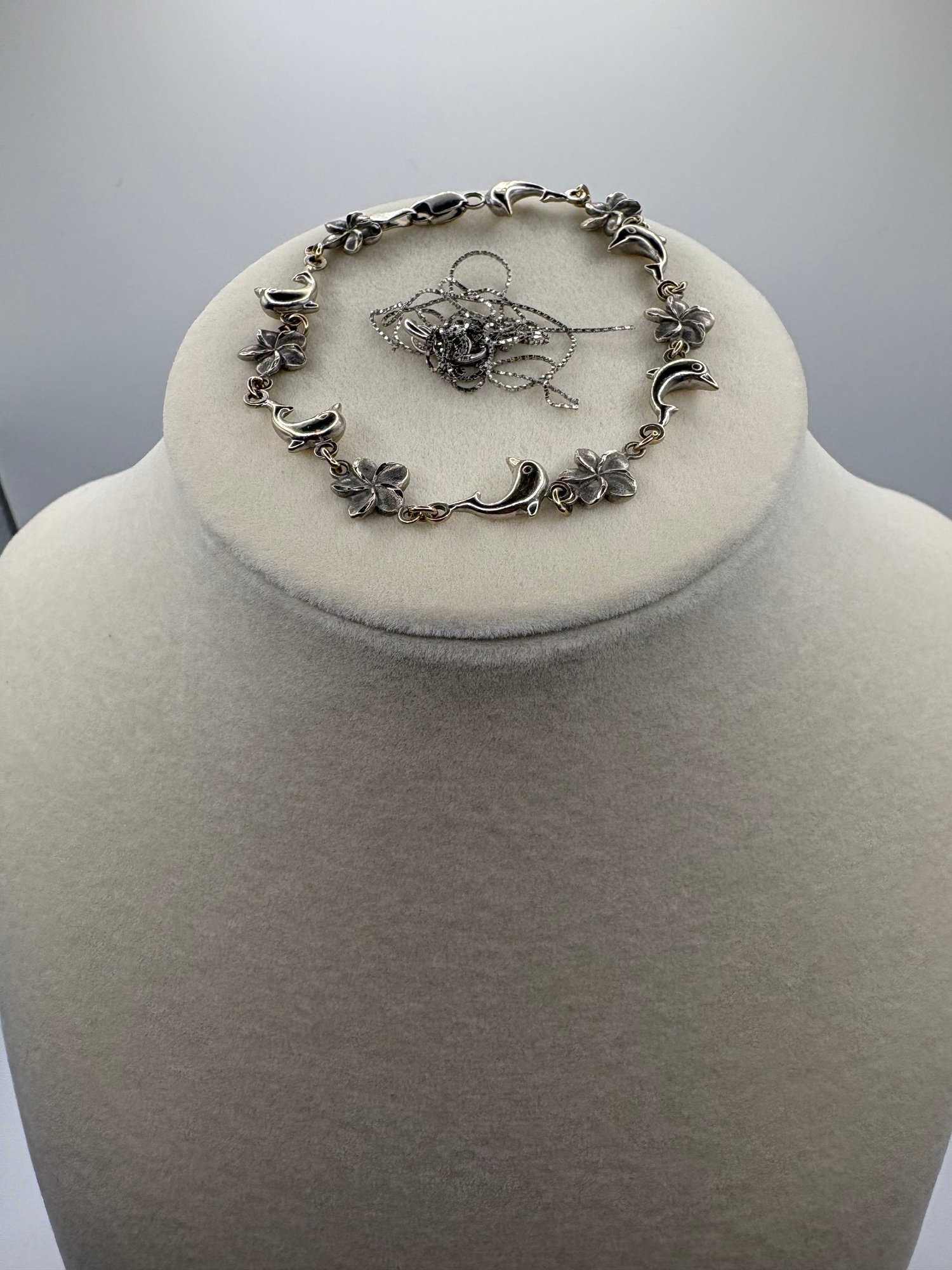 Both 14k. Necklace is broken bracket has dolphins and flowers in tact. Made in turkey.