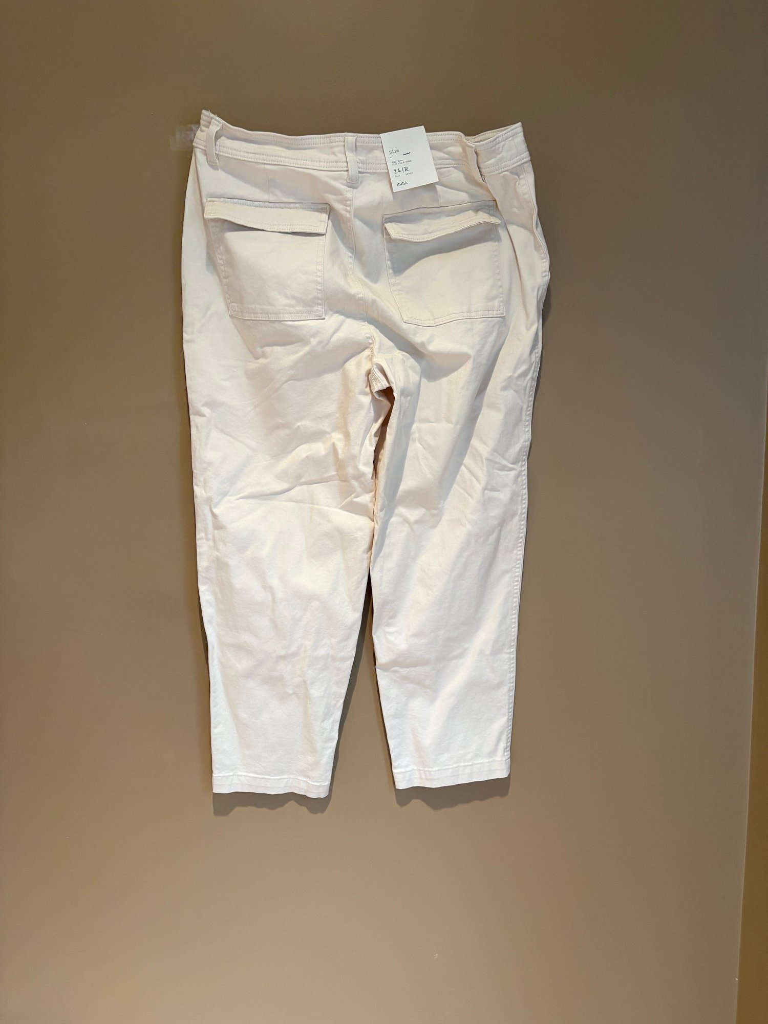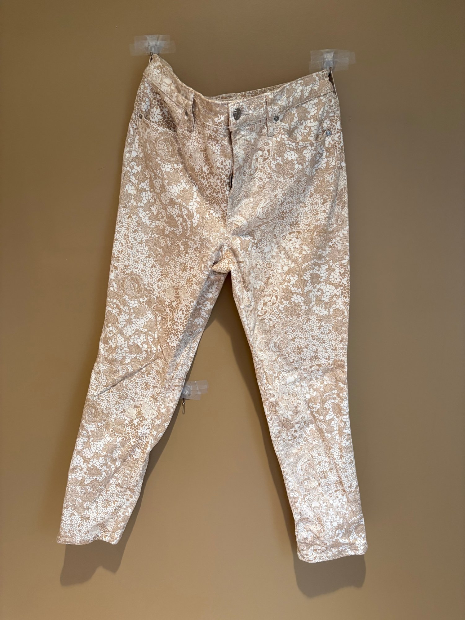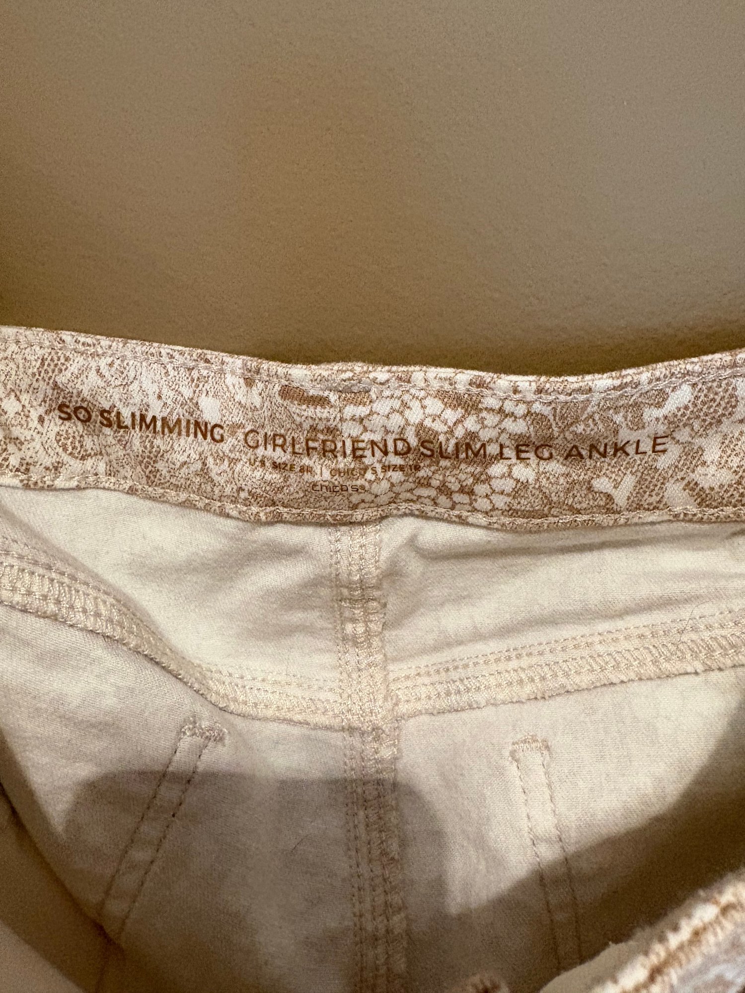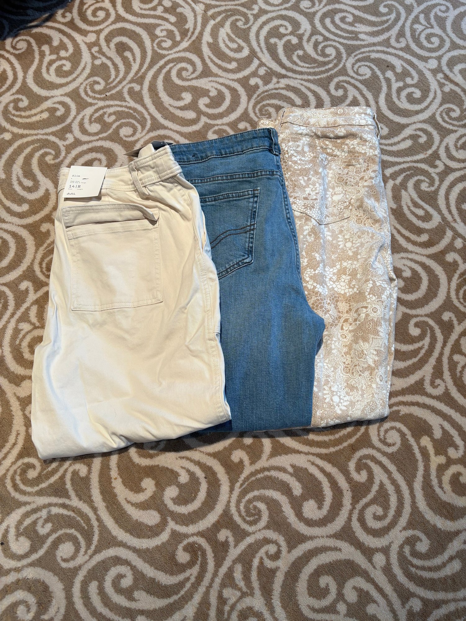 Chico’s slimming girlfriend ankle 14 hour beige and white lace pattern, a new day khakis stone slim stretch 14 hour fat face jeans, girlfriend jeans 14 hour