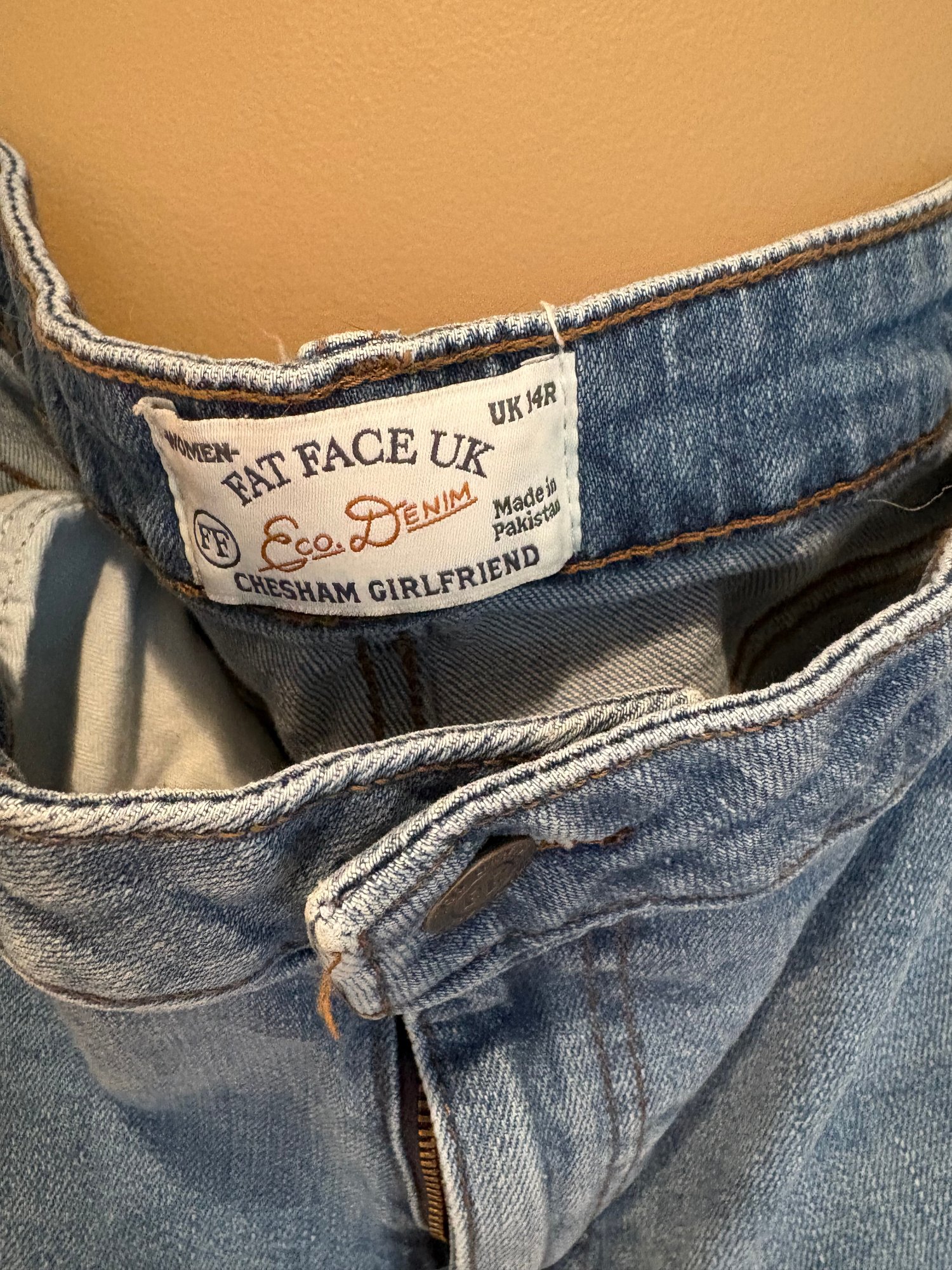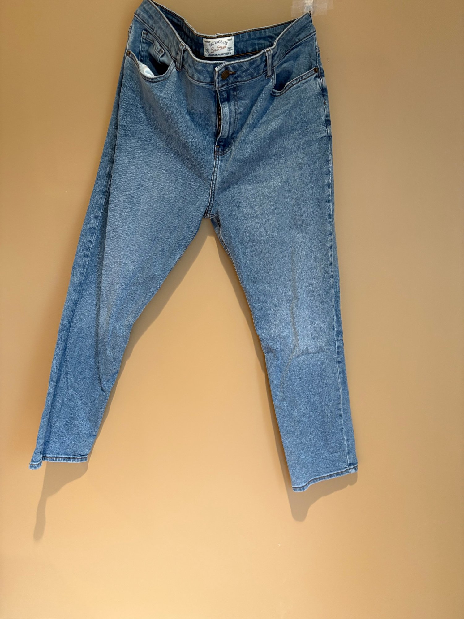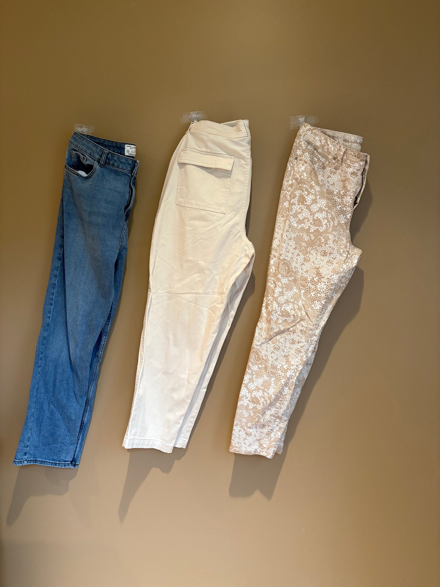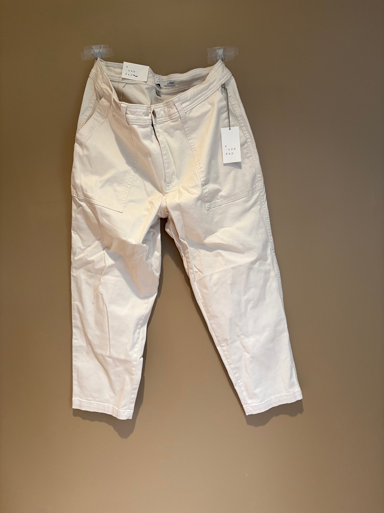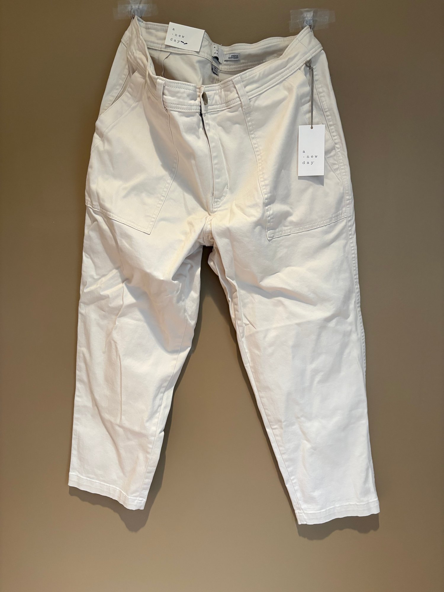 Chico’s slimming girlfriend ankle 14 hour beige and white lace pattern, a new day khakis stone slim stretch 14 hour fat face jeans, girlfriend jeans 14 hour