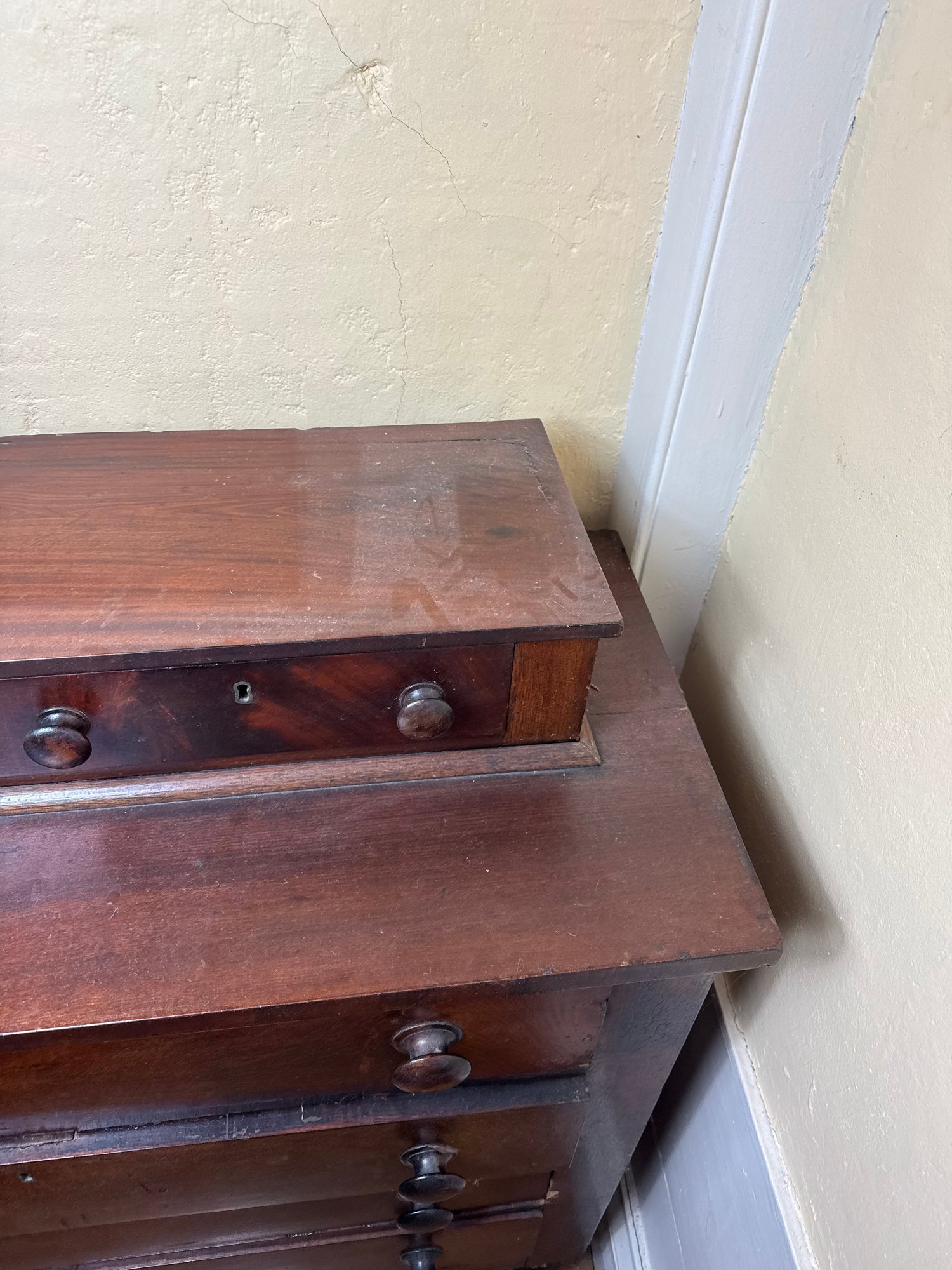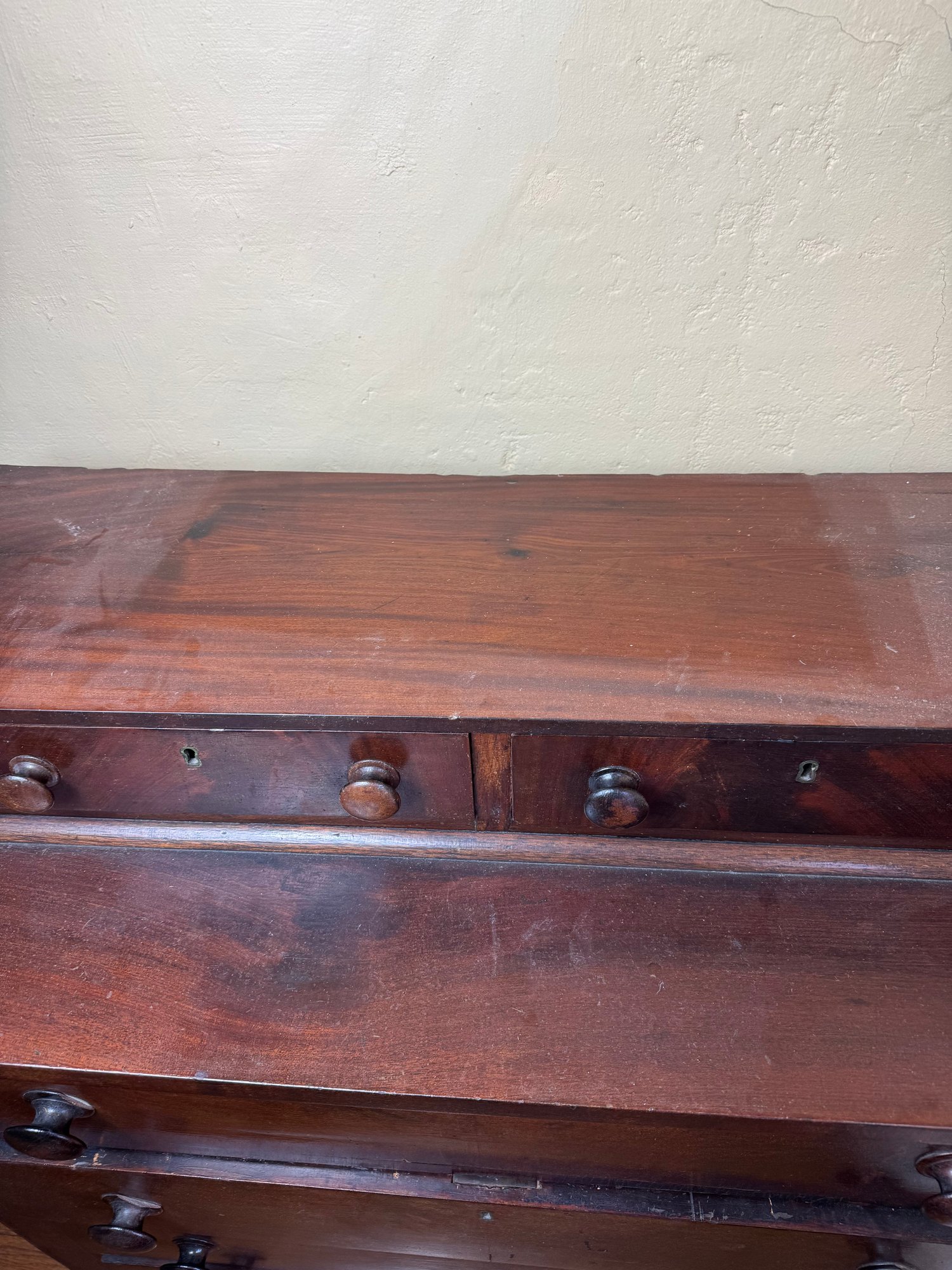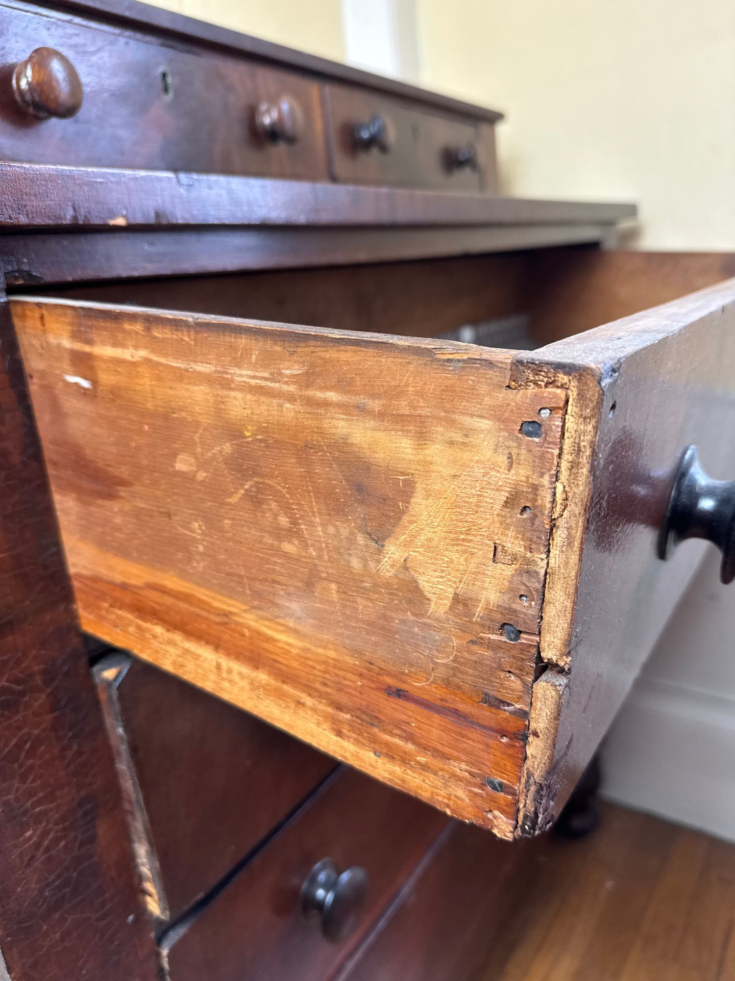 drawers push in further than the mark, some small areas of wear in the wood. overall good condition.
