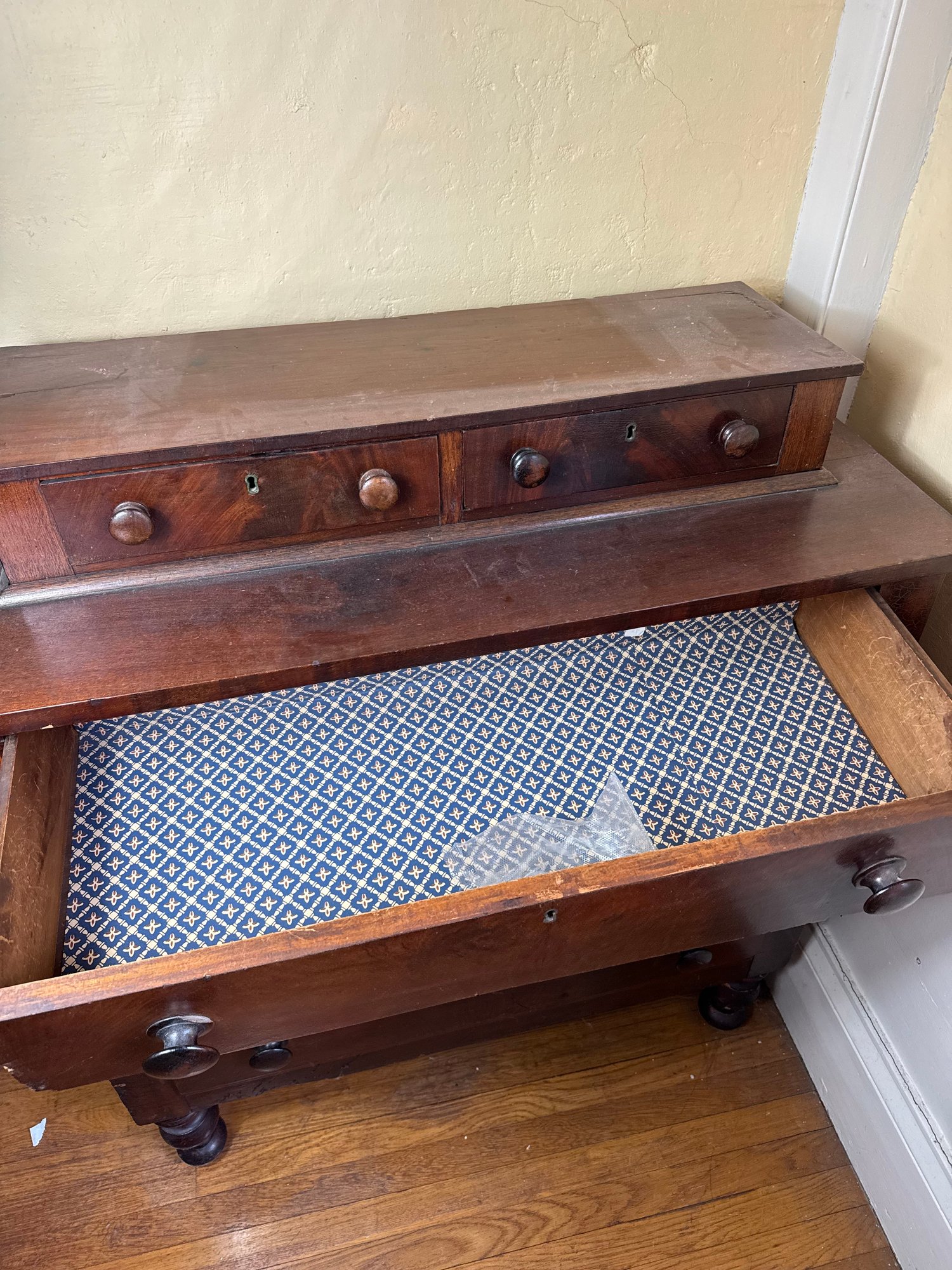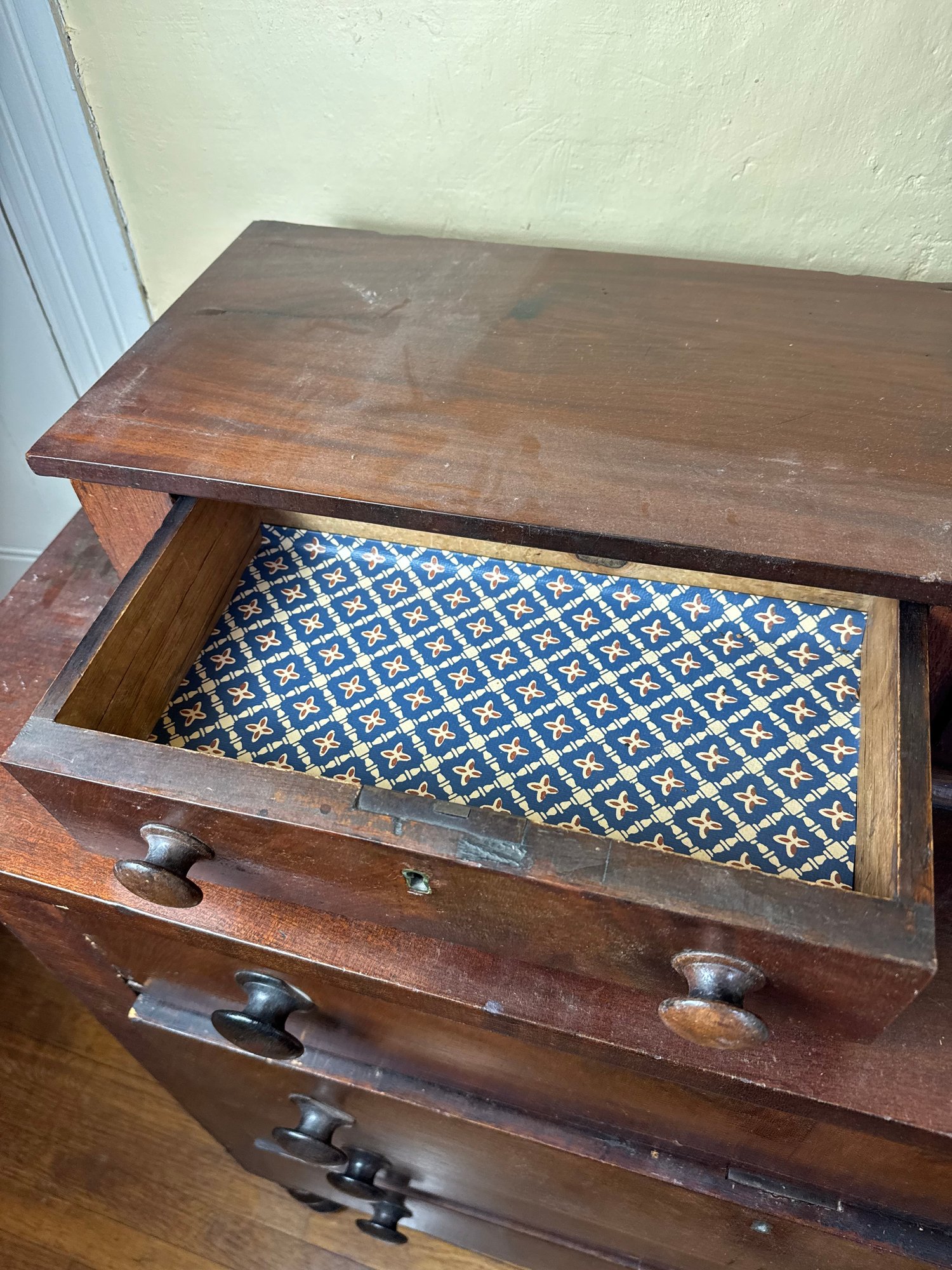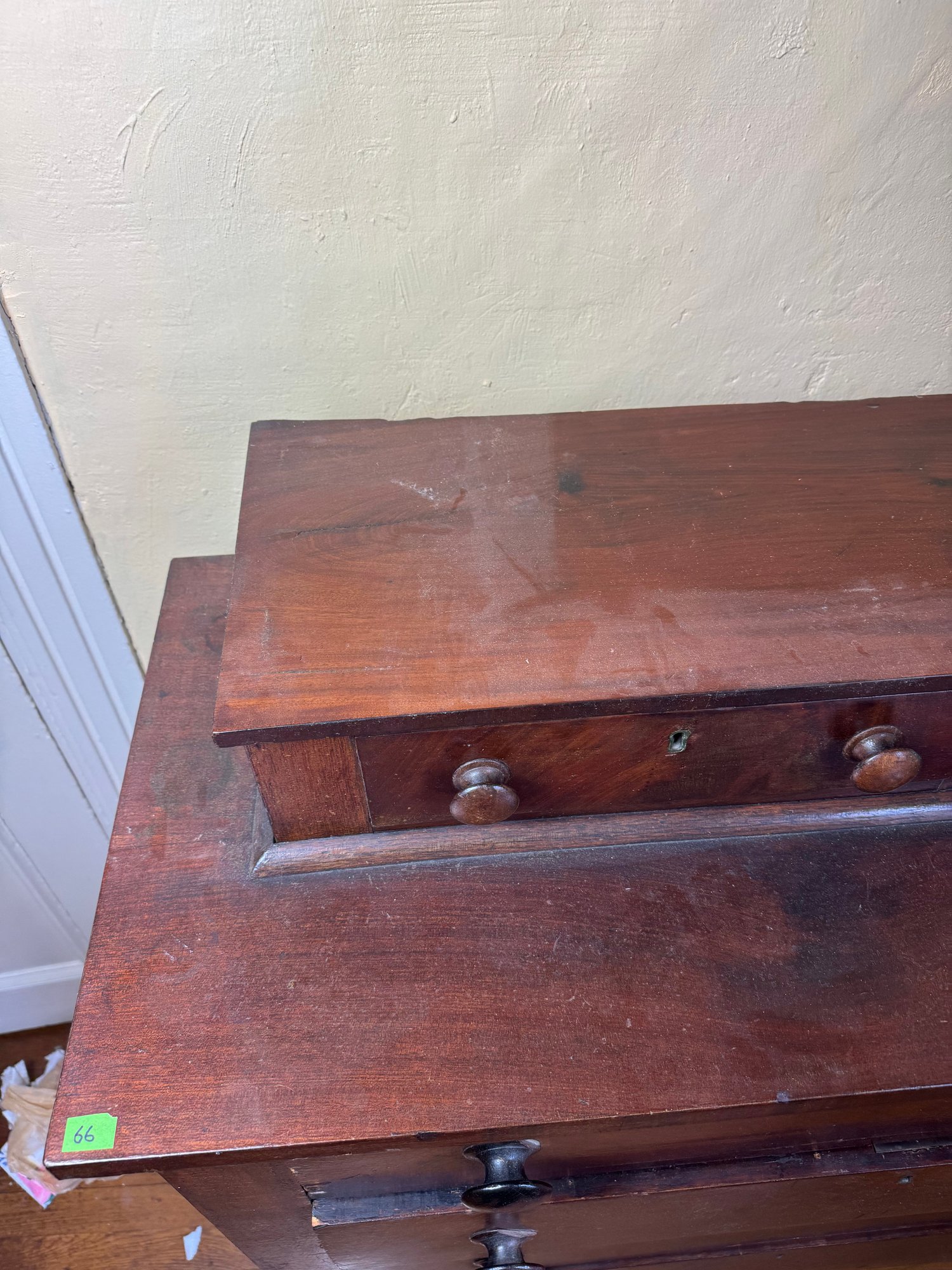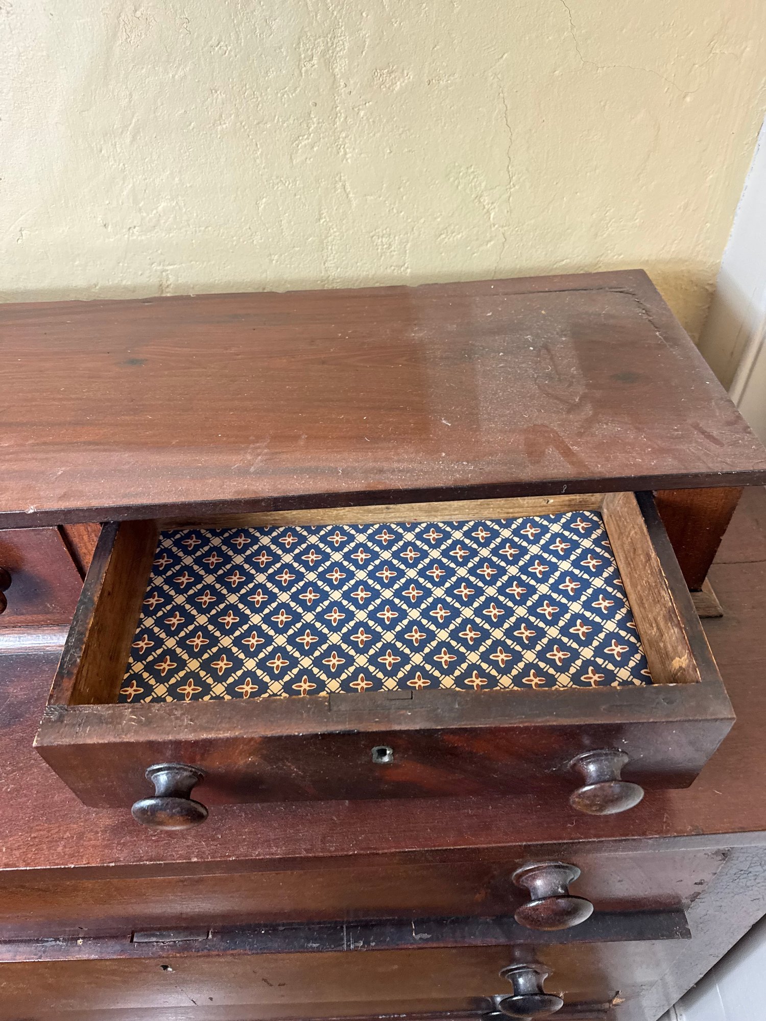 drawers push in further than the mark, some small areas of wear in the wood. overall good condition.