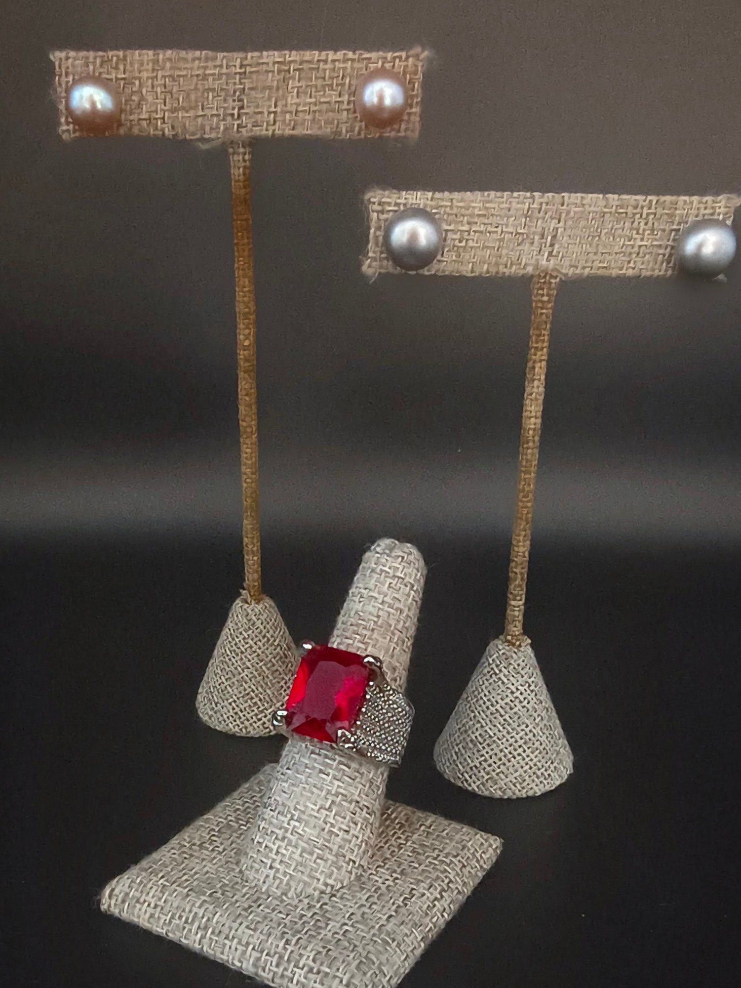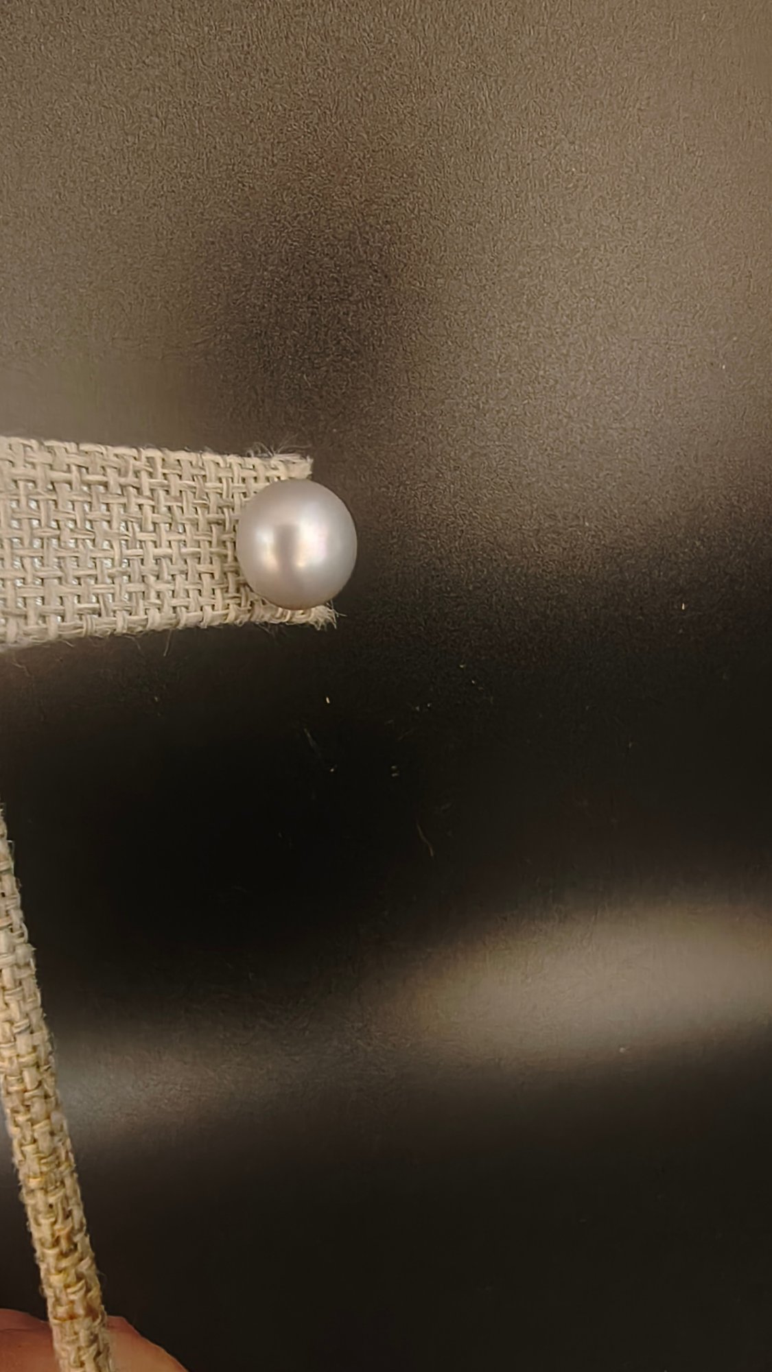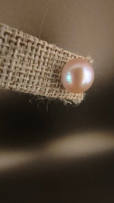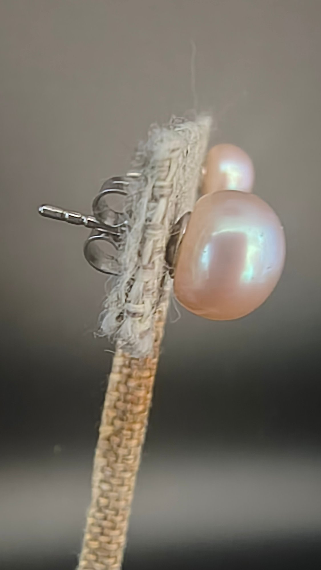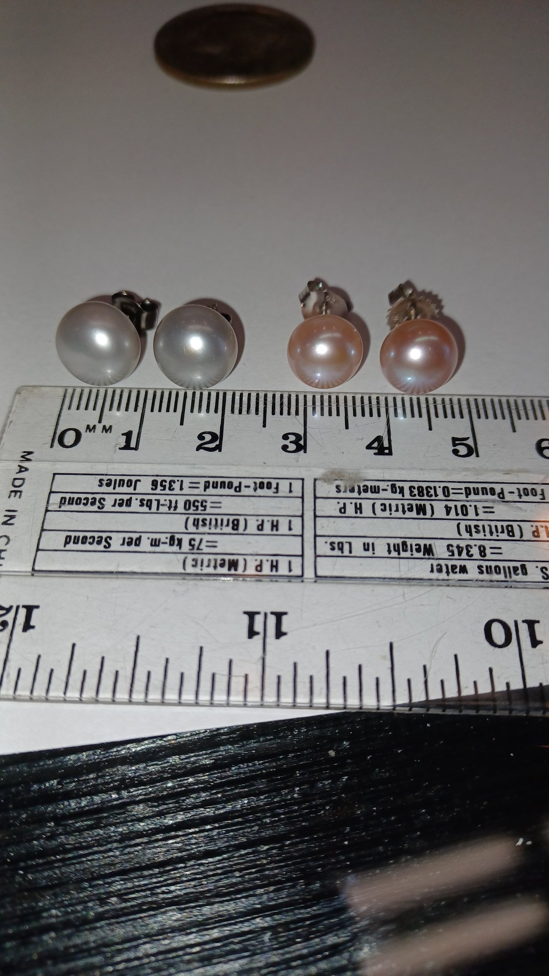 Pearls measure ~8-10mm; pink then gray