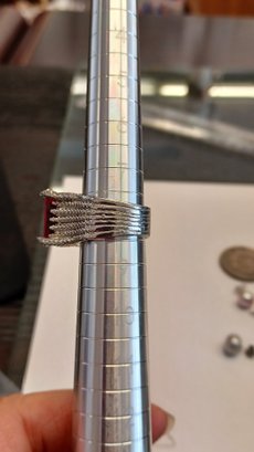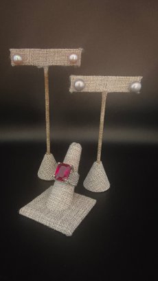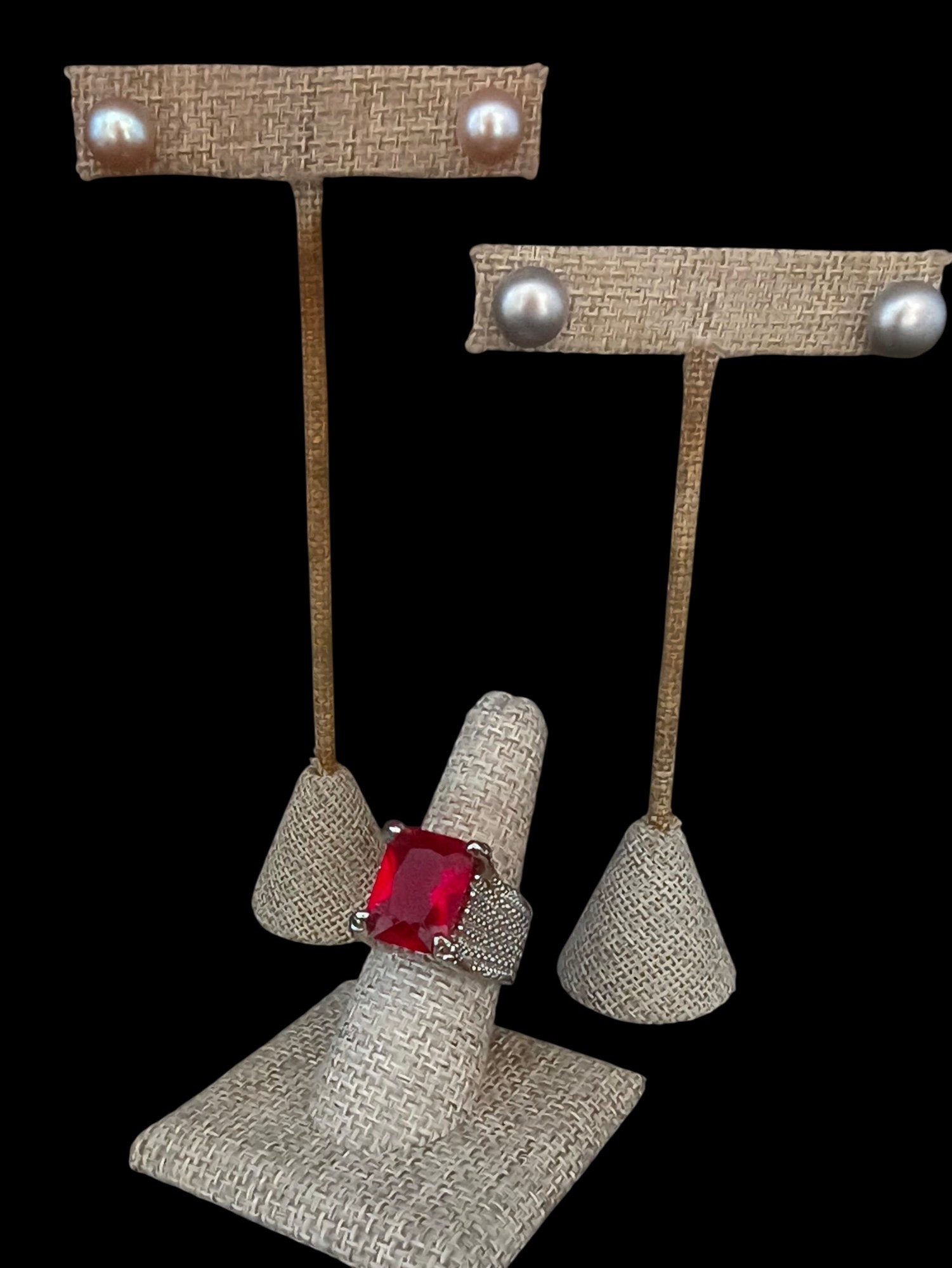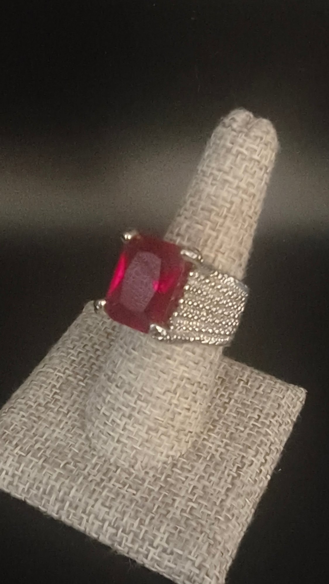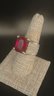 Ring is a size 8-8.25; red stone is emerald cut with pink hues; stone is ~15mm x 7mm