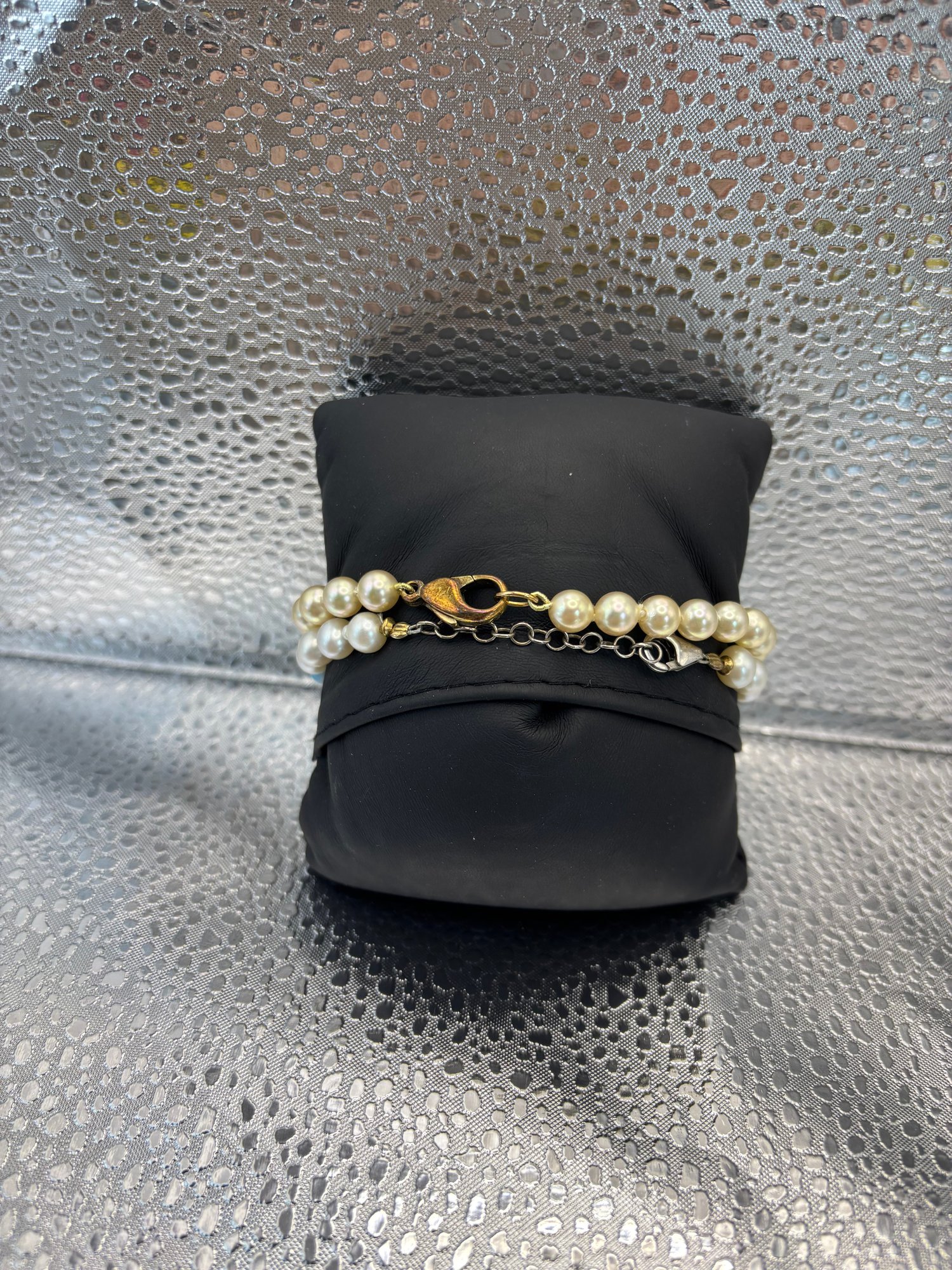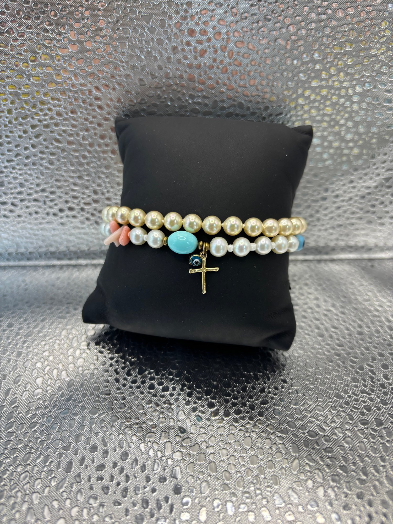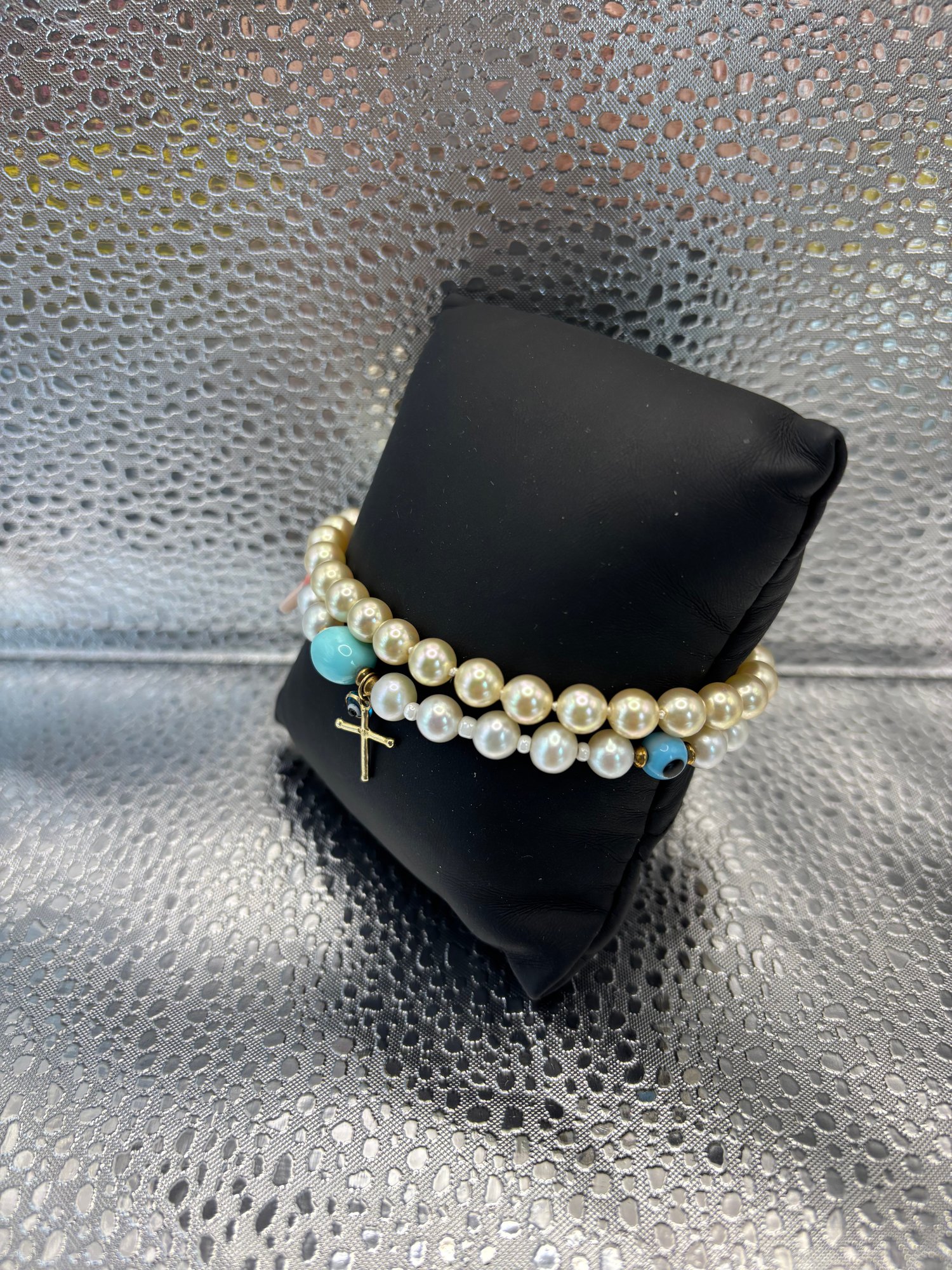 2 Pearl Like Bracelets-the One With The Evil Eye And Cross Has A Sterling Clasp