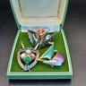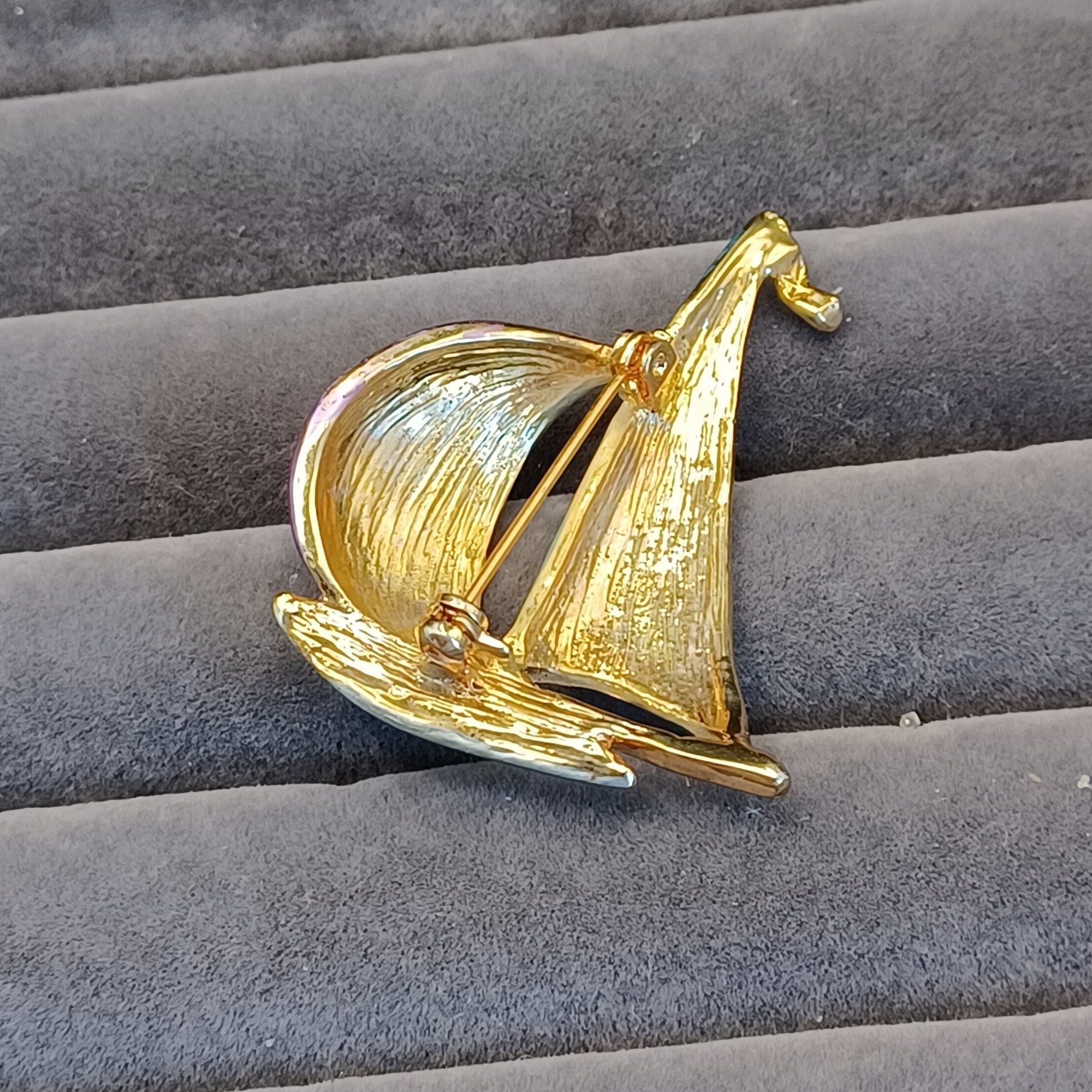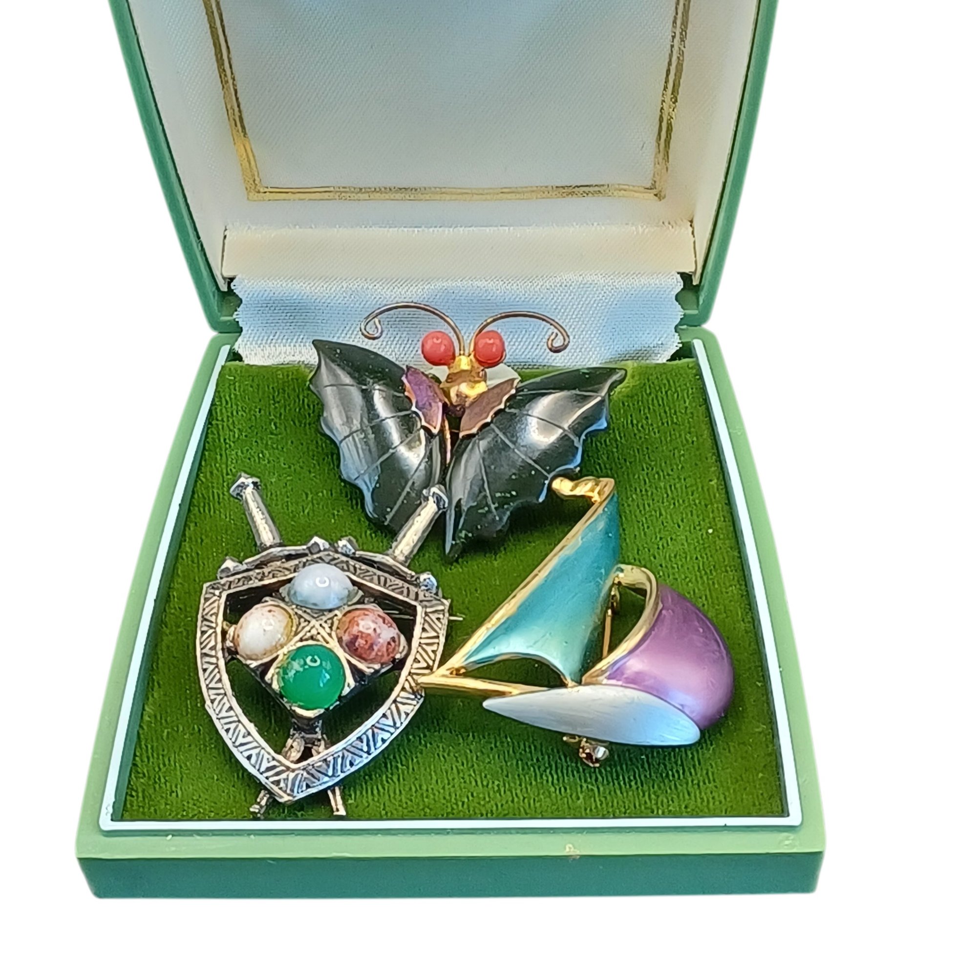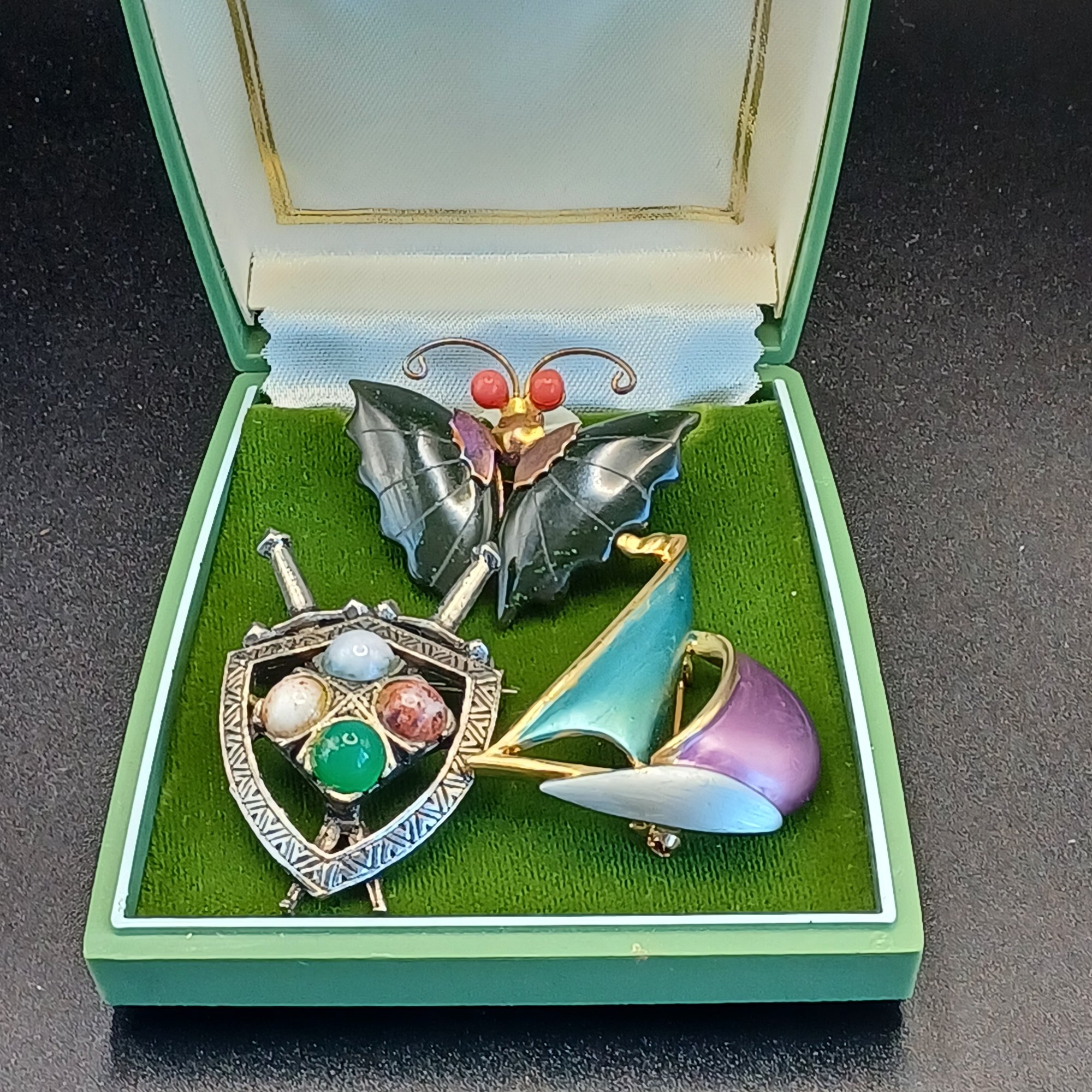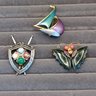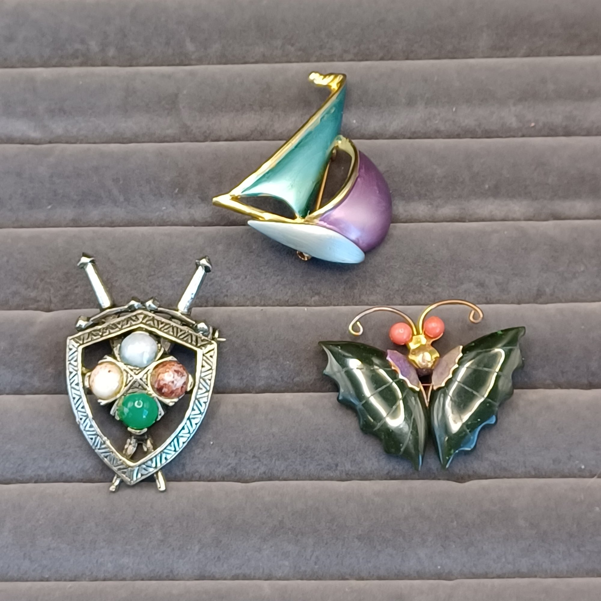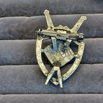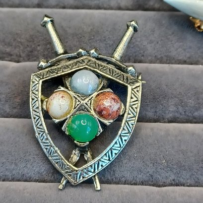 Shield and sword pin has 4 faux agate stones