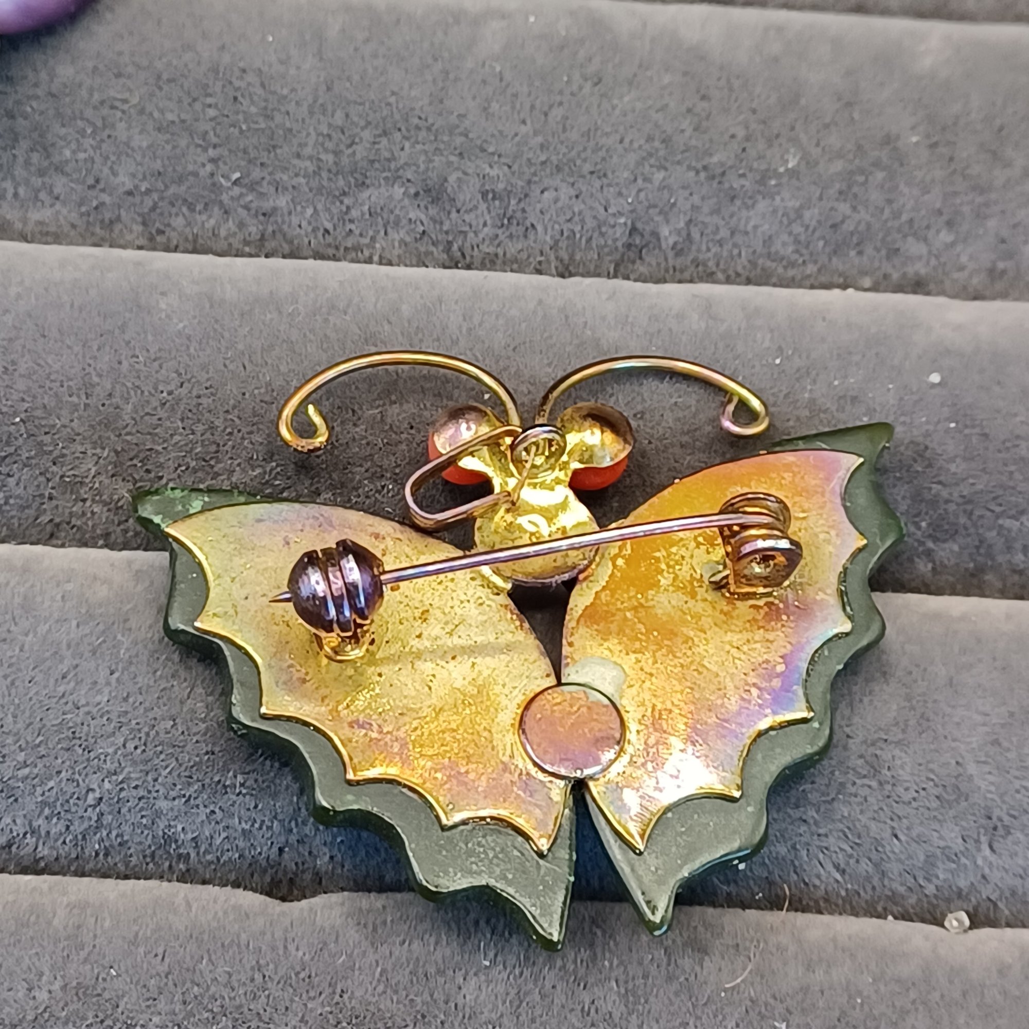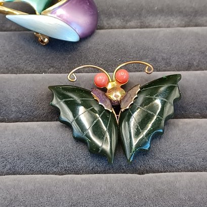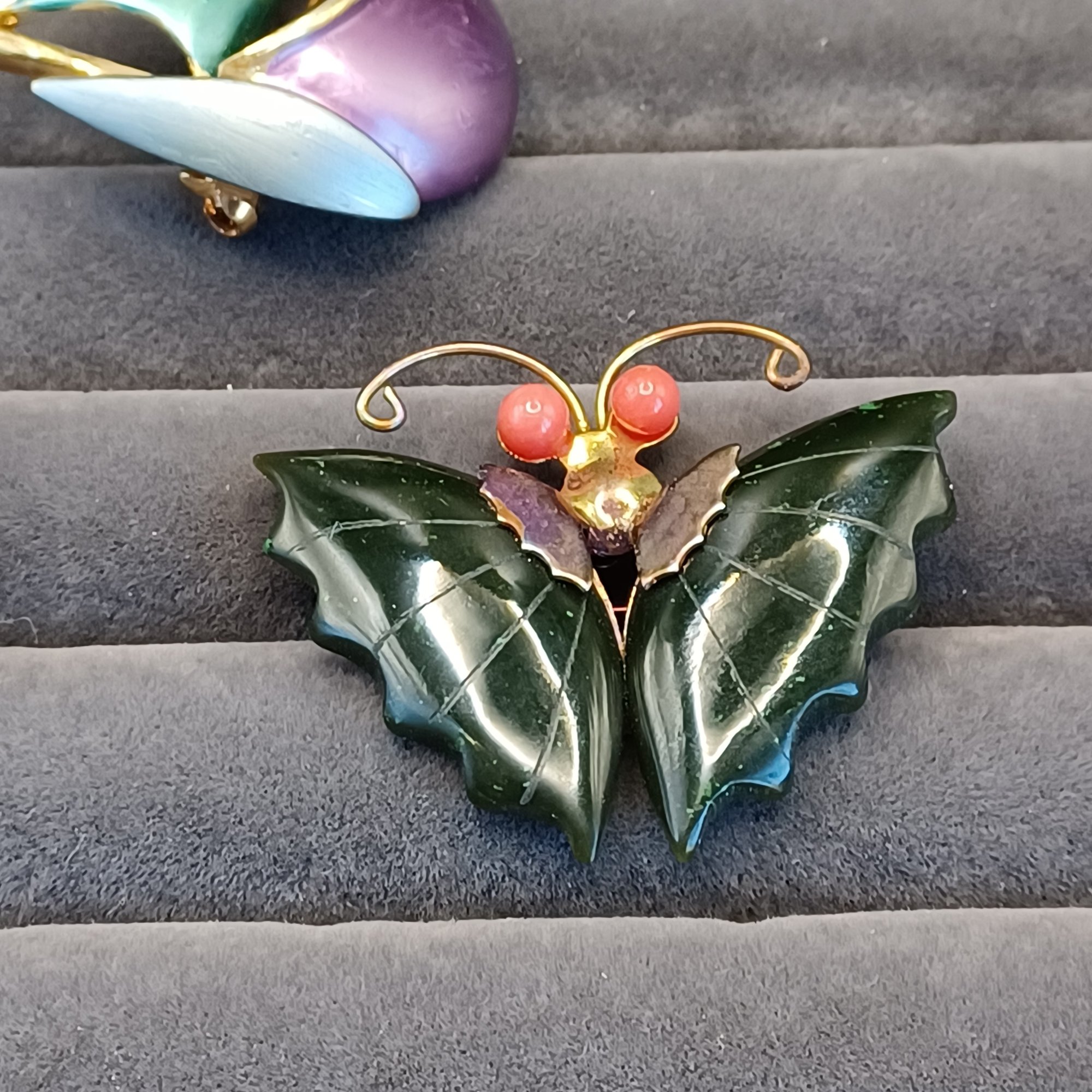 Butterfly has coral bead eyes