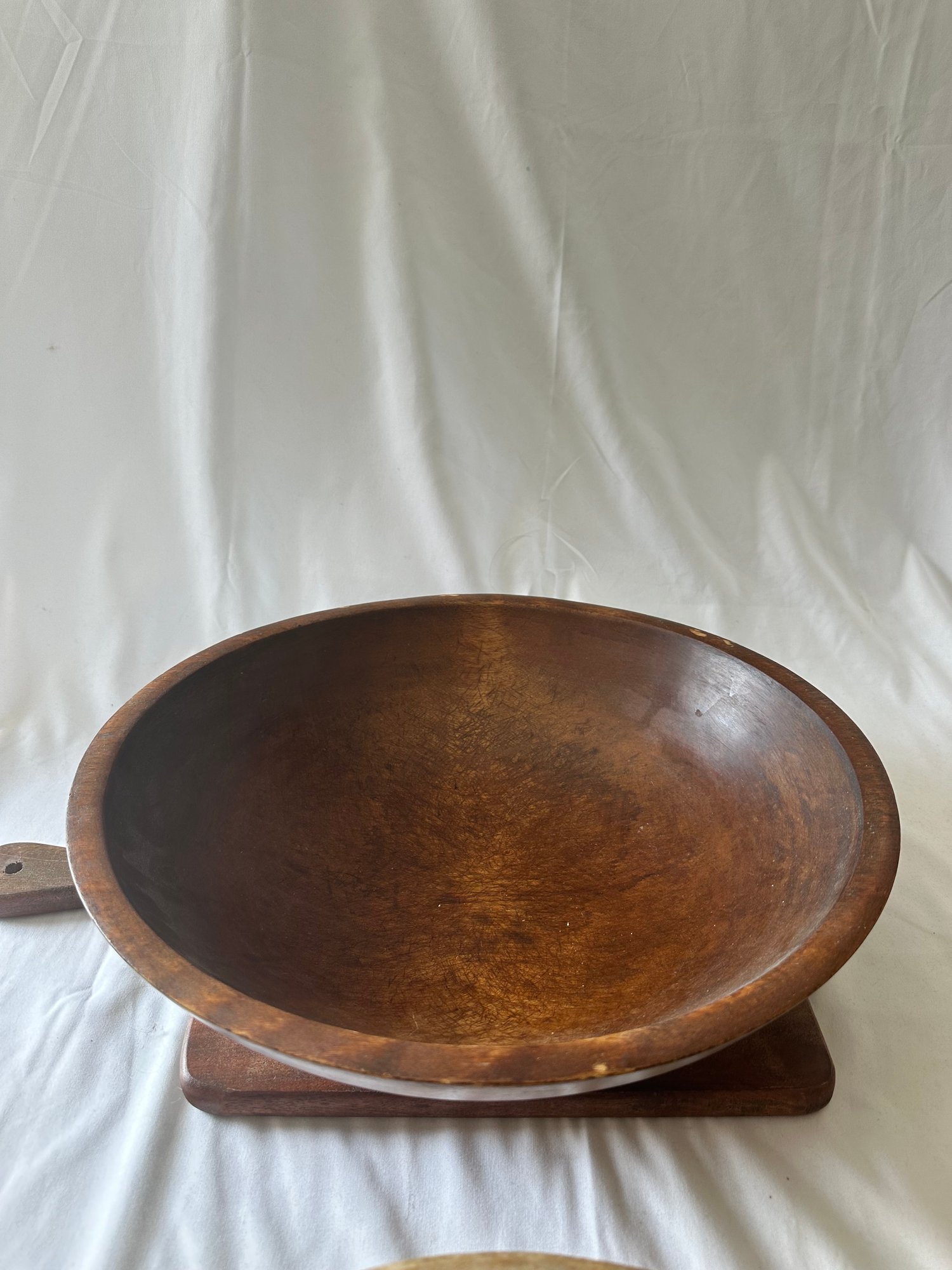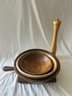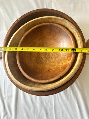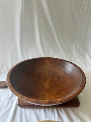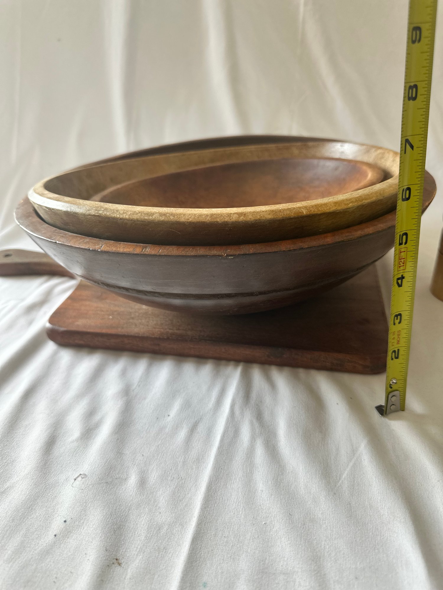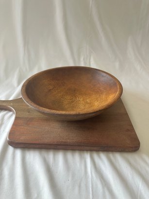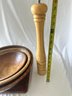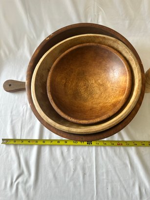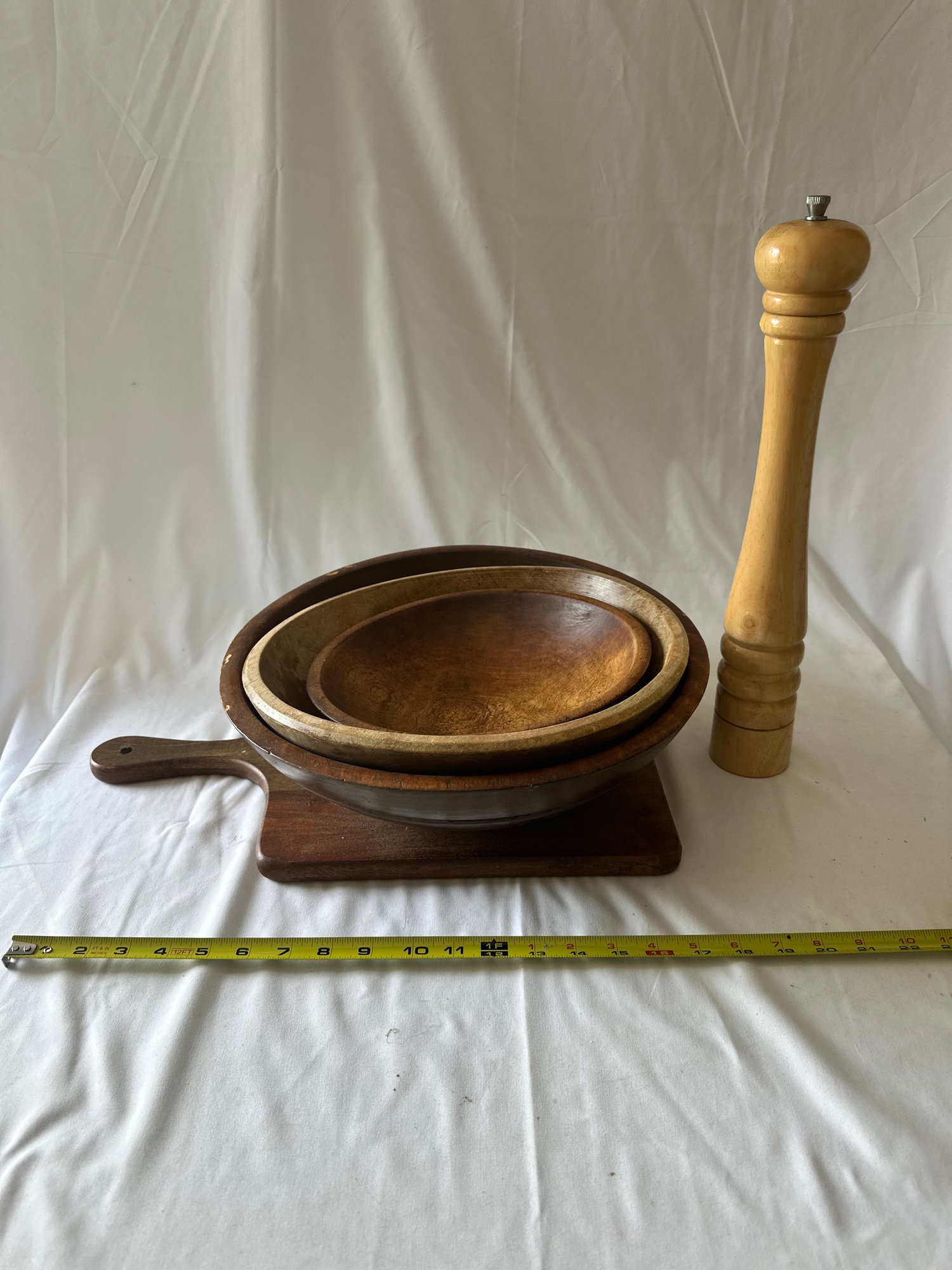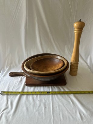 3 wooden bowls with a wood cutting board, and wooden peppermill lot