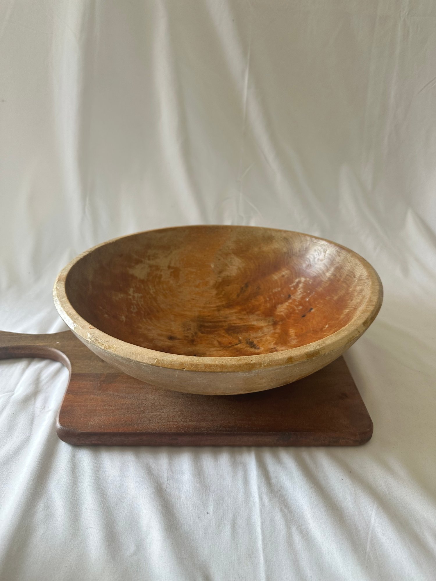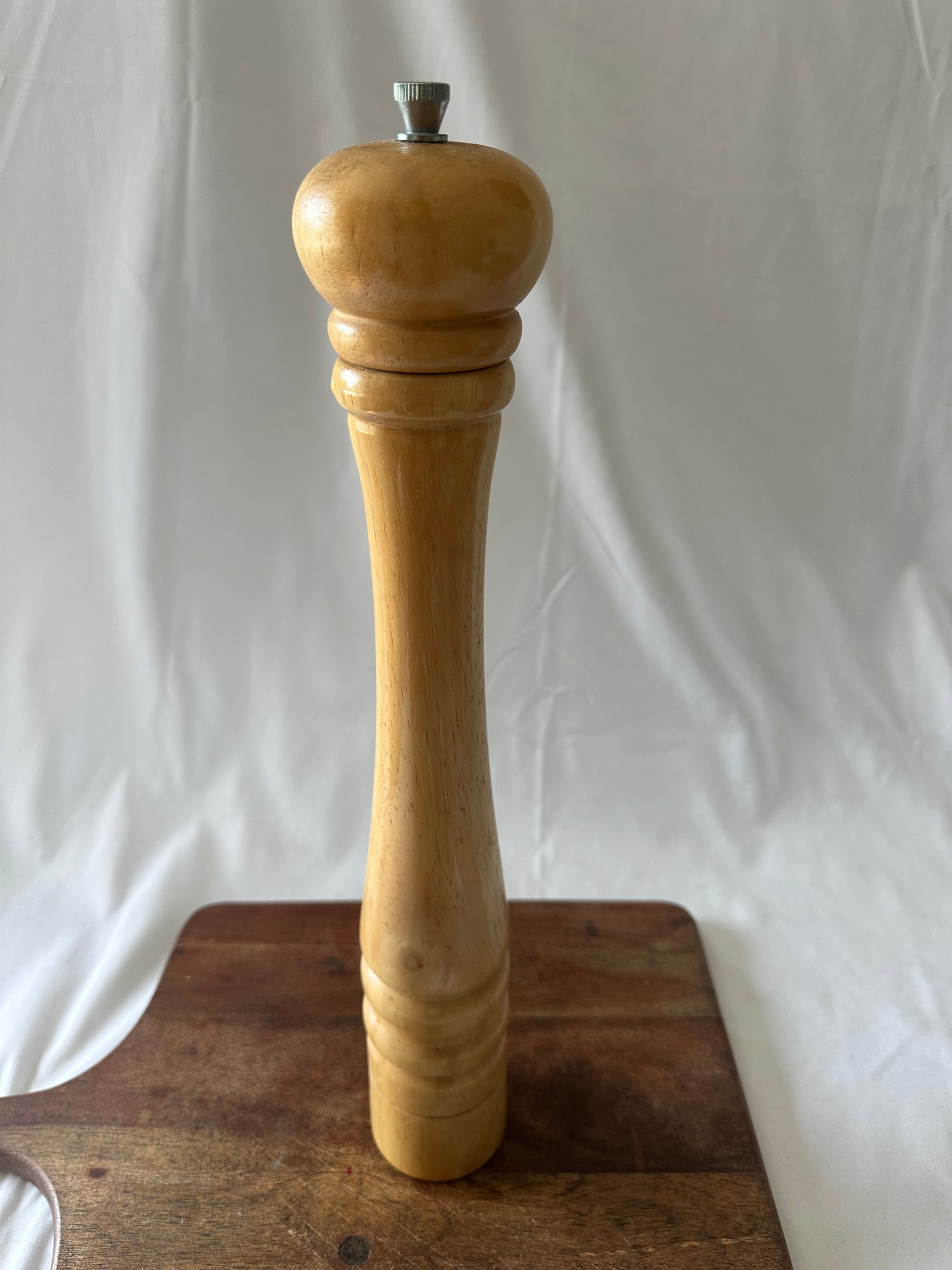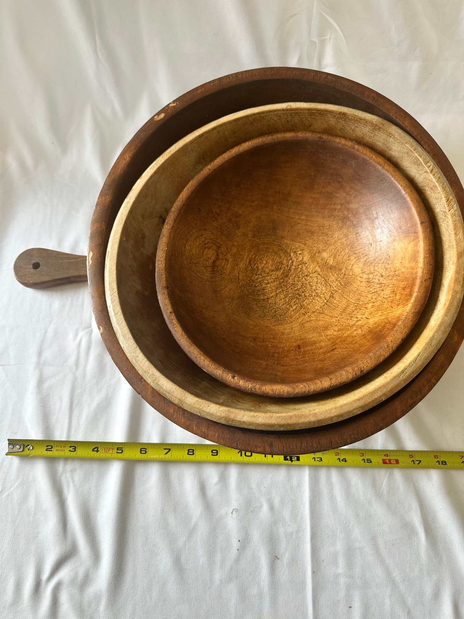 3 wooden bowls with a wood cutting board, and wooden peppermill lot
