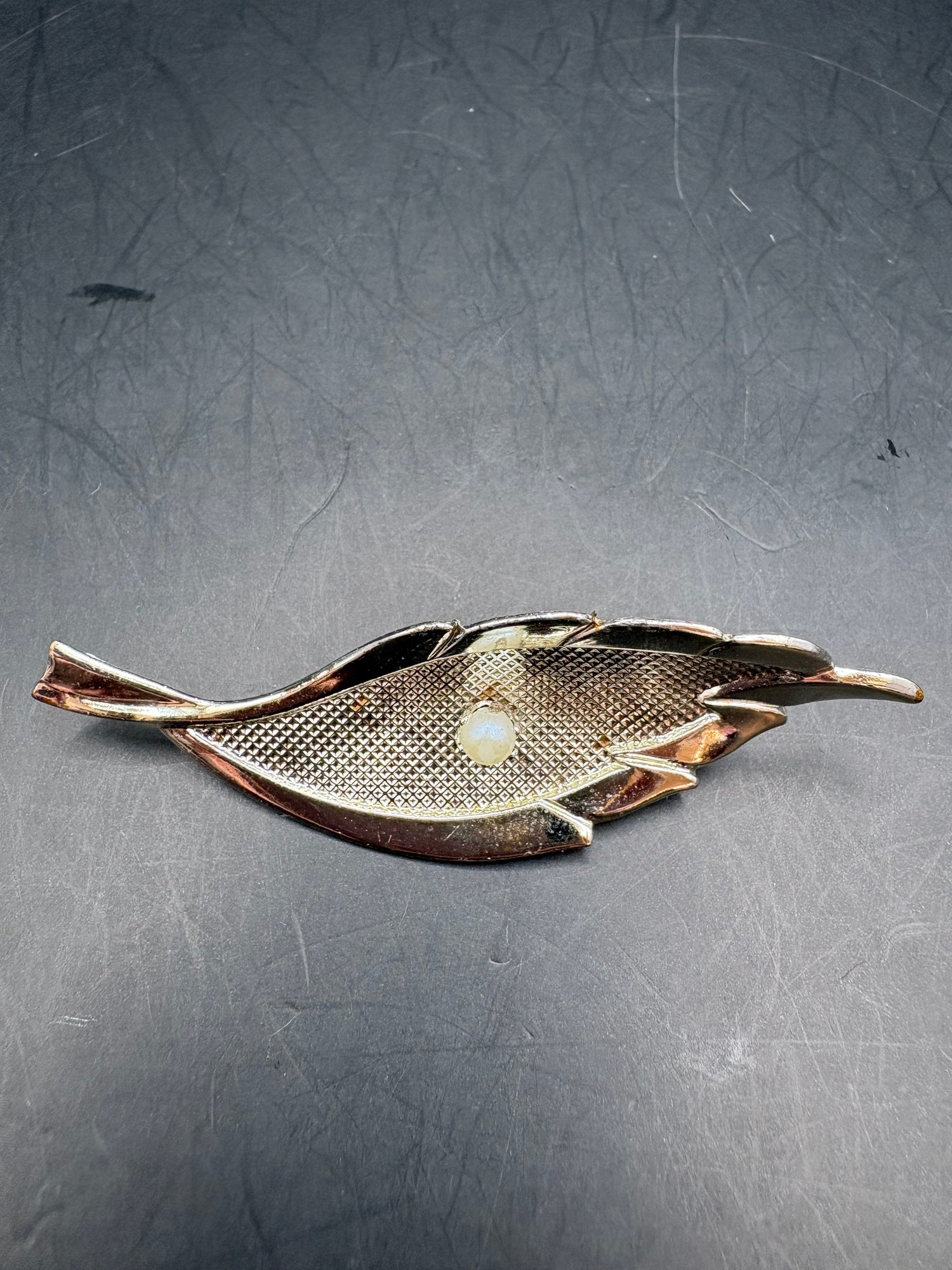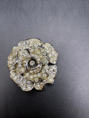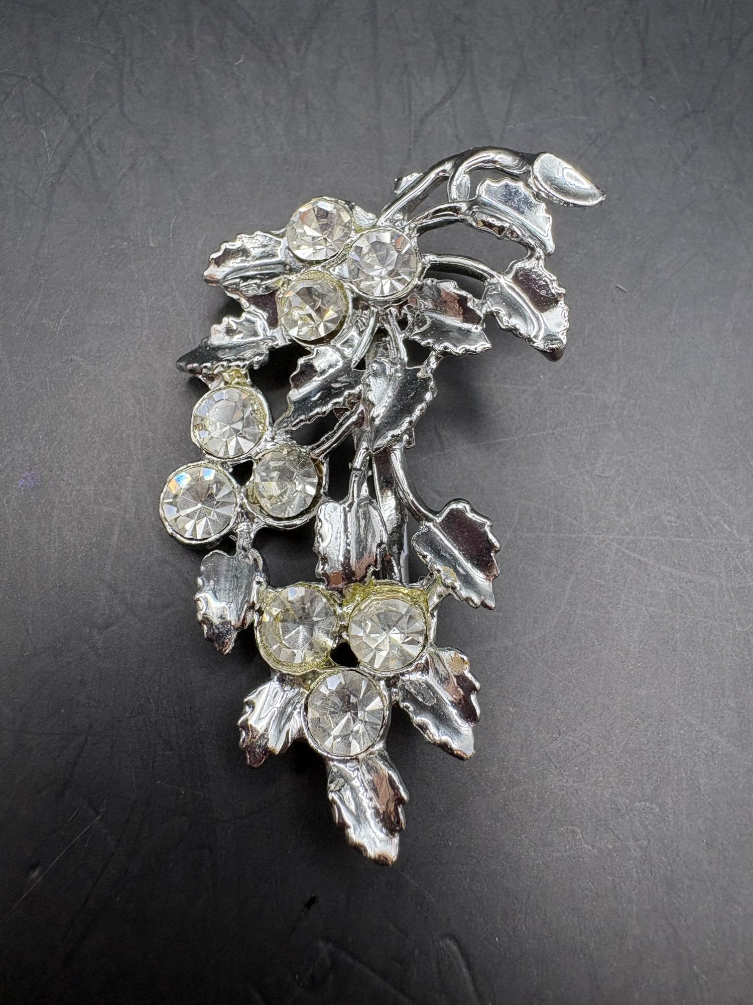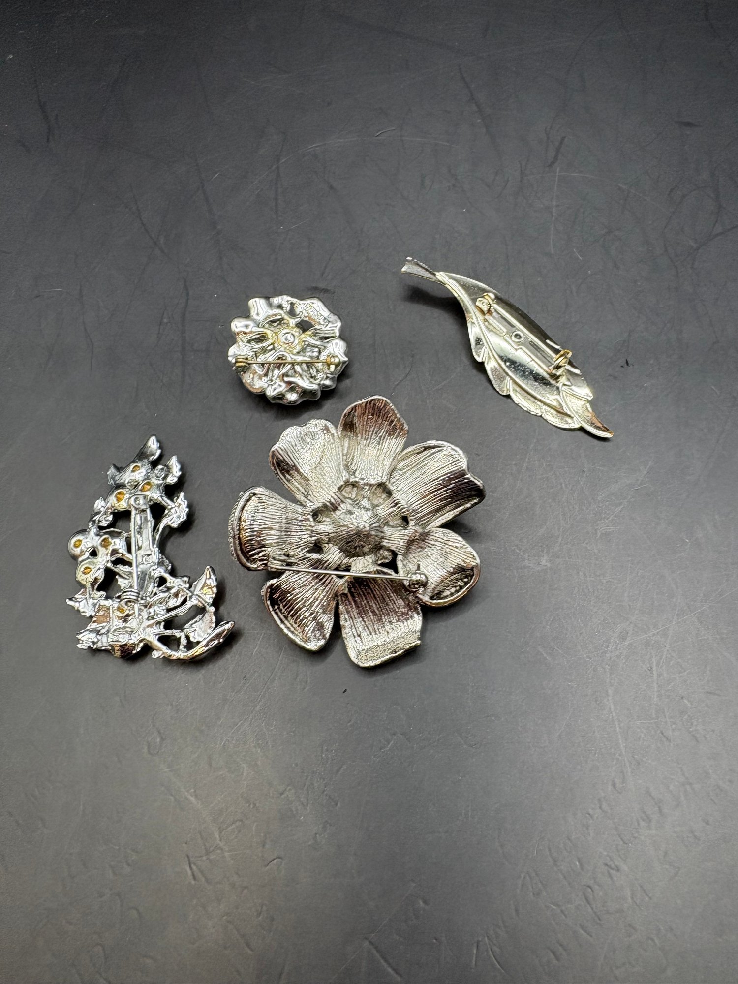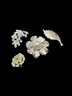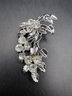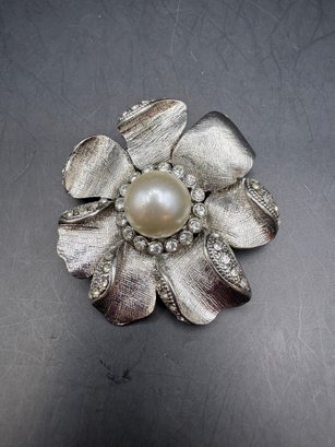 For floral pins with pearls and glass, silver tone