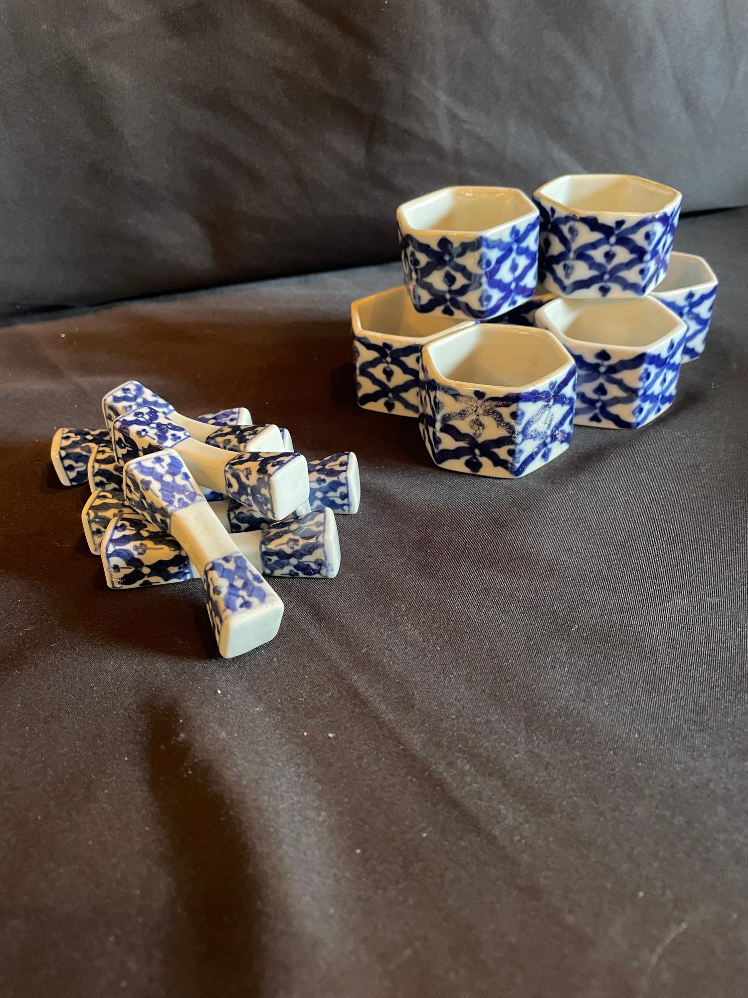 8 chop stick, spin rests, 7-5 sided napkin rings, blue and white