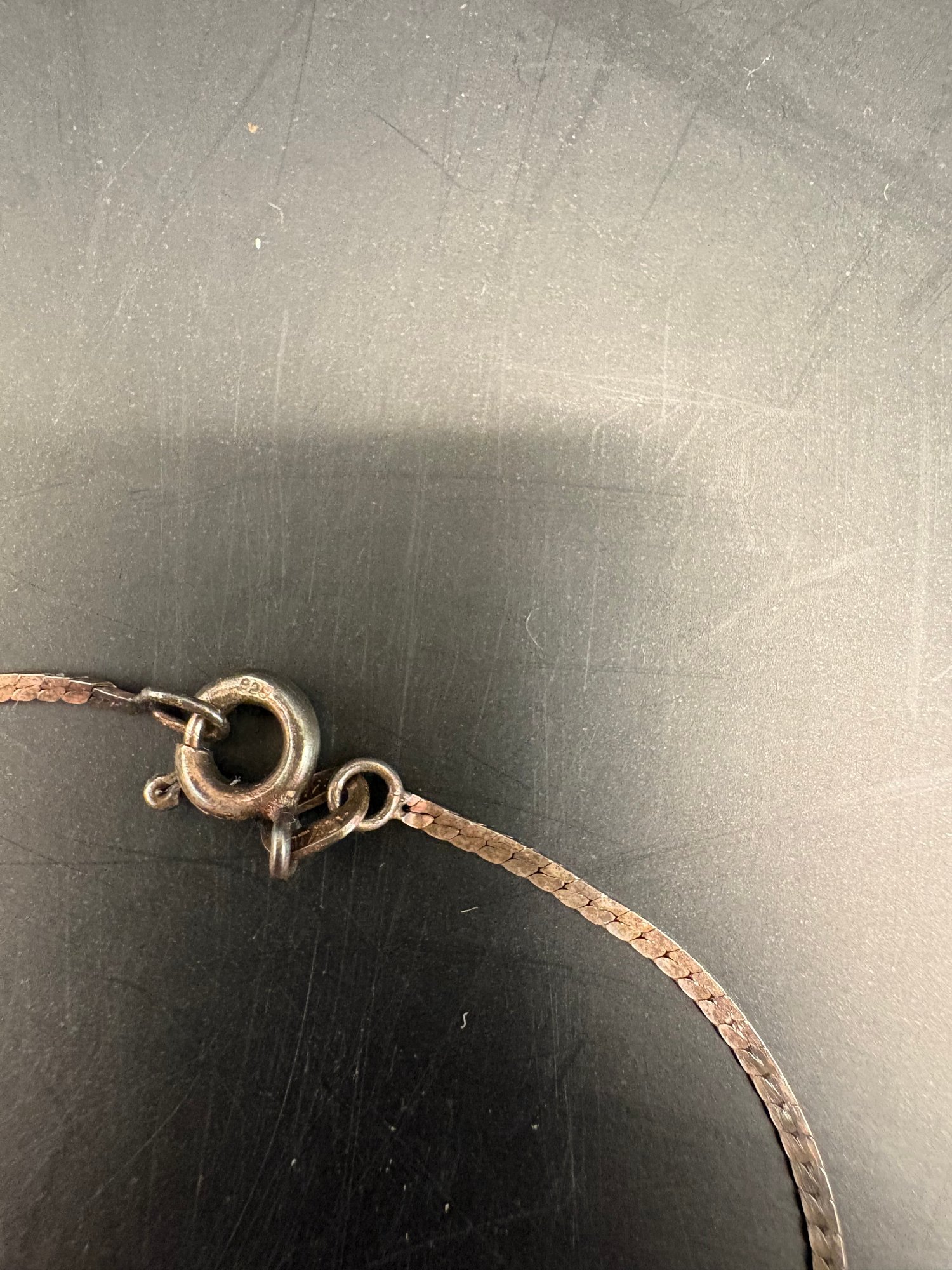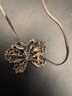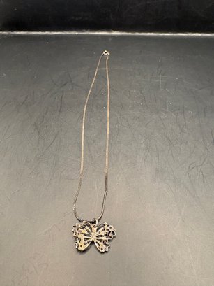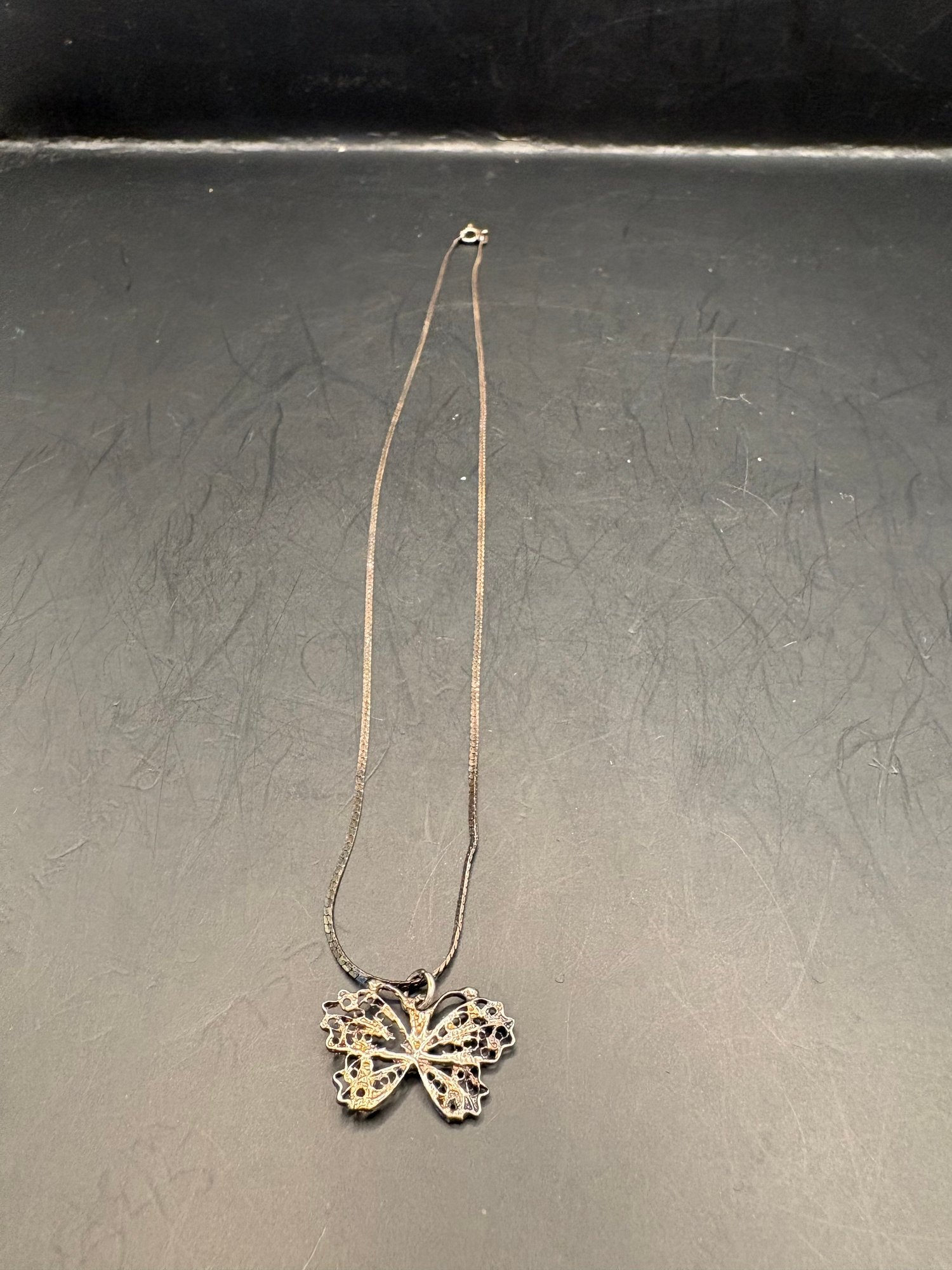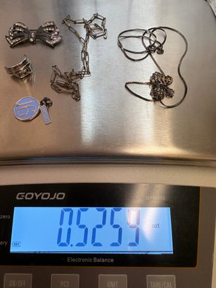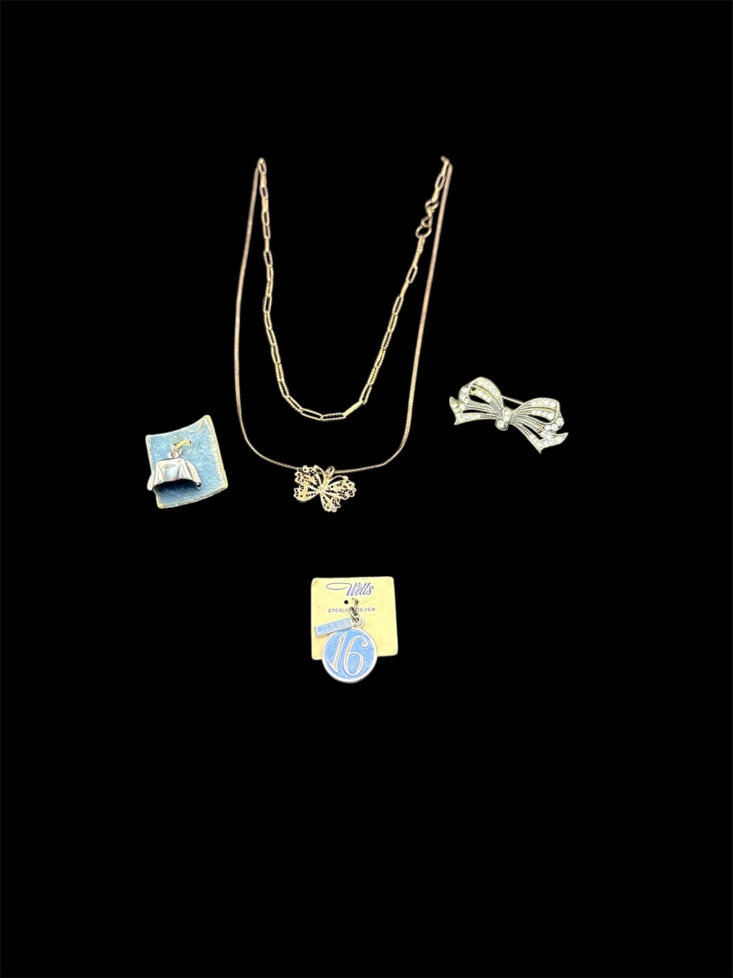 Sterling silver: there’s two necklaces, a bow pin missing a gem and there’s two charms: one is a Sweet 16 and the other one, a butterfly, is also sterling. So it’s all sterling the weight is 0.5259