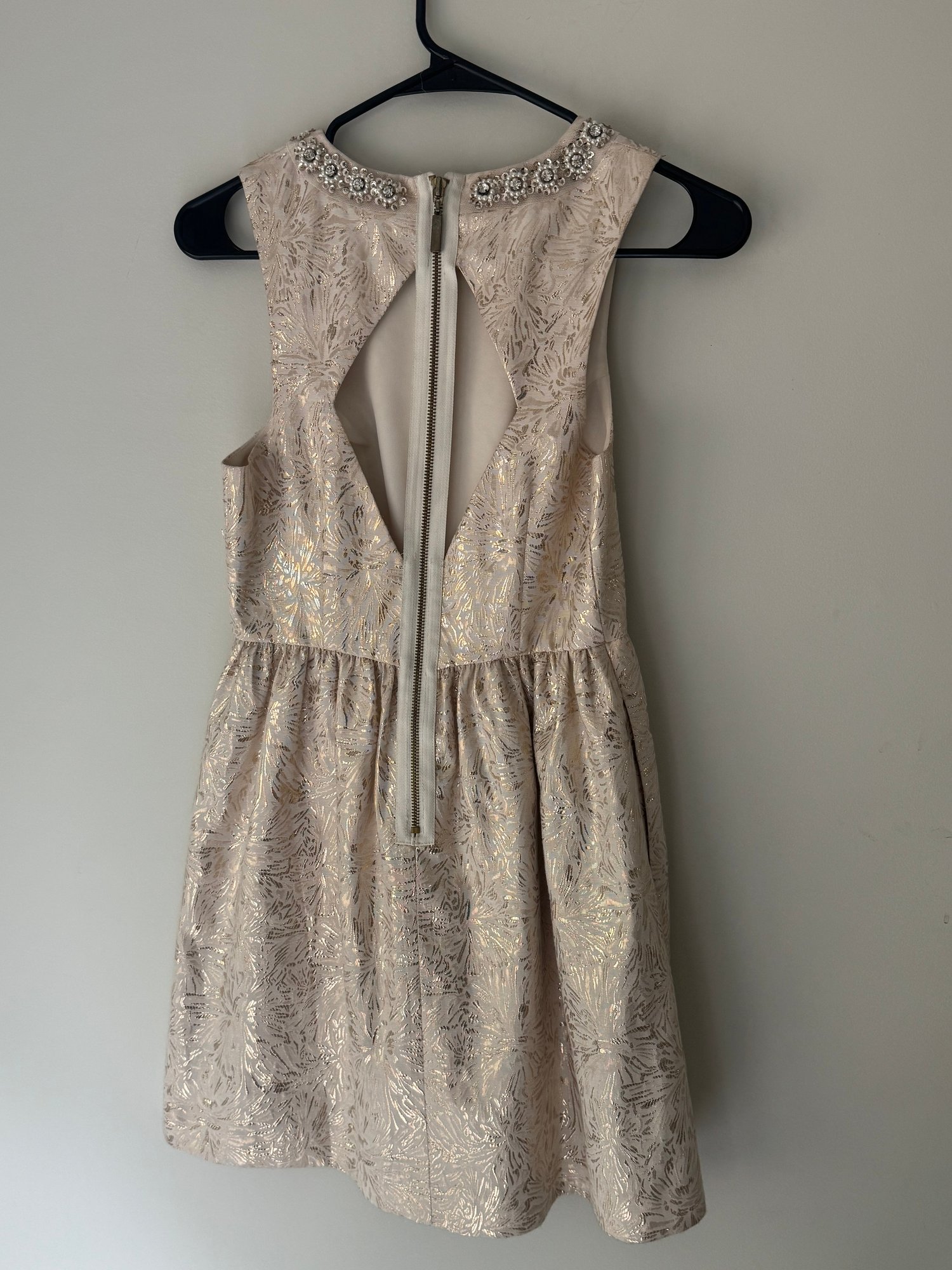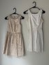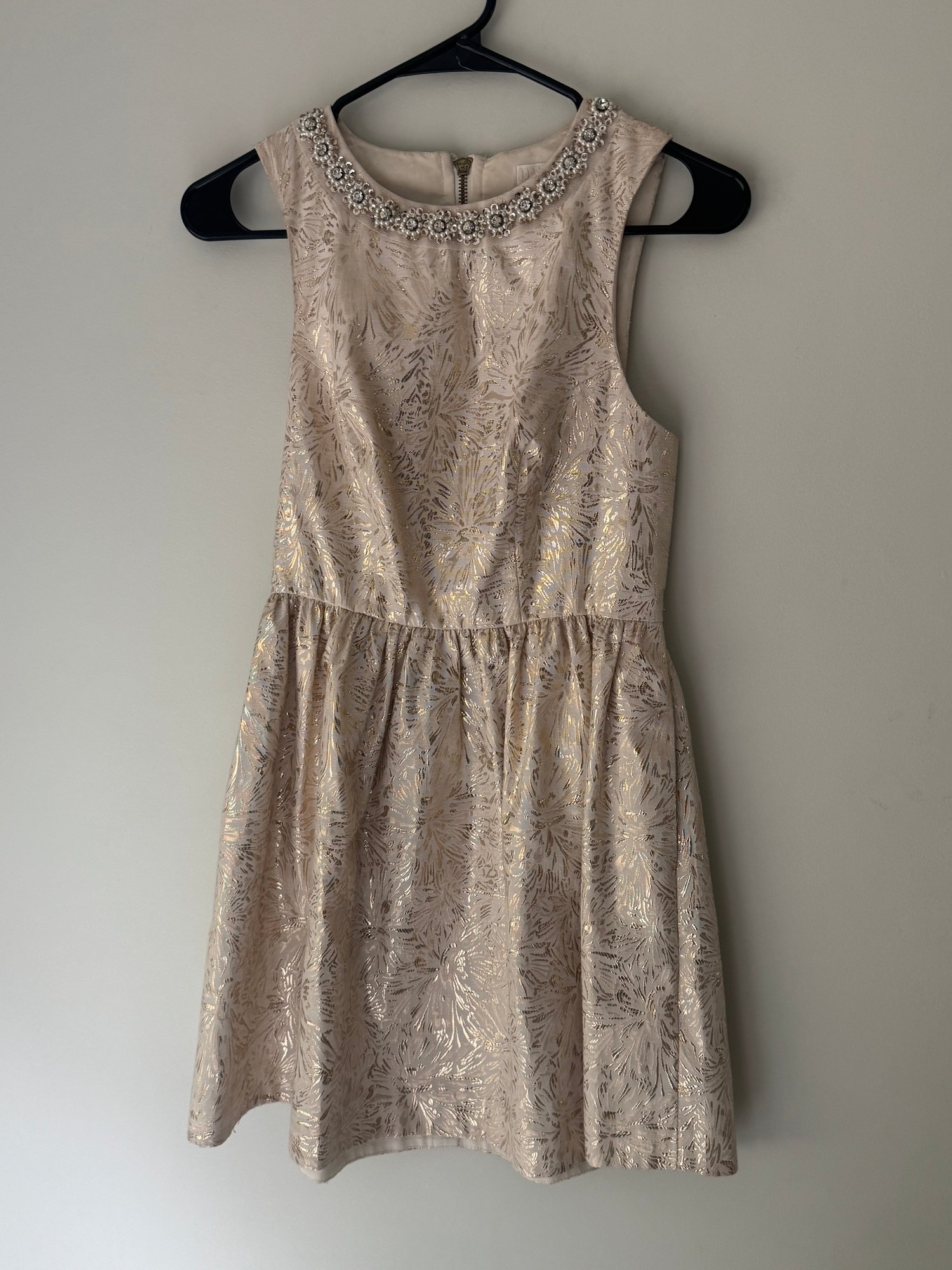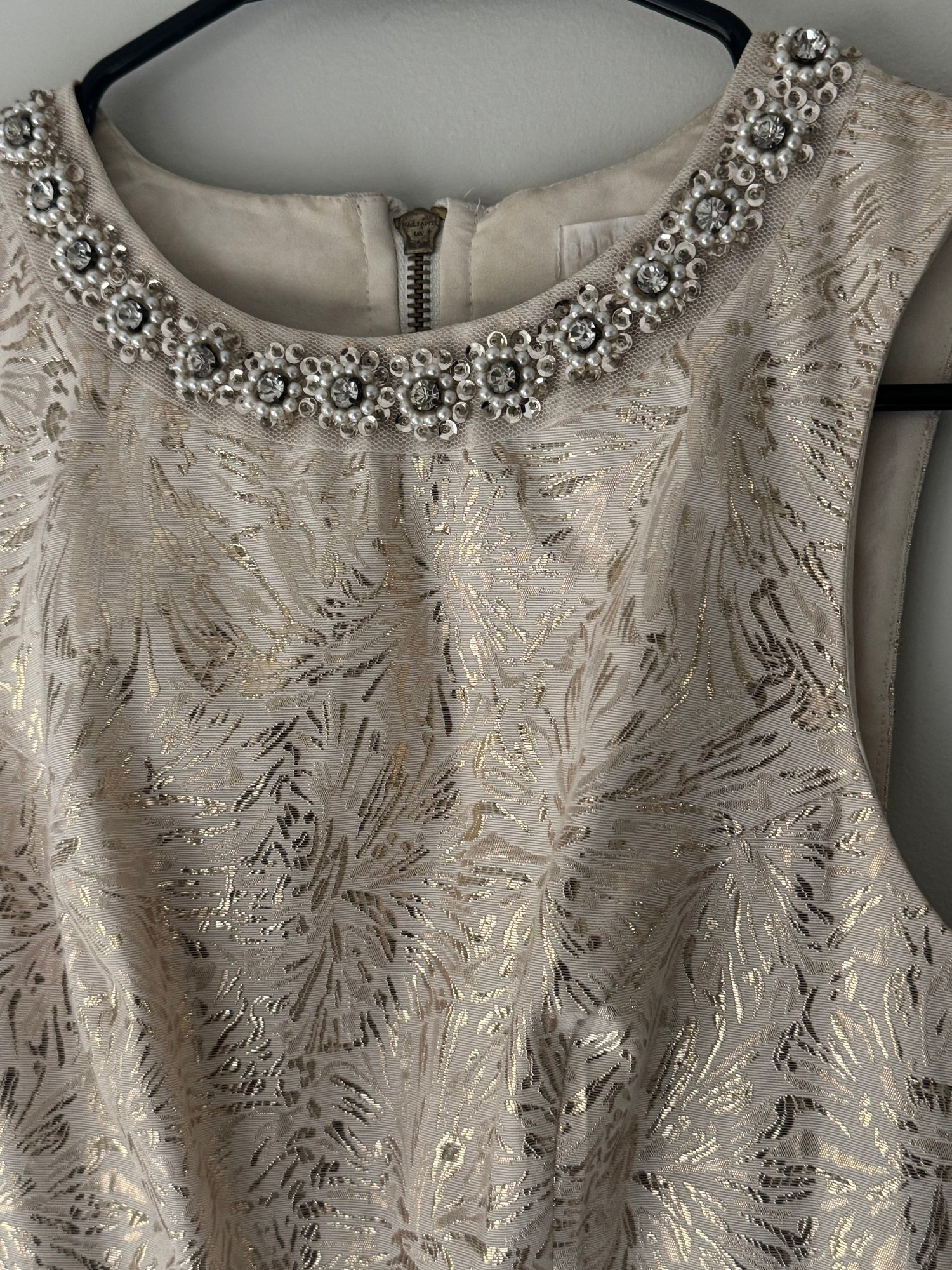 Style: gold and white sleeveless party dress.