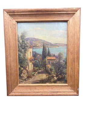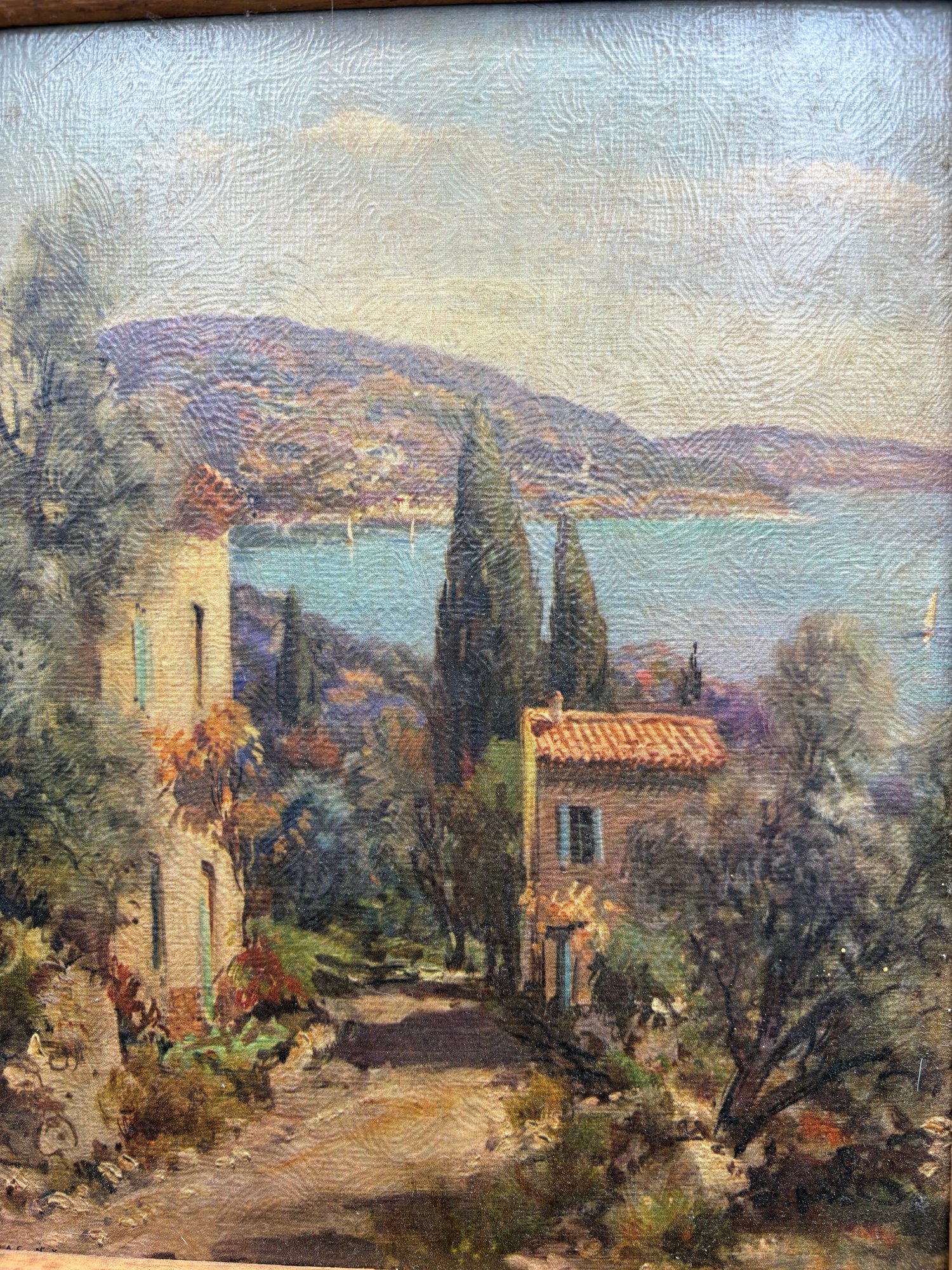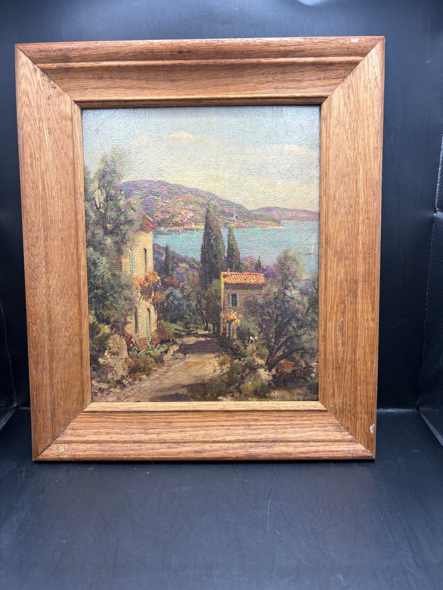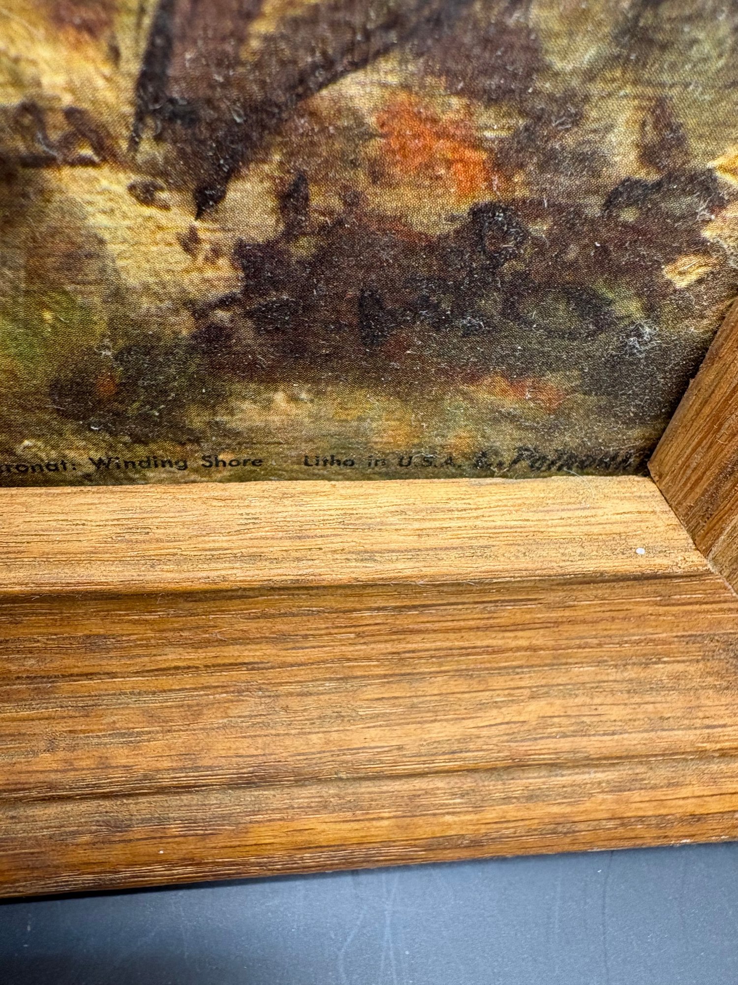 Arcrylic on heavy cardboard called winding Shores. It’s damped on the bottom right in the frame.