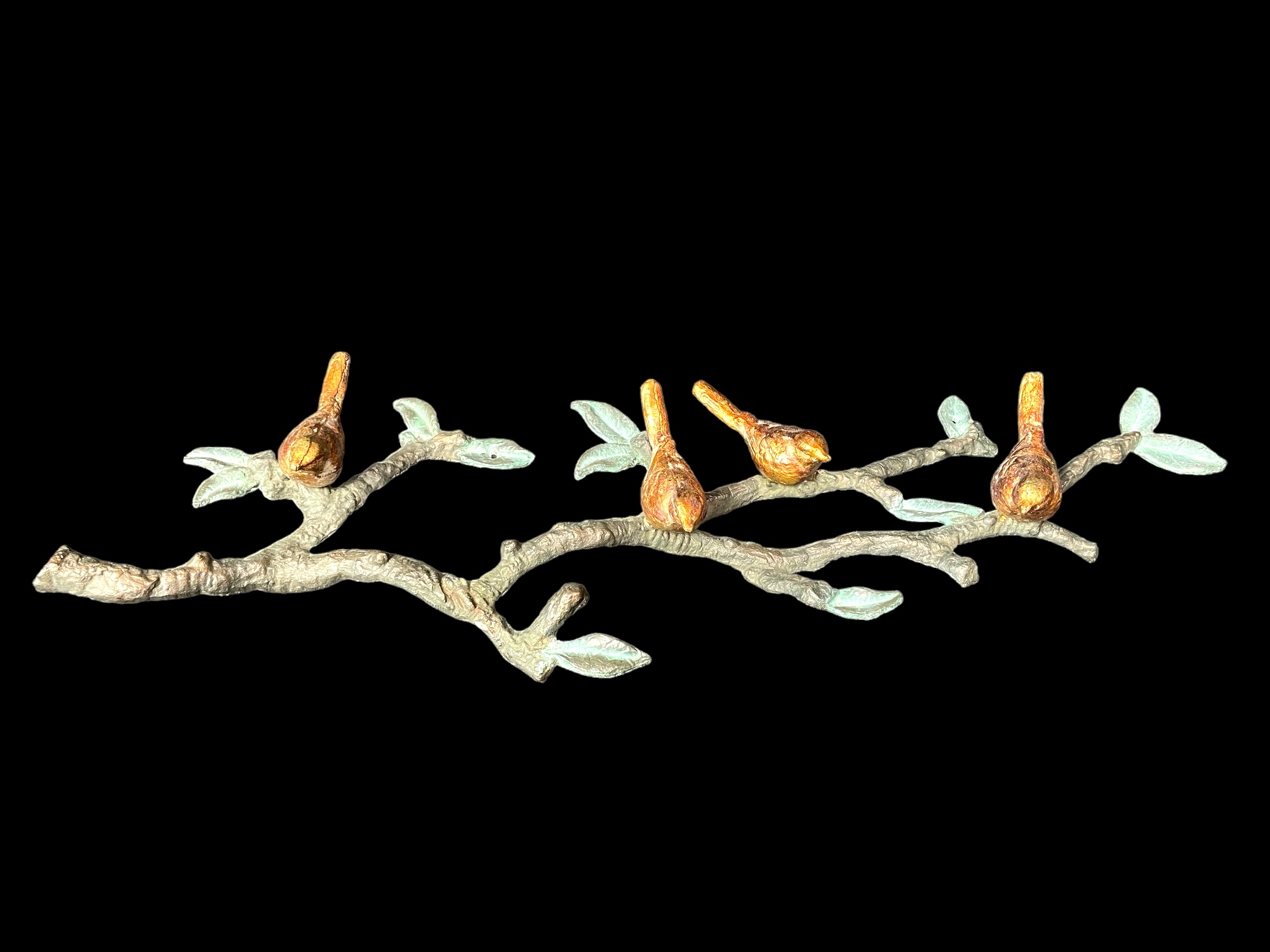Cast iron hand painted tree relief with golden birds & verdigris leaves