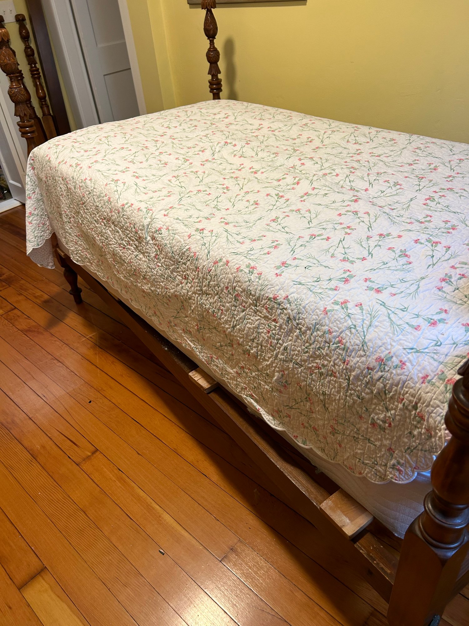 One bed is dis assembled and does not have any mattress and is missing the footboard piece