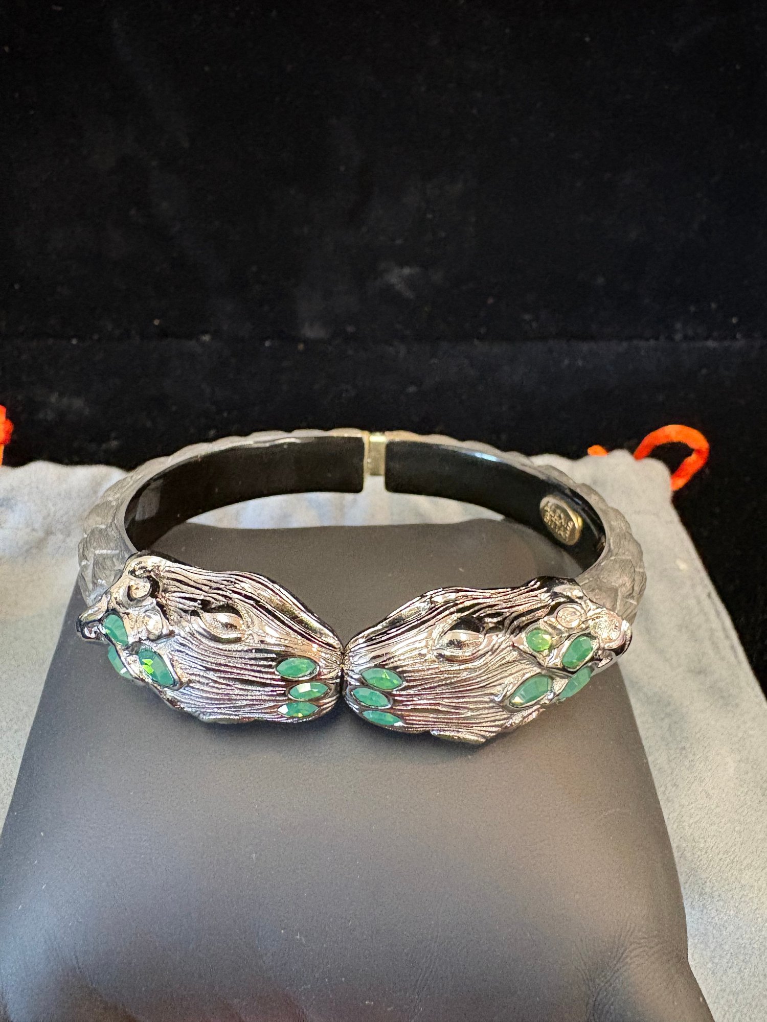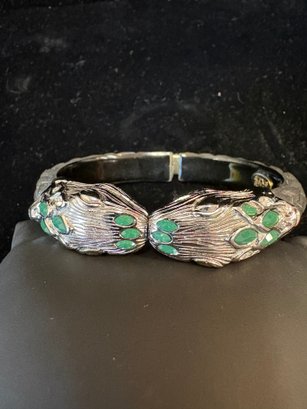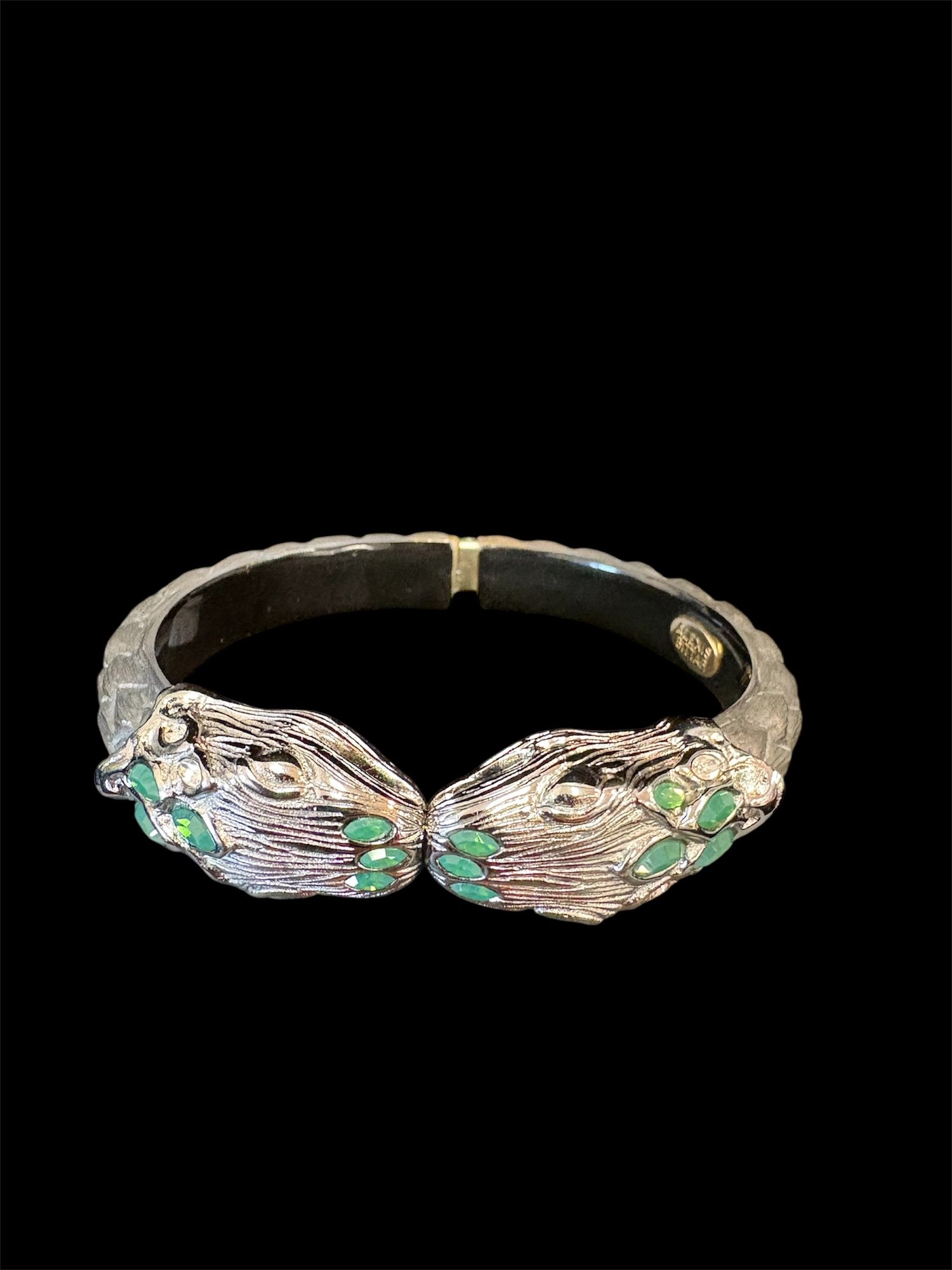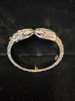 Design: A hinged "clamper" style bangle featuring two figural snake heads meeting at the center.