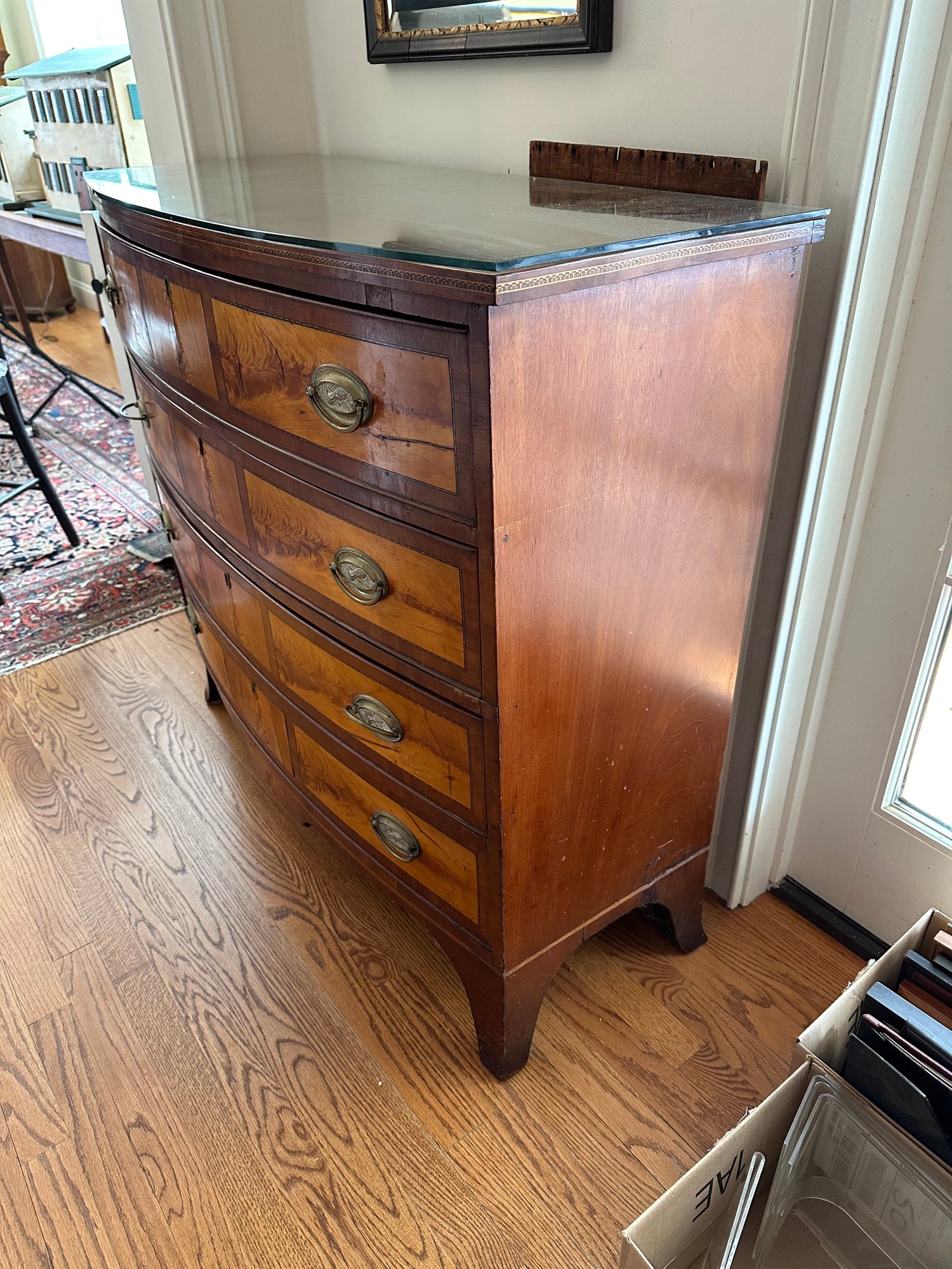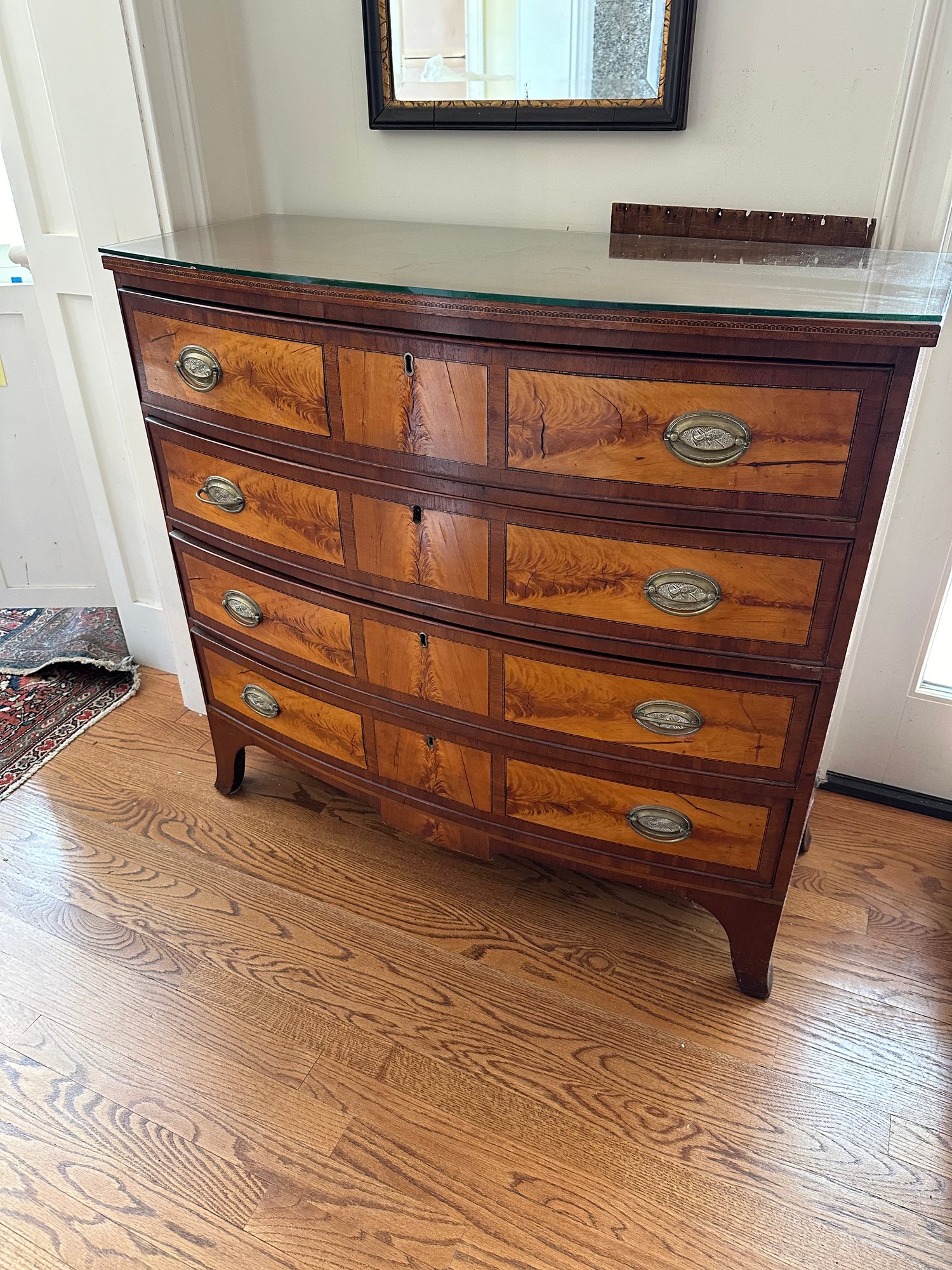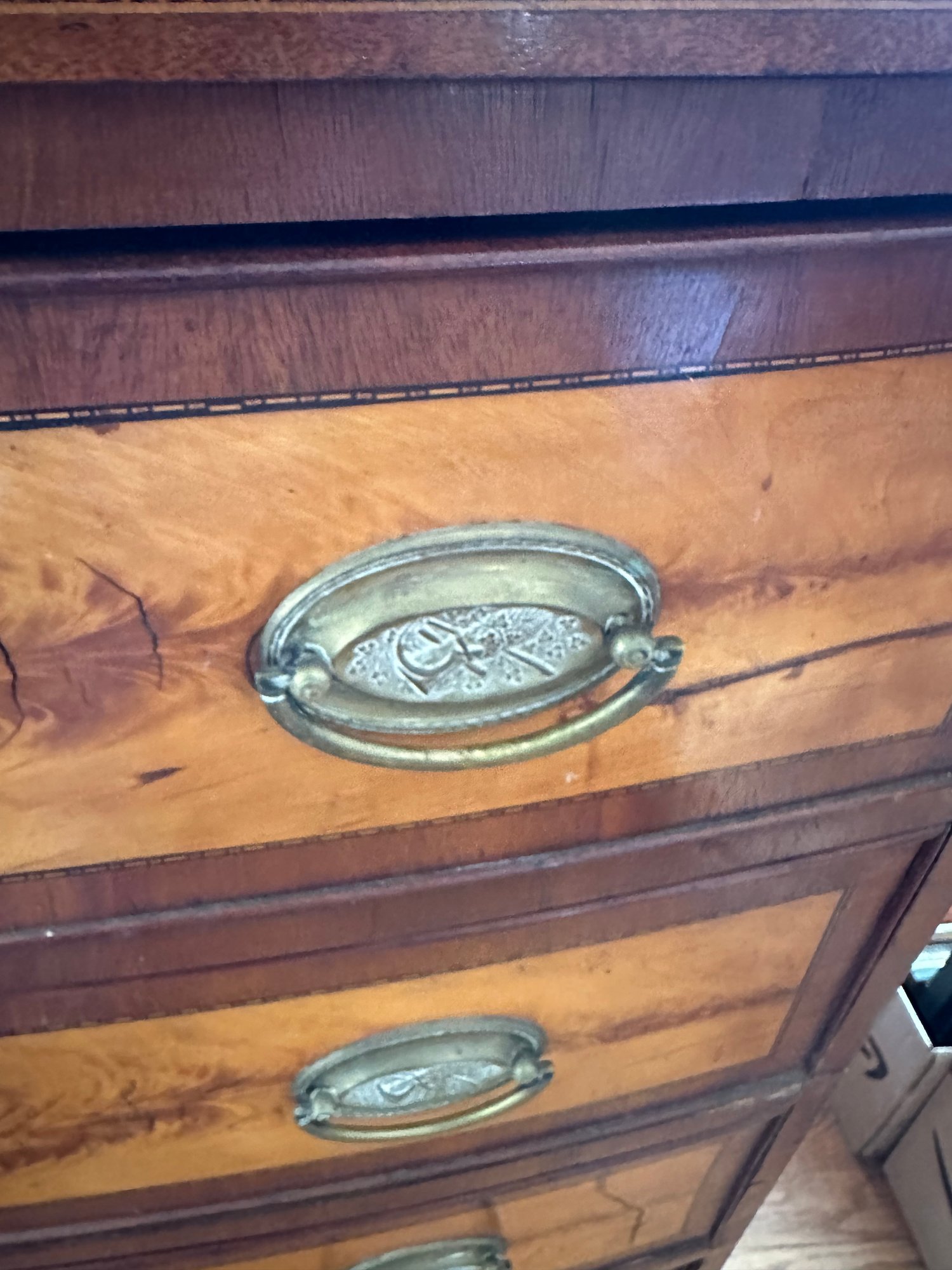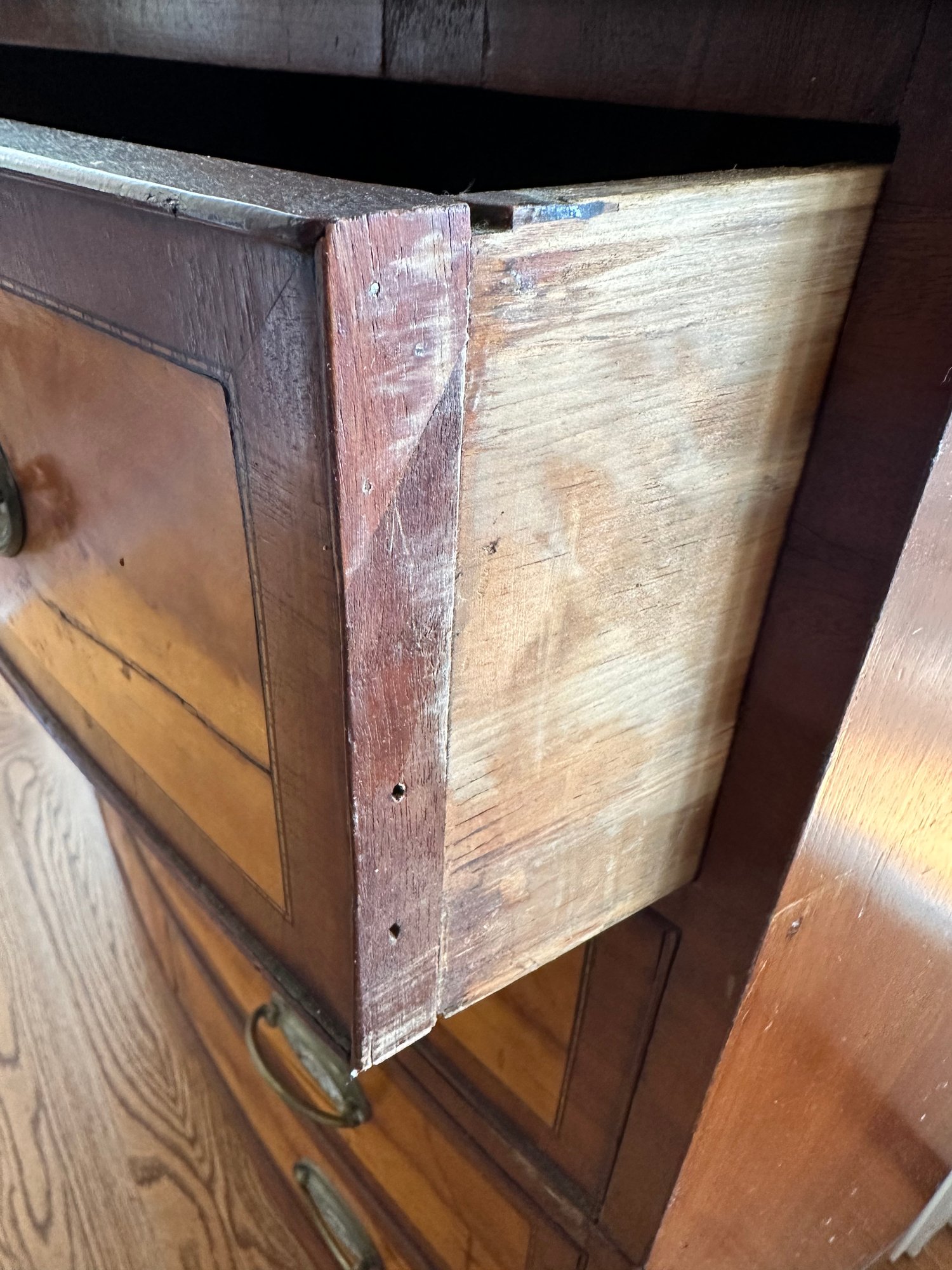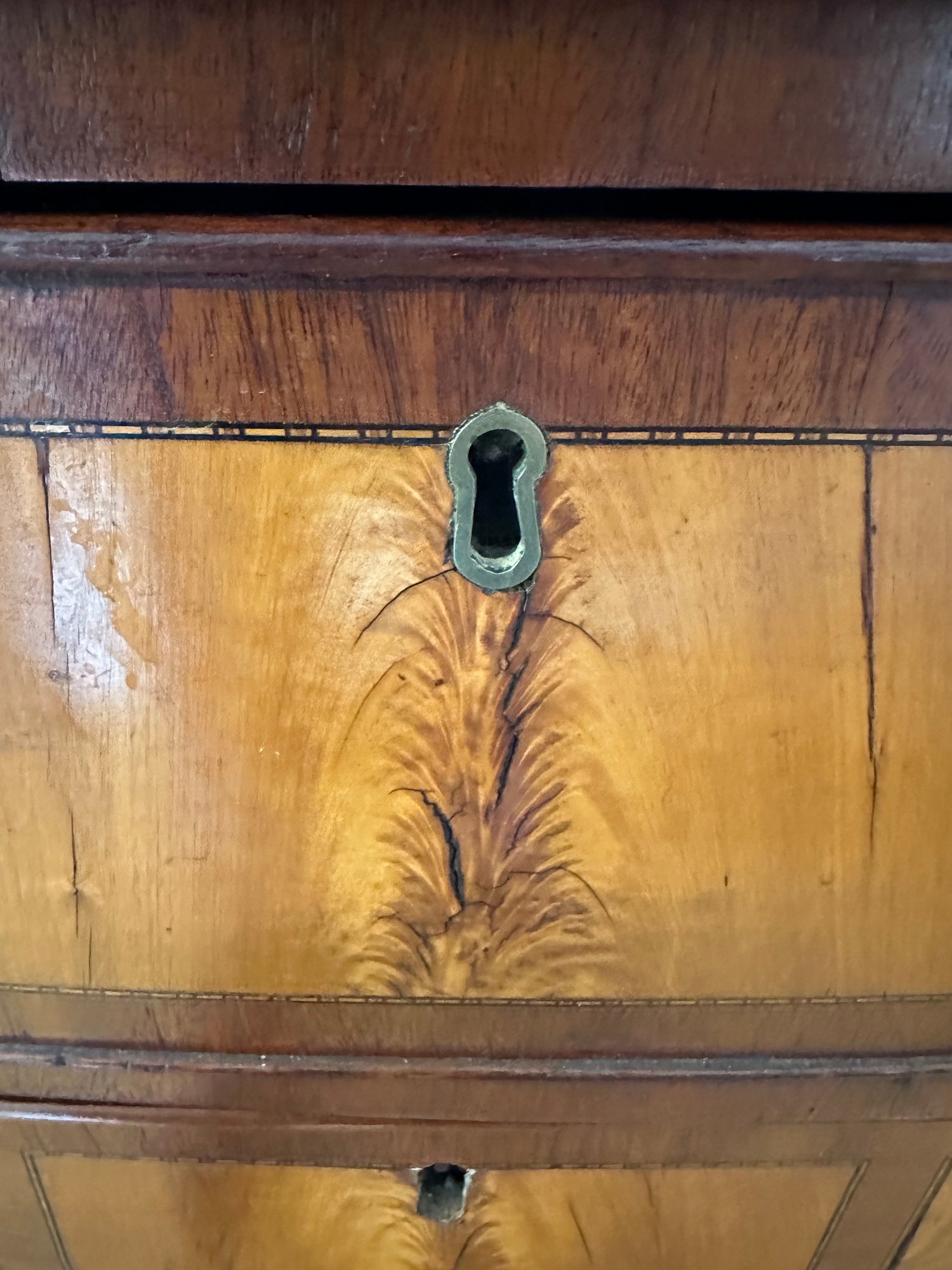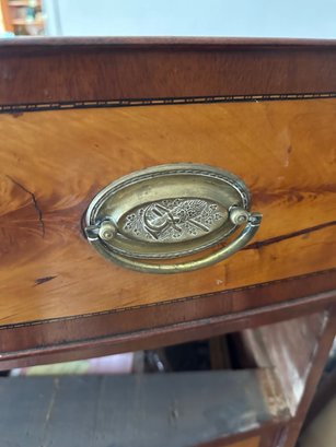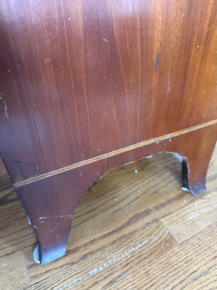 Mahogany satinwood facing to the drawers. French splayed bracket feet Needs one of the boards in back to be places back see picture. May have been reduced in depth at some point.