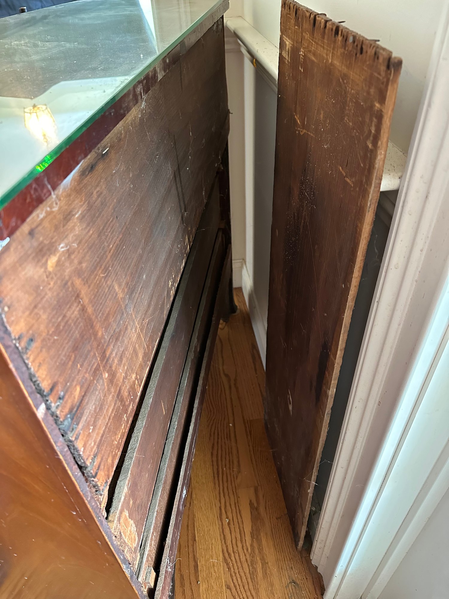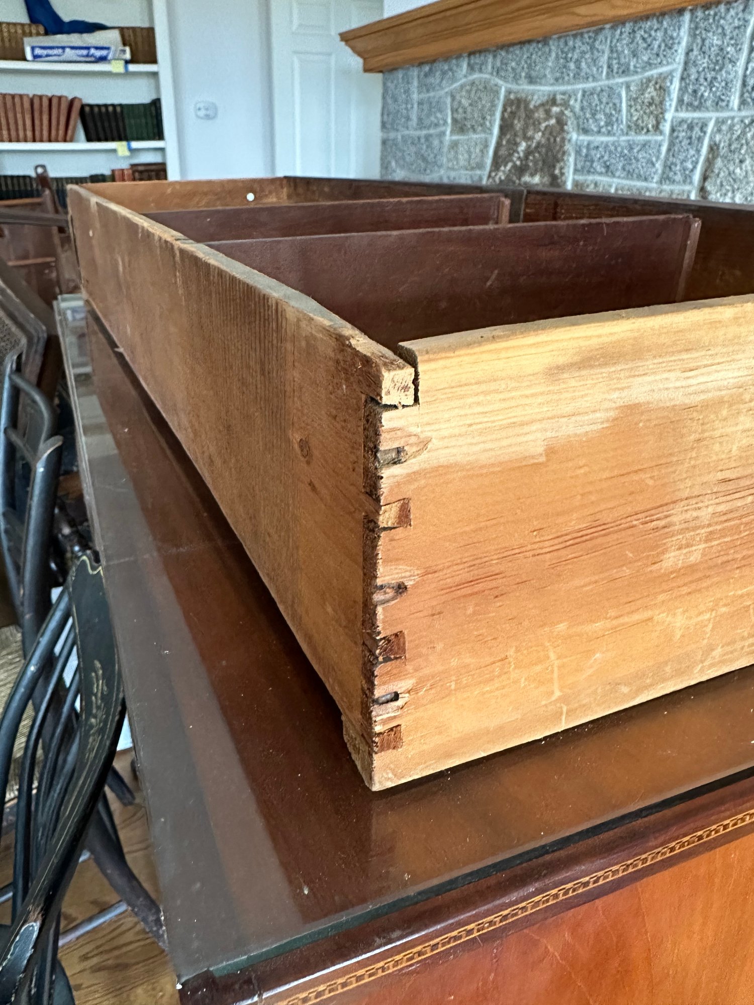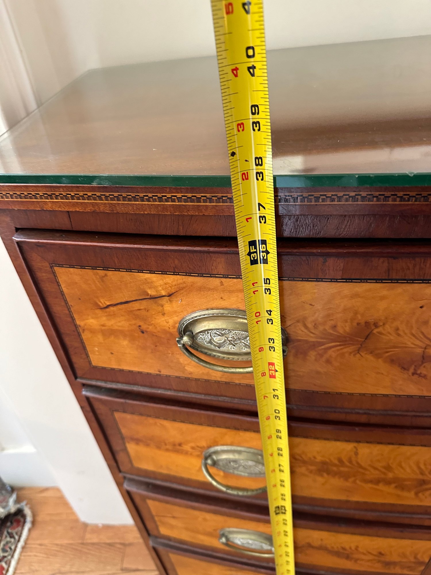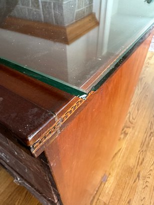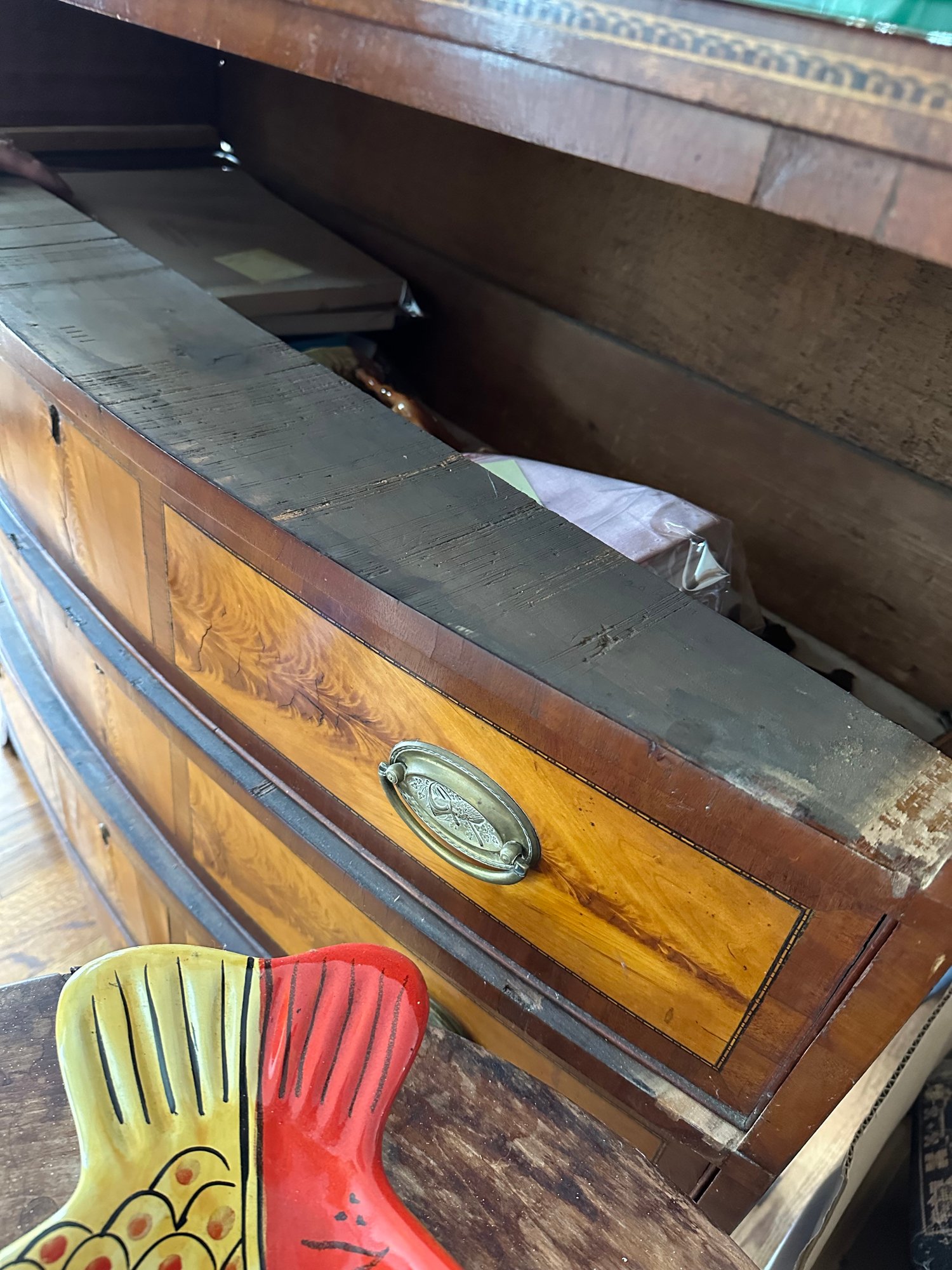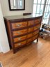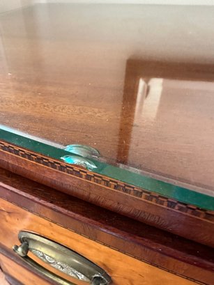 Mahogany satinwood facing to the drawers. French splayed bracket feet Needs one of the boards in back to be places back see picture. May have been reduced in depth at some point.