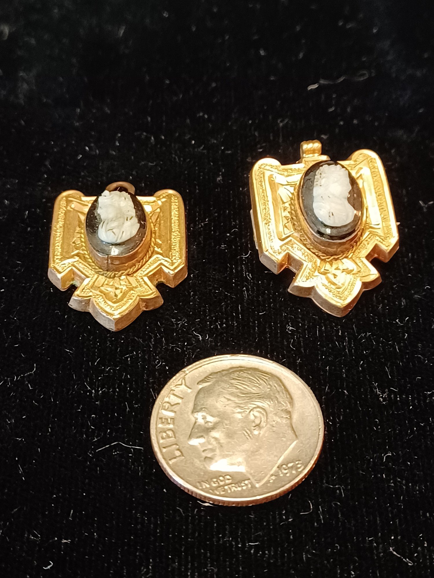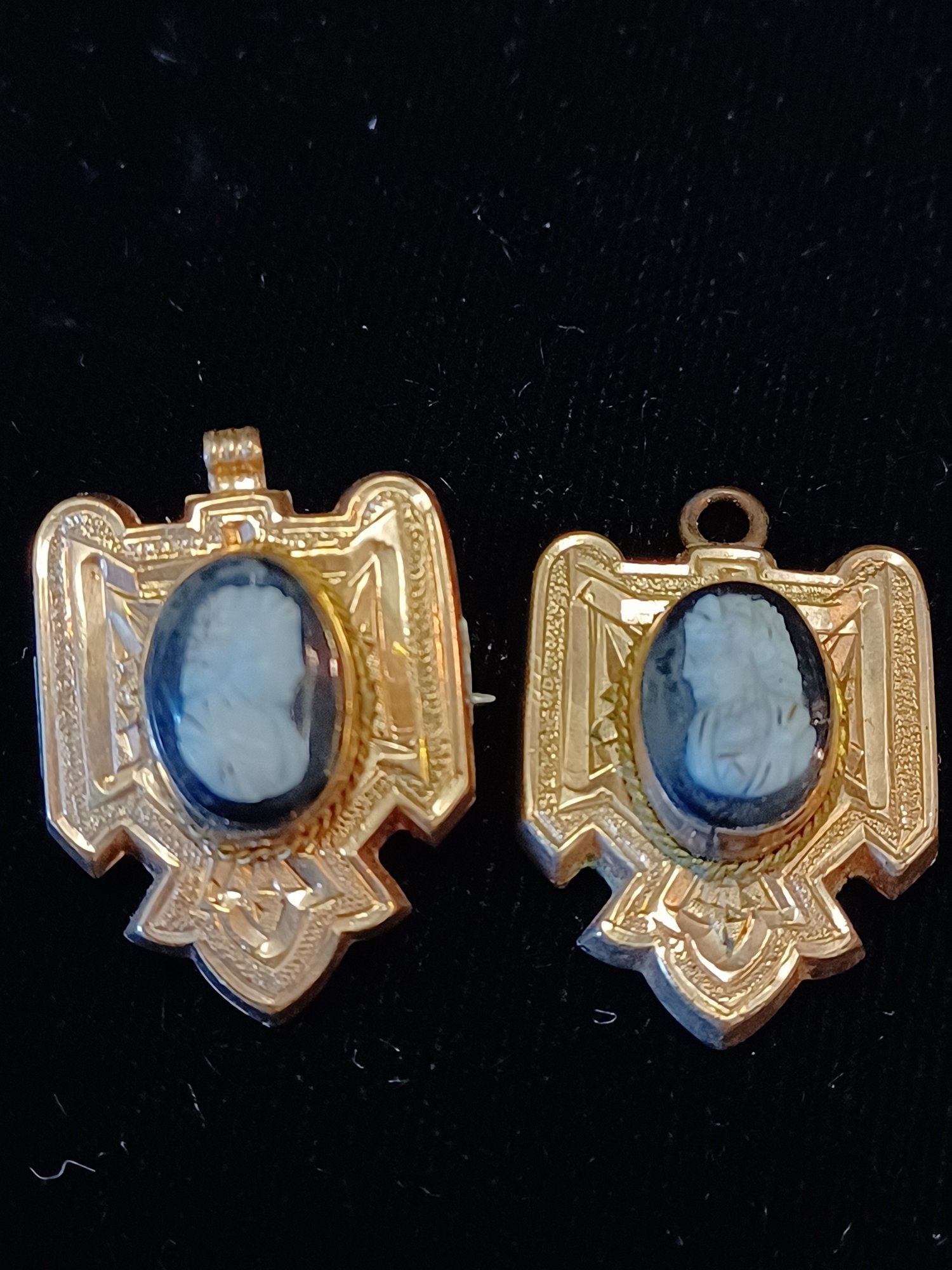 * white carved cameos; male and female; on black stone, possibly onyx