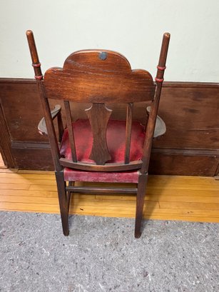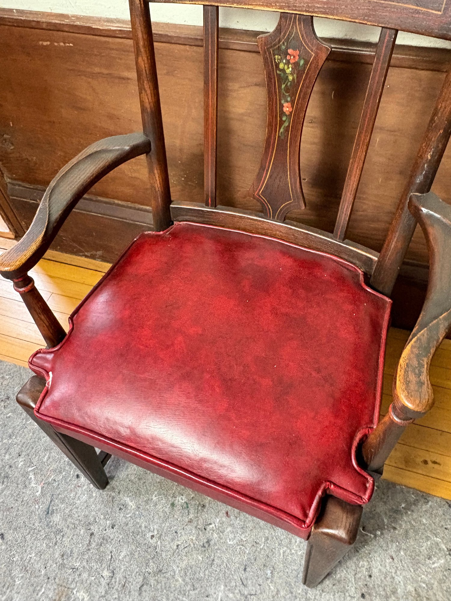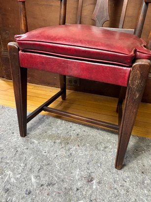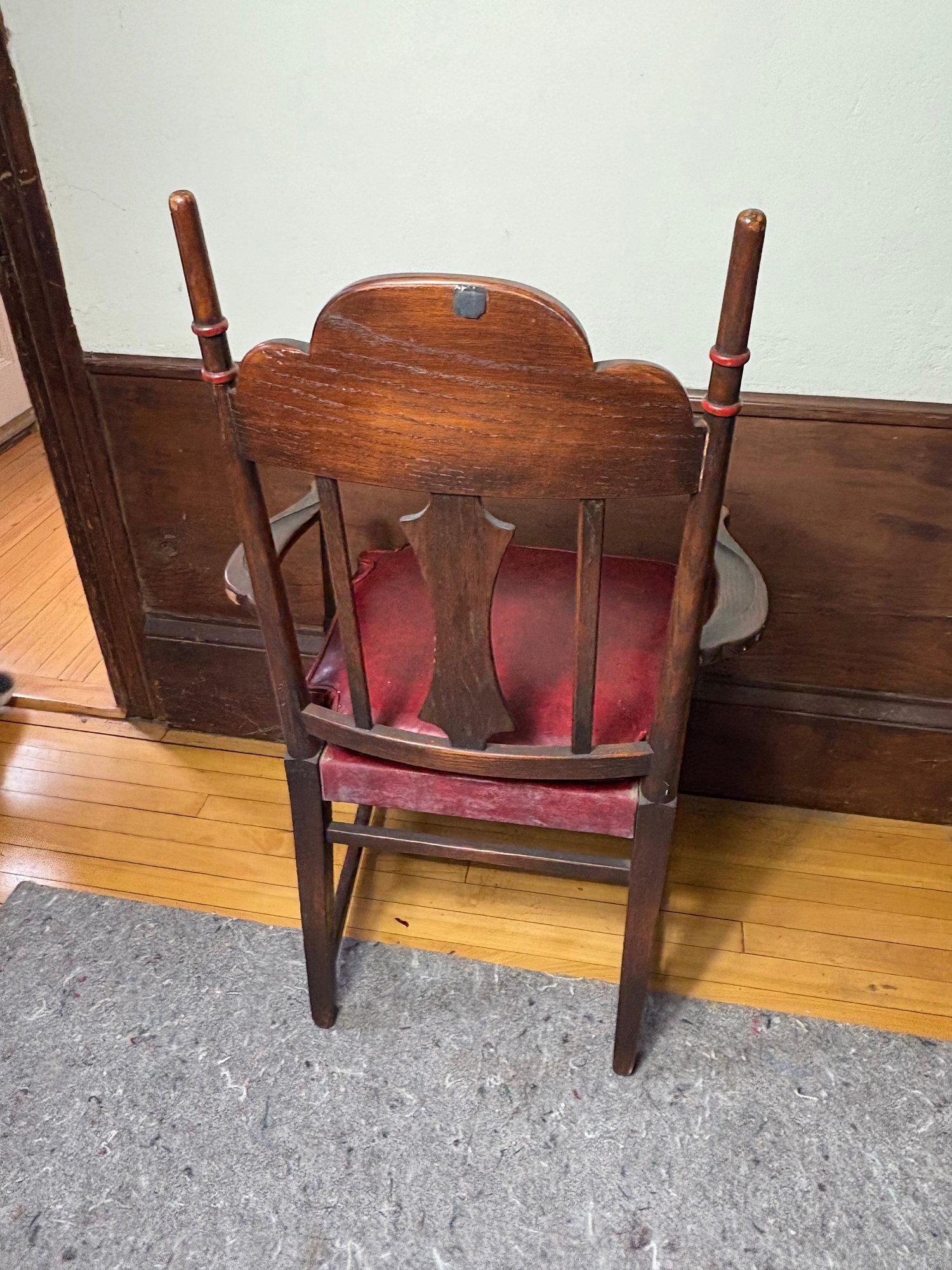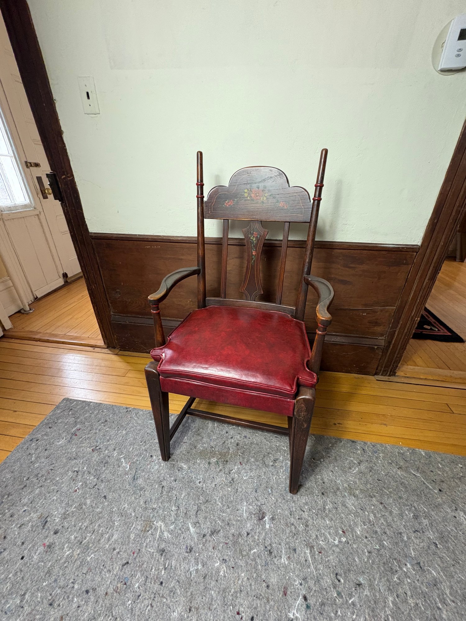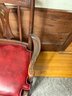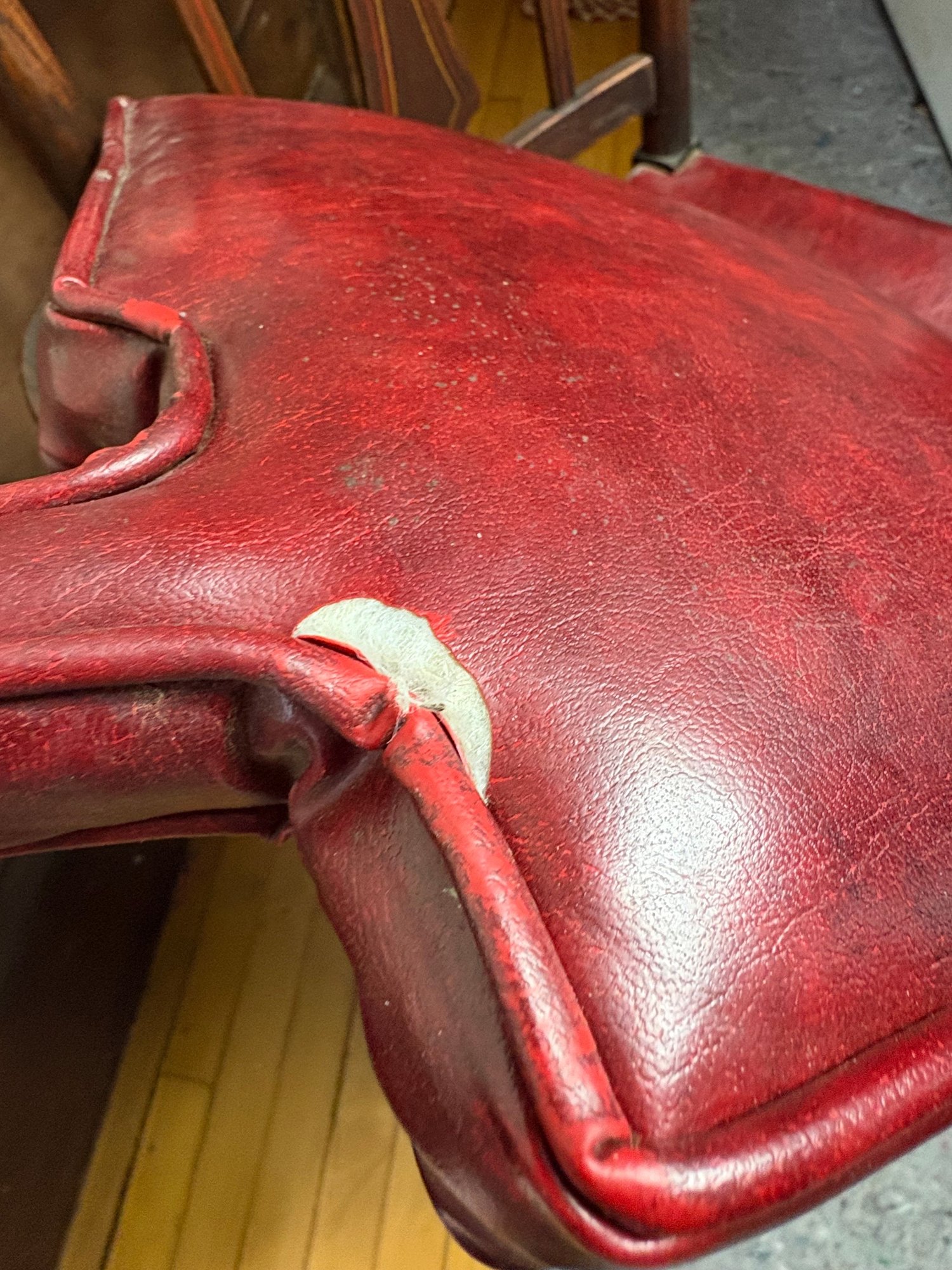 Approximately 23 by 22 by 42 inches tall. Chair has some wear and tear to it.