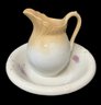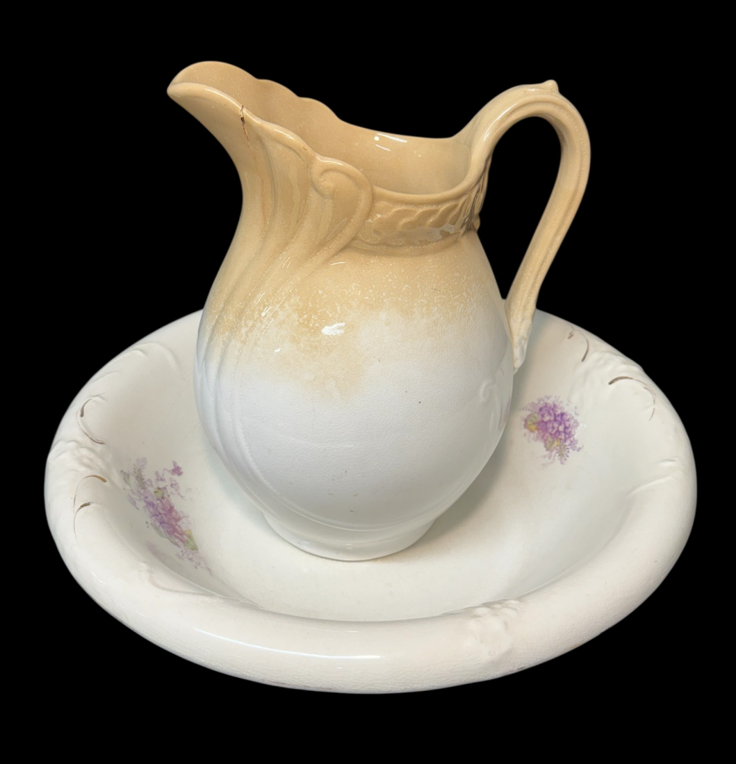pitcher has a crack in the rim, basin has a chip on the bottom