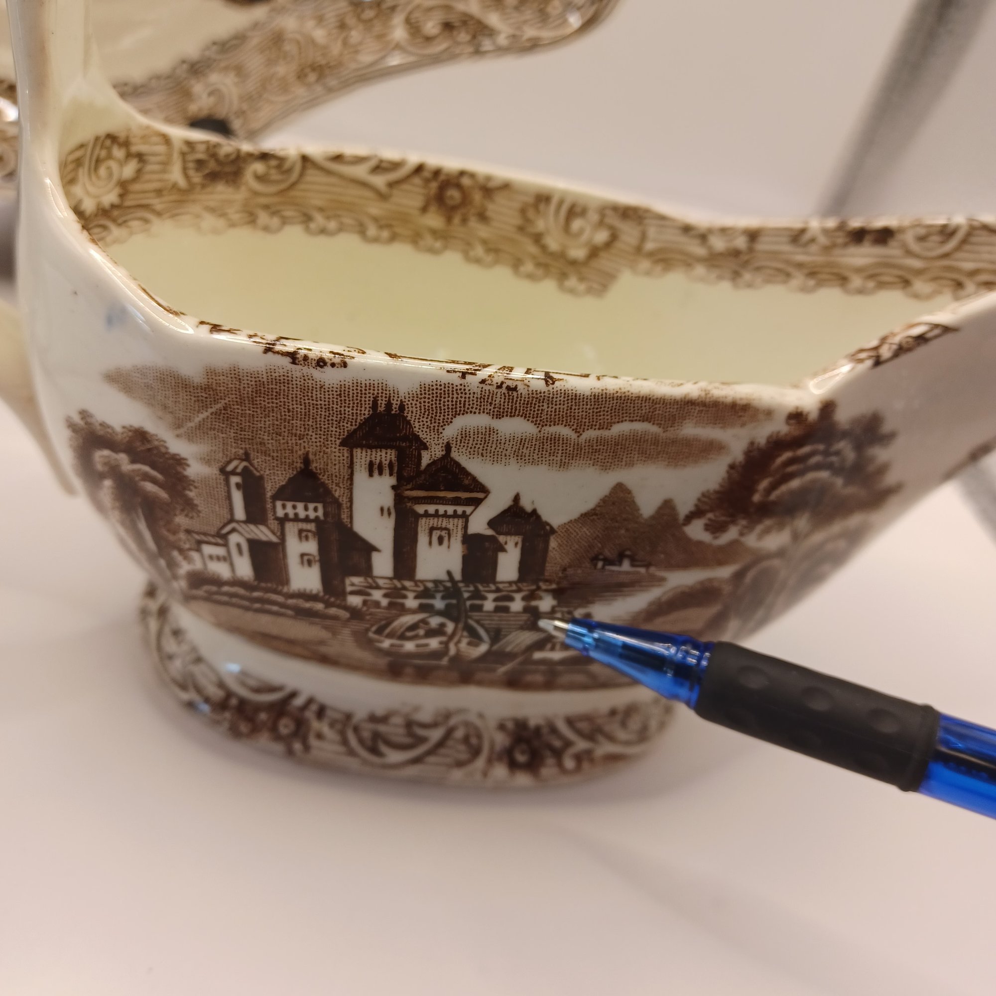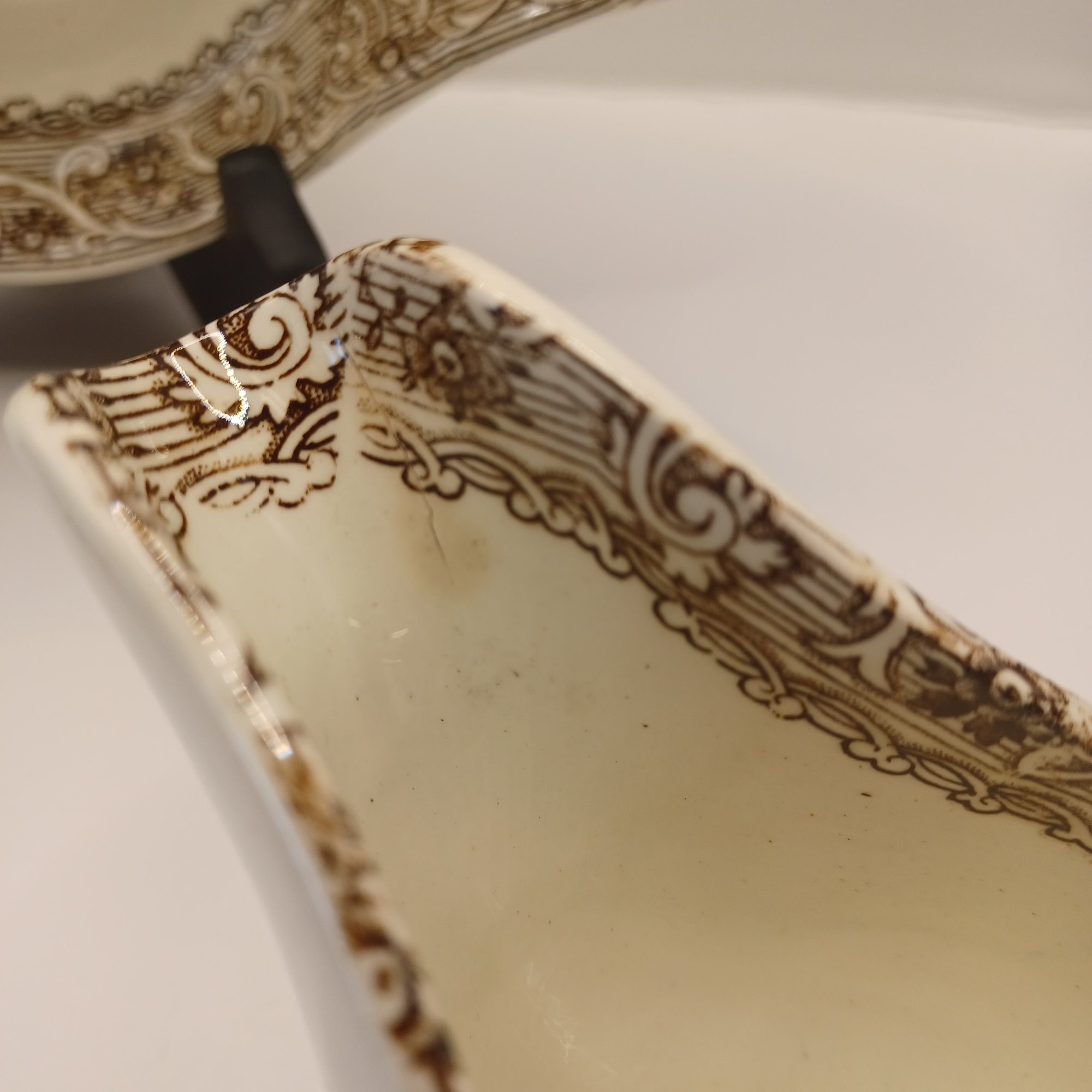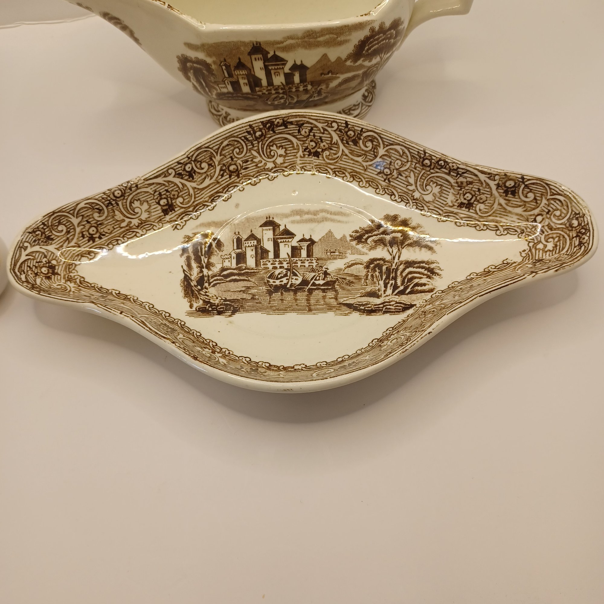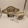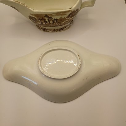 Notes: Some chips and small crack in gravy boat; some blue ink defects under glaze