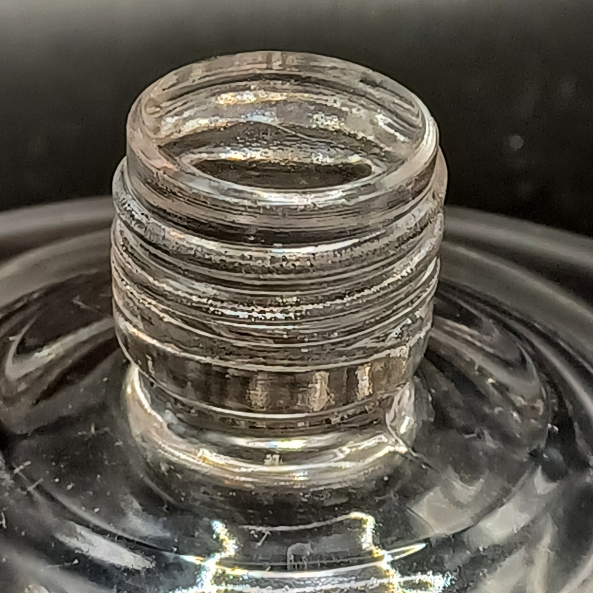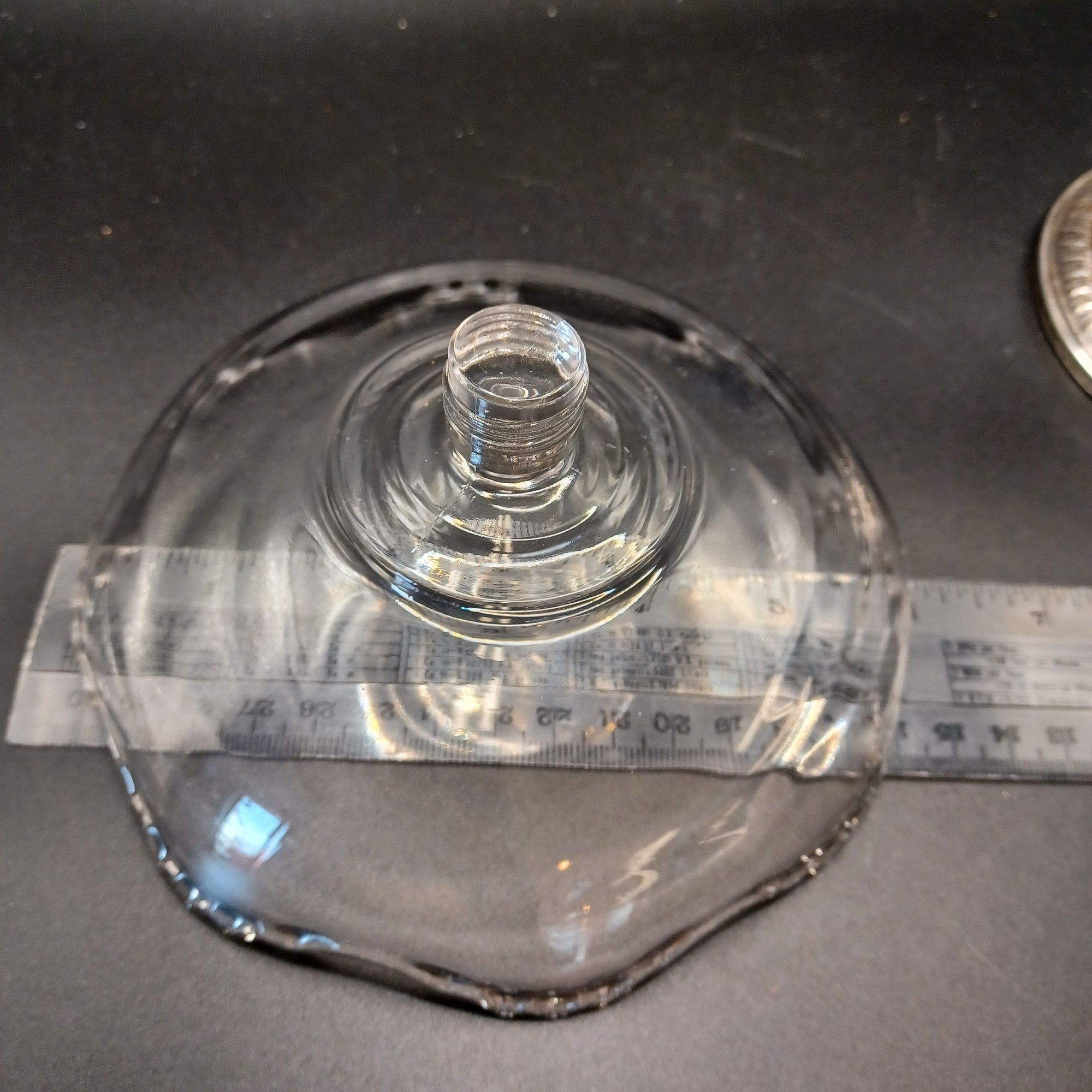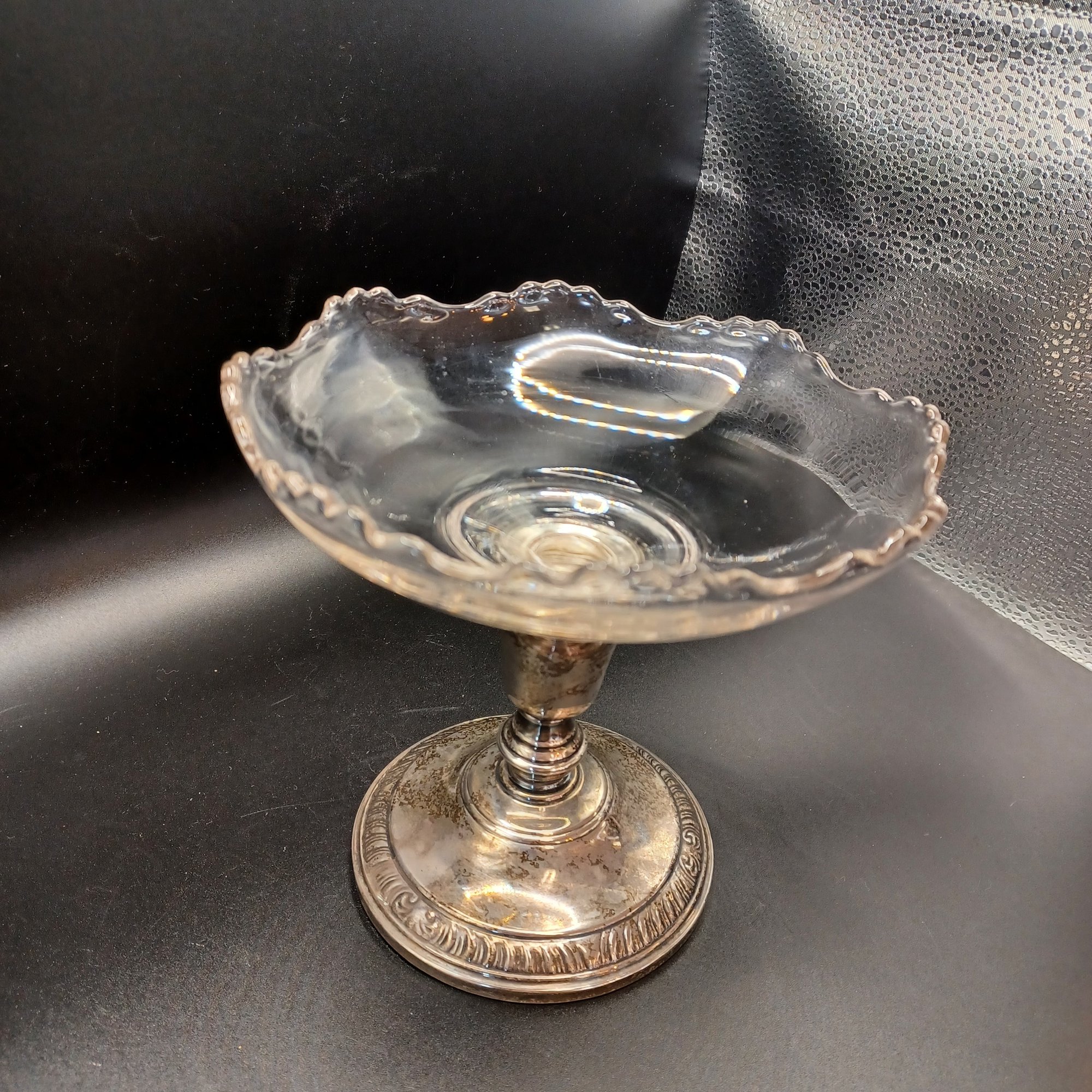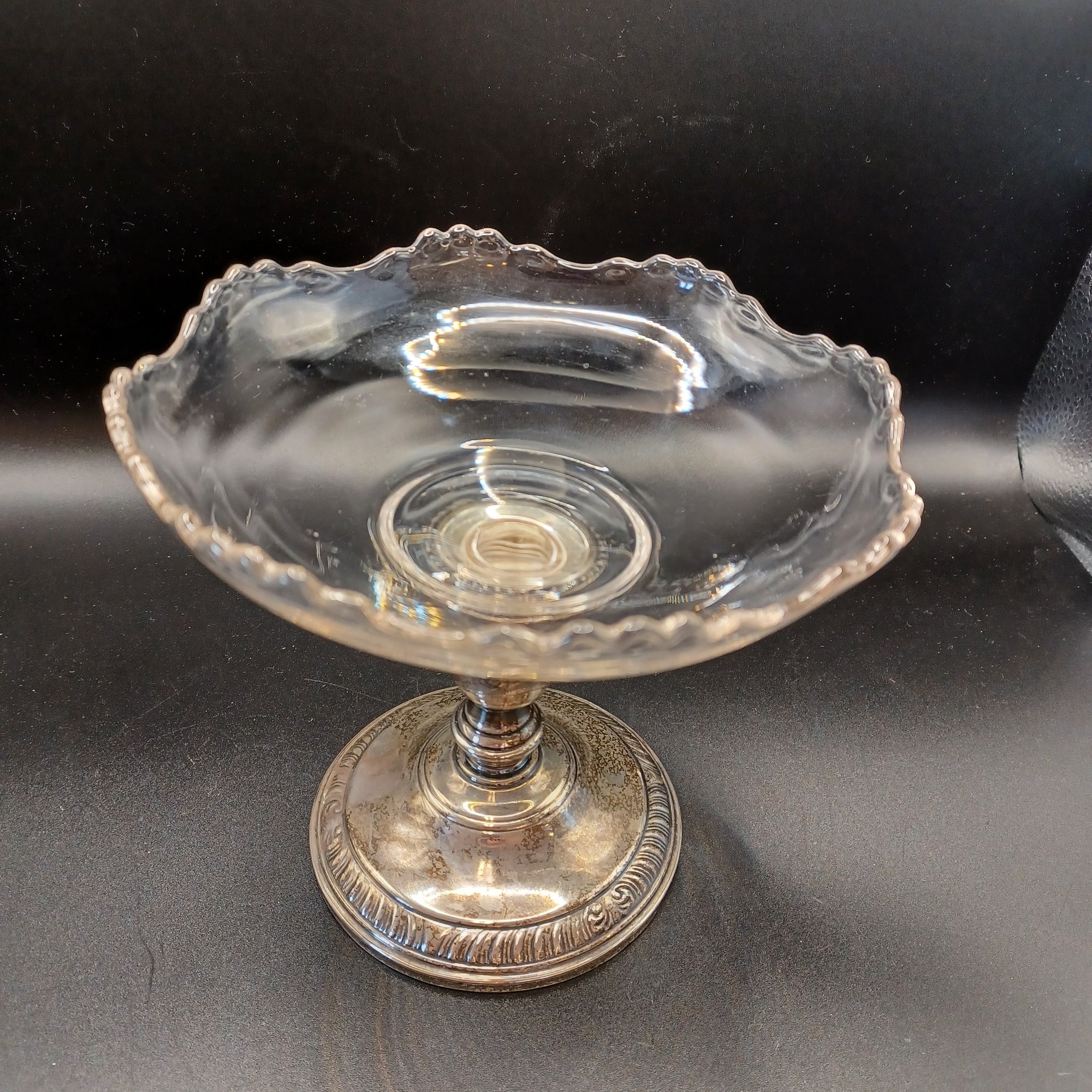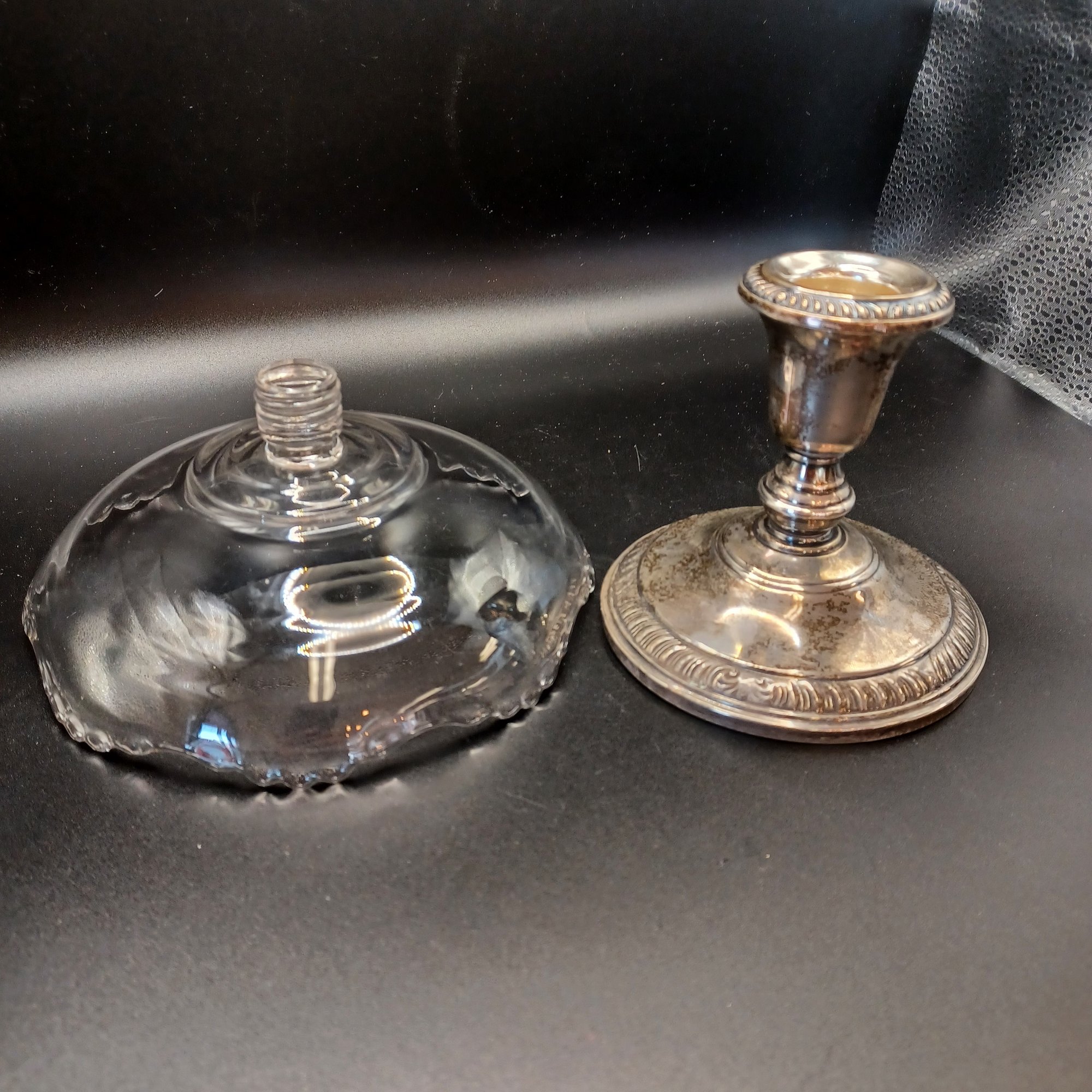 Glass dish screws into silver base; base looks like a candle stick retrofitted with a threaded insert for the dish
