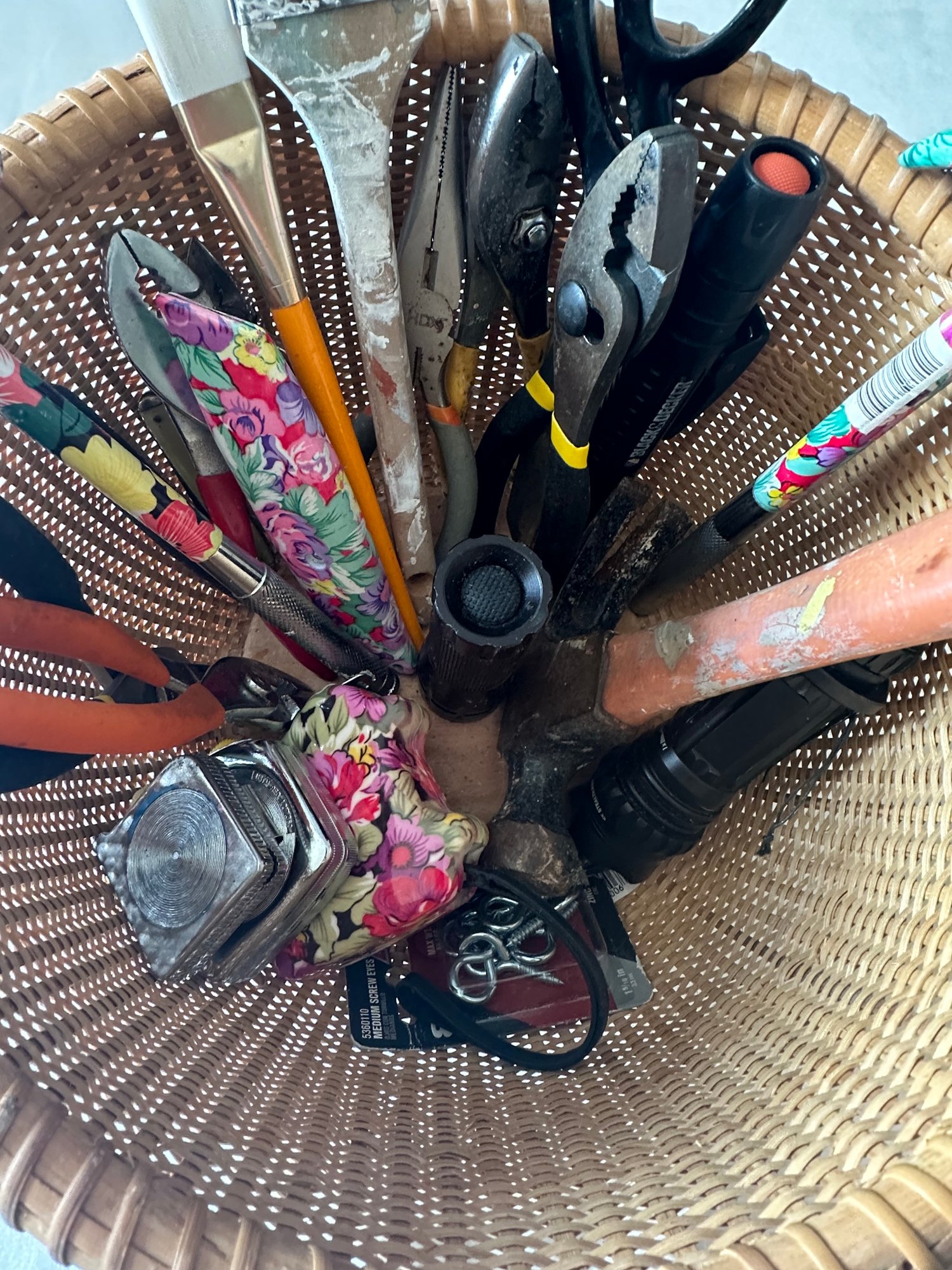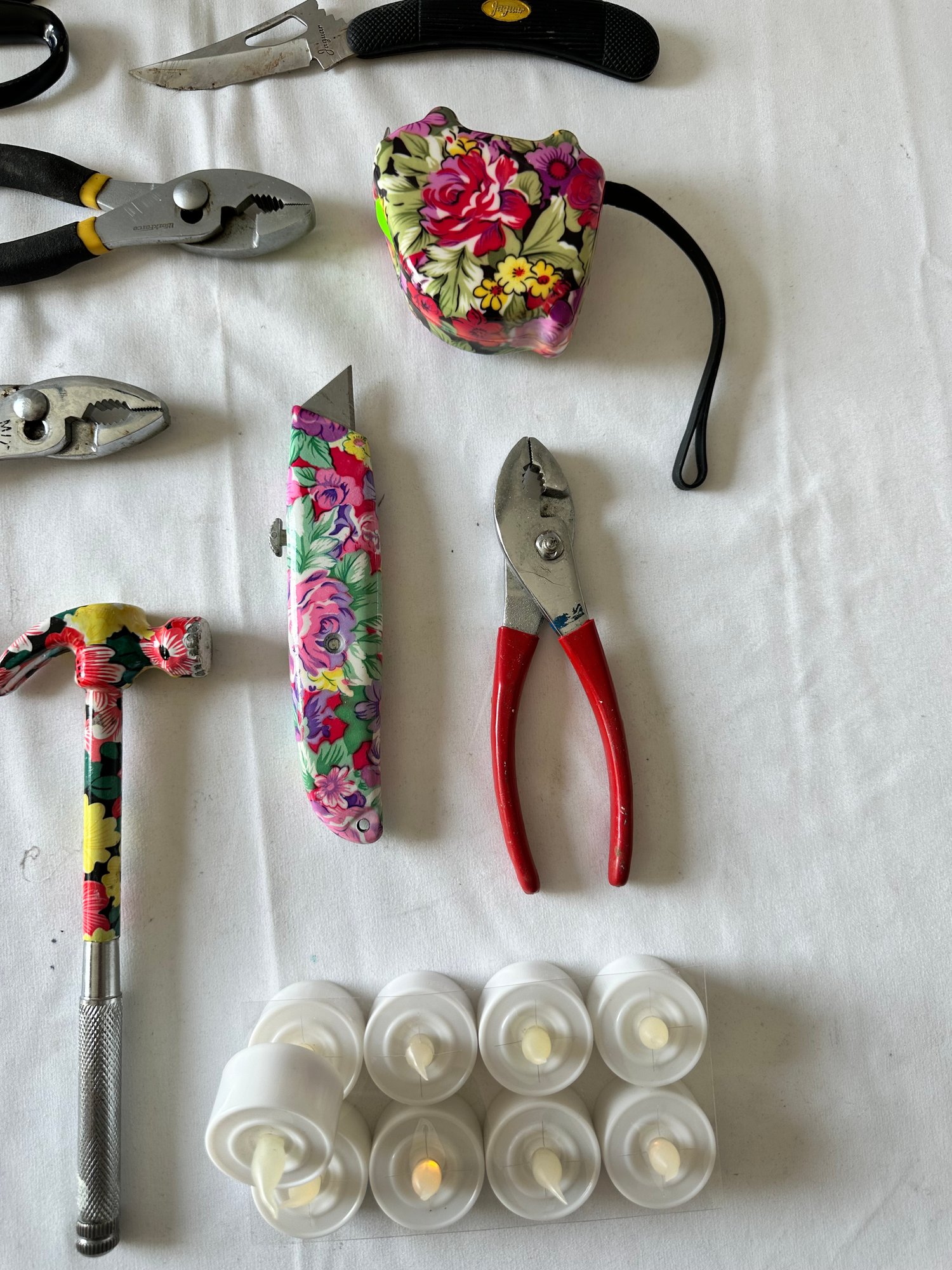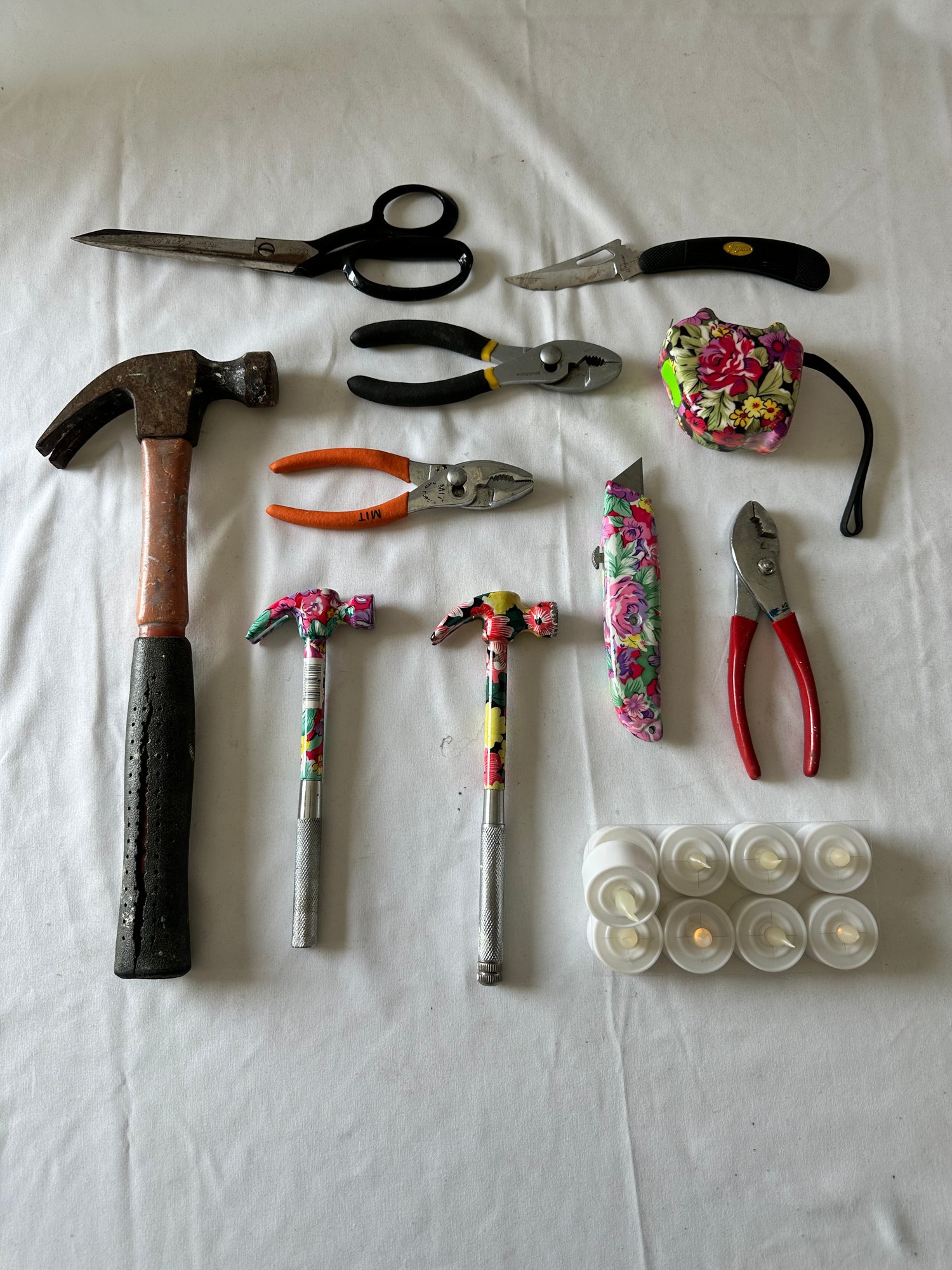 Scissors, measuring tape, pliers, flashlights, candles, hammers