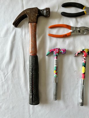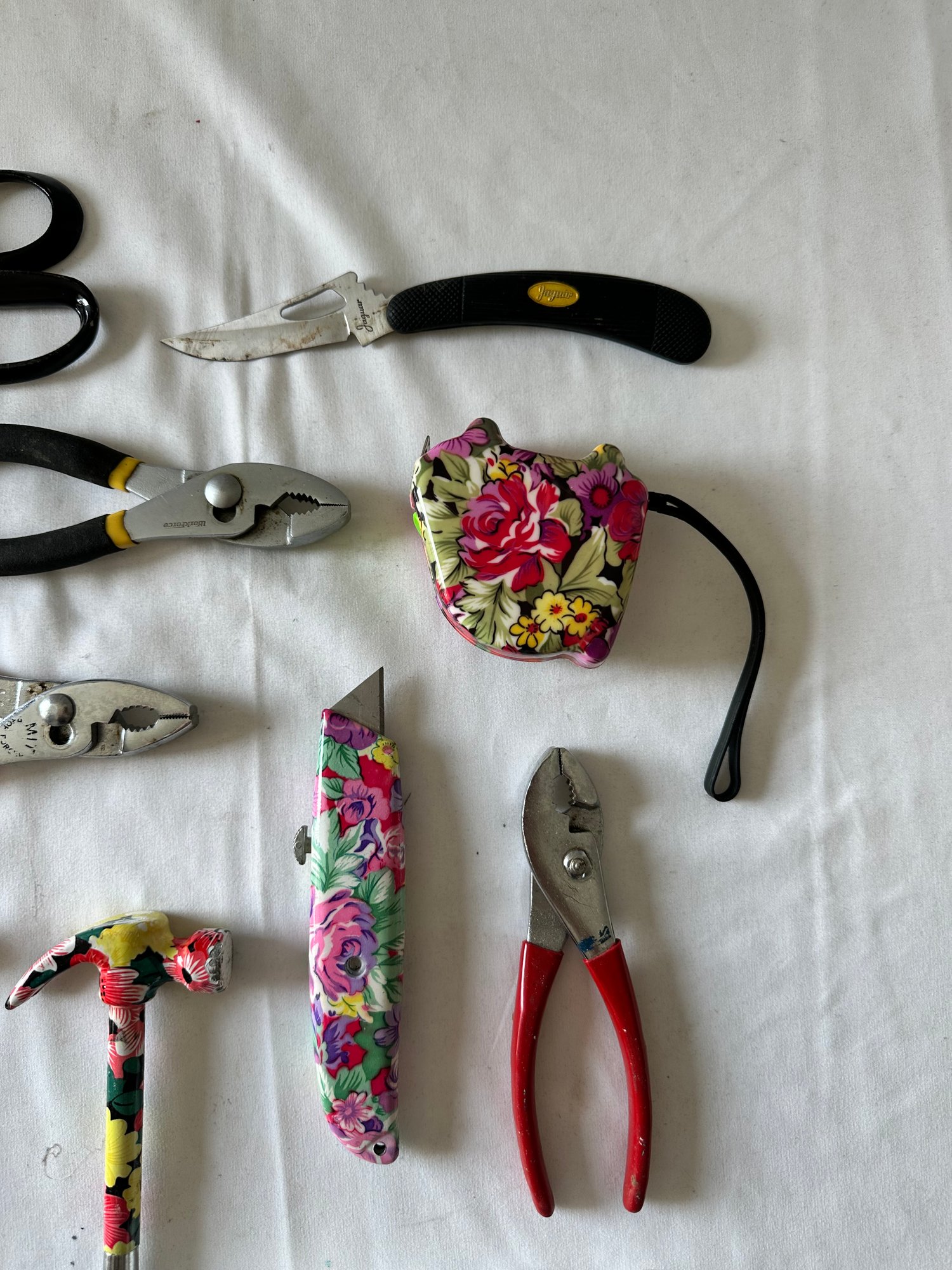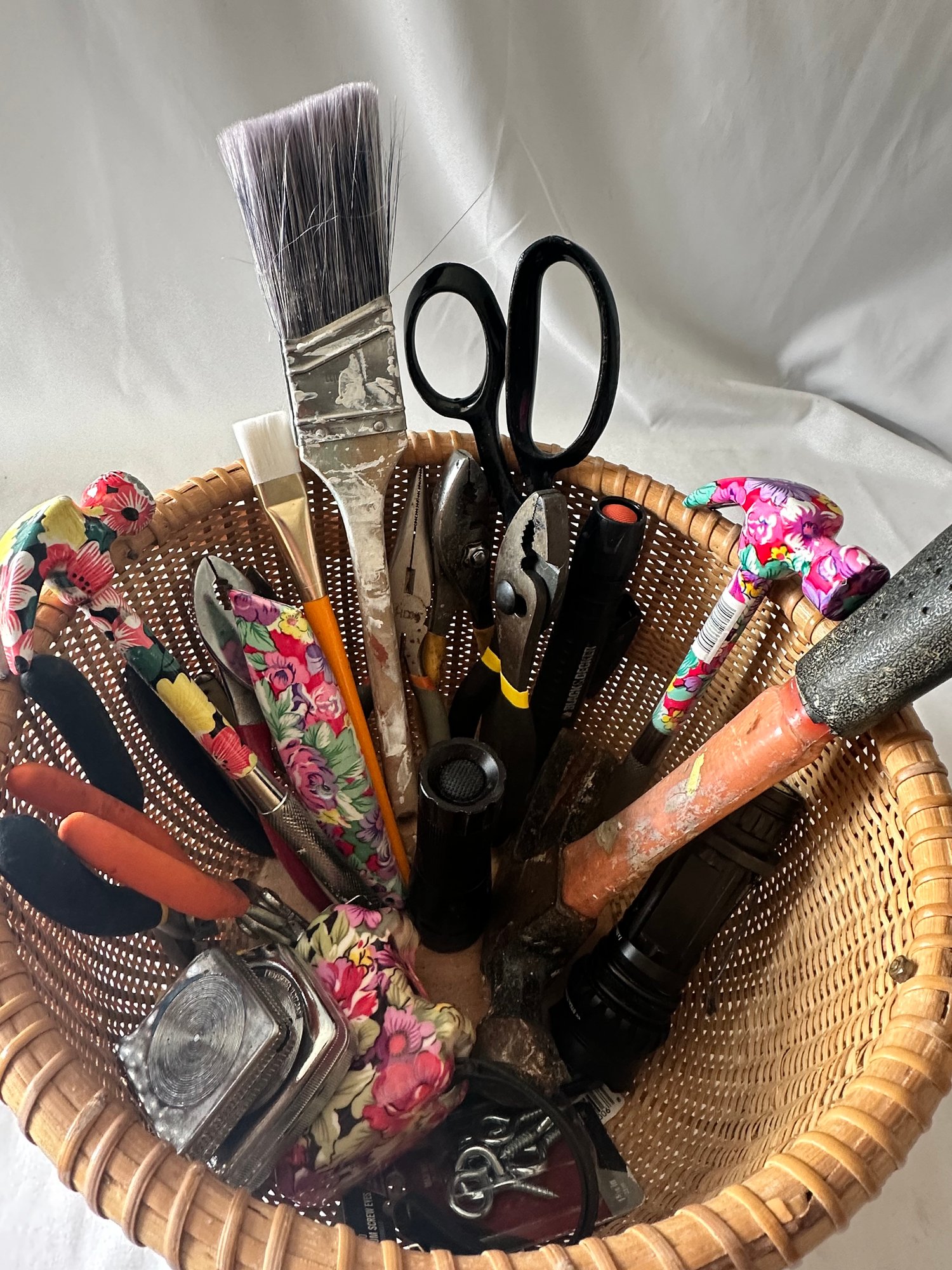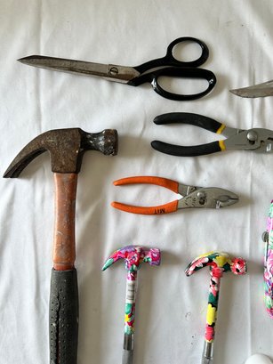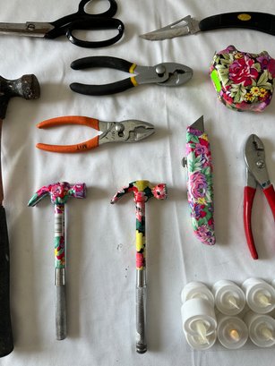 Scissors, measuring tape, pliers, flashlights, candles, hammers