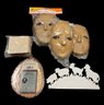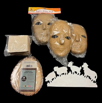 includes three masks, wooden coasters, a wooden farm scene & a wooden log piece